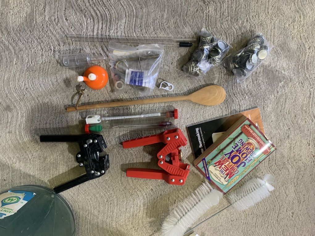 VenmoMost everything you need to start brewing. Carboy Carboy caps Fermentation lock Bucket Hydrometer Thermometer Bottle cleaning stuff Bottle caps Two cappers Charlie Papzian’s brew guide