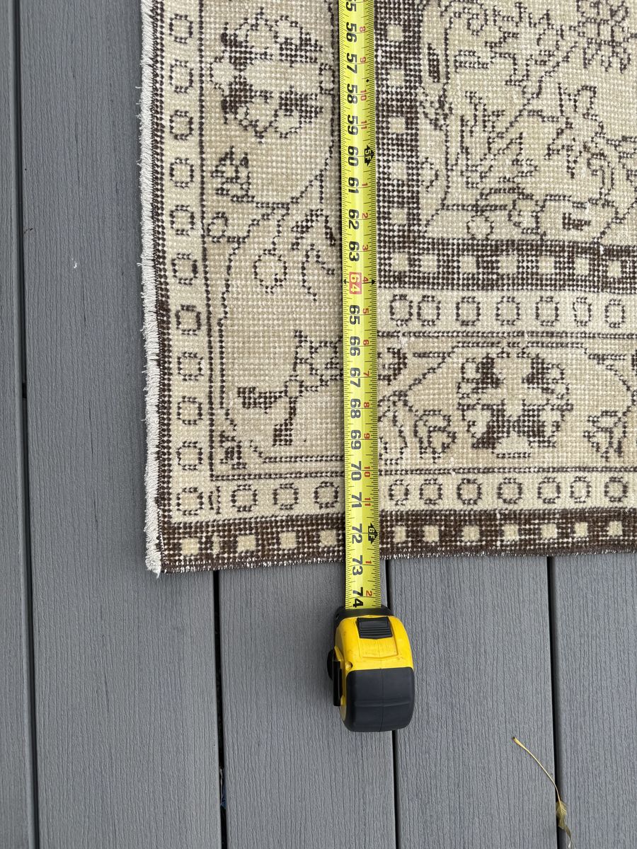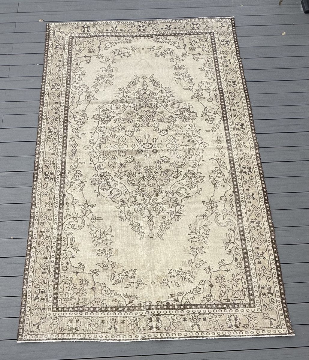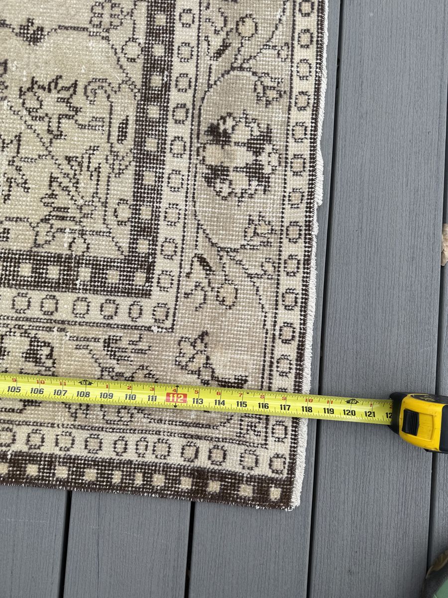Beautiful brown + tan tones with that classic woven Turkish pattern rug. I purchased it new and decided I want a darker brown.