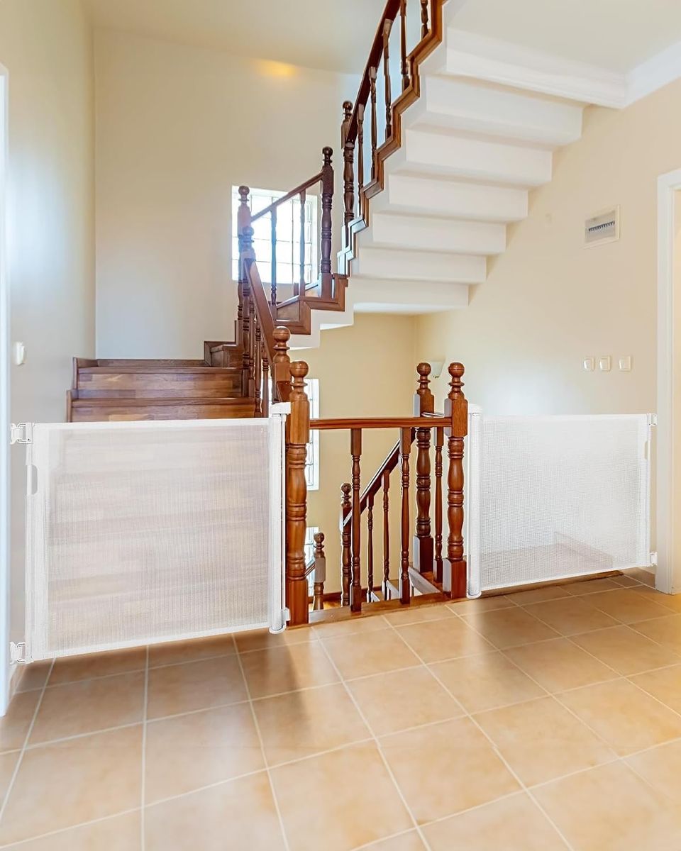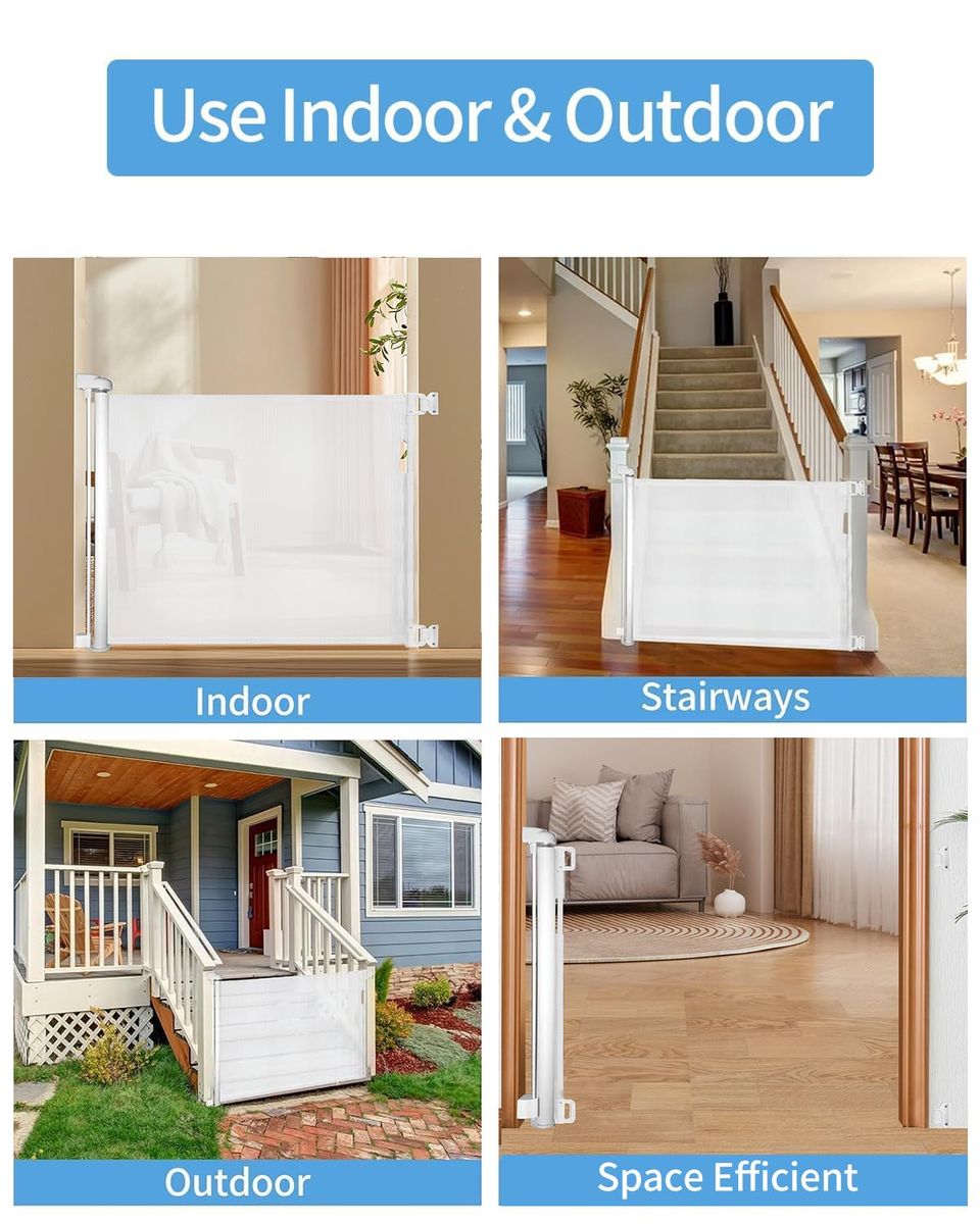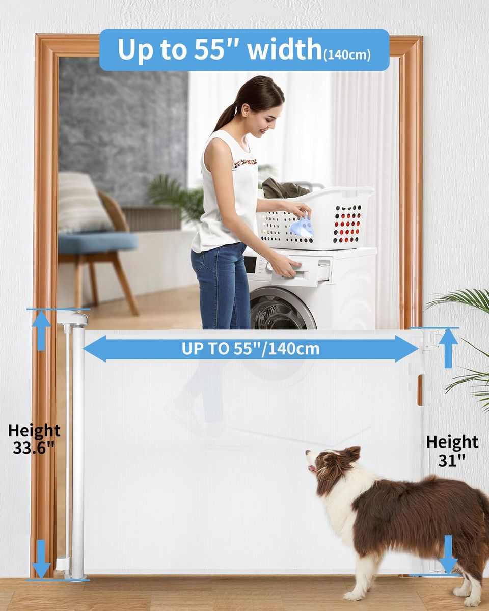 About this item - Superior Design for Maximum Coverage:The extra-wide, retractable mesh gate extends up to 55" wide and stands 33.6" tall, making it perfect for use in doorways, stairways, hallways, and more. The mesh retracts fully when not in use, saving space. Unlike traditional gates, this design eliminates tripping hazards with no bottom balustrade, making it safe for households with busy parents and pets.