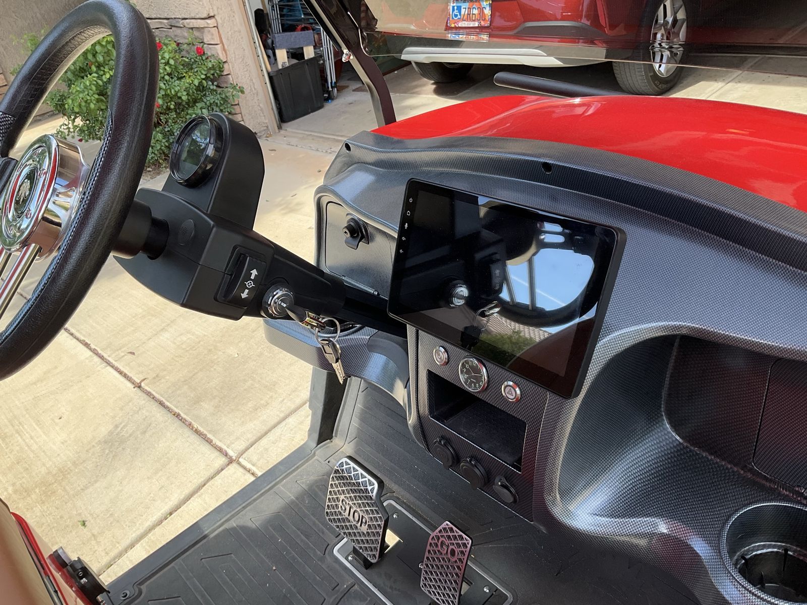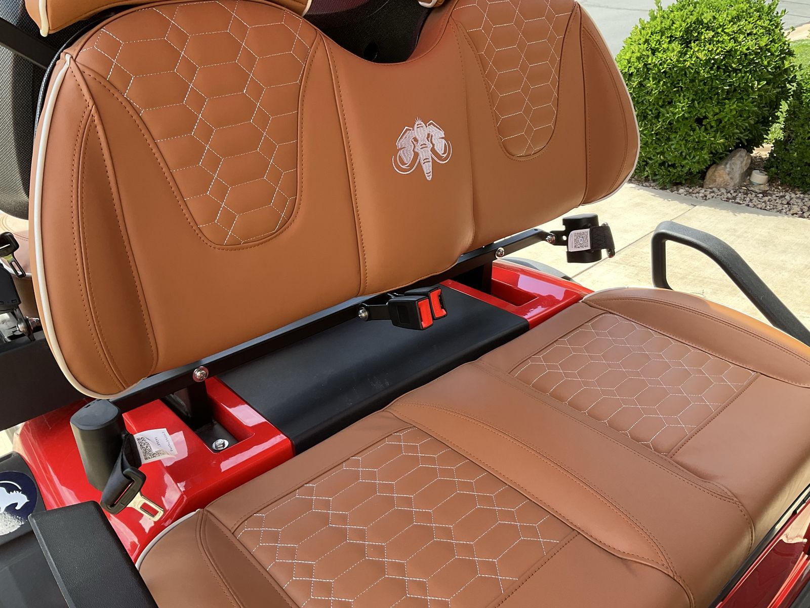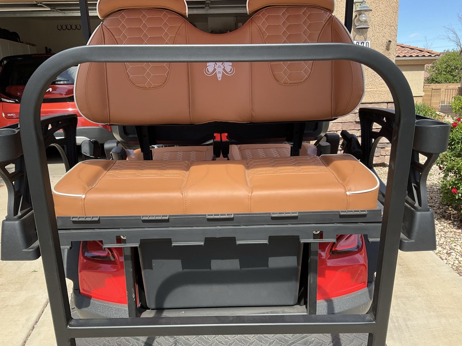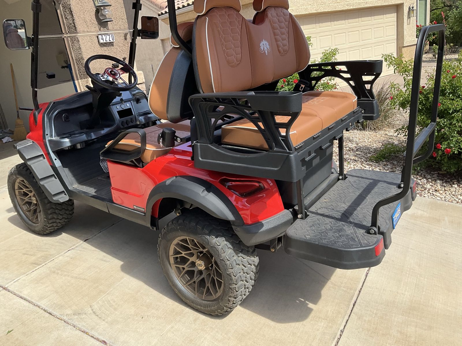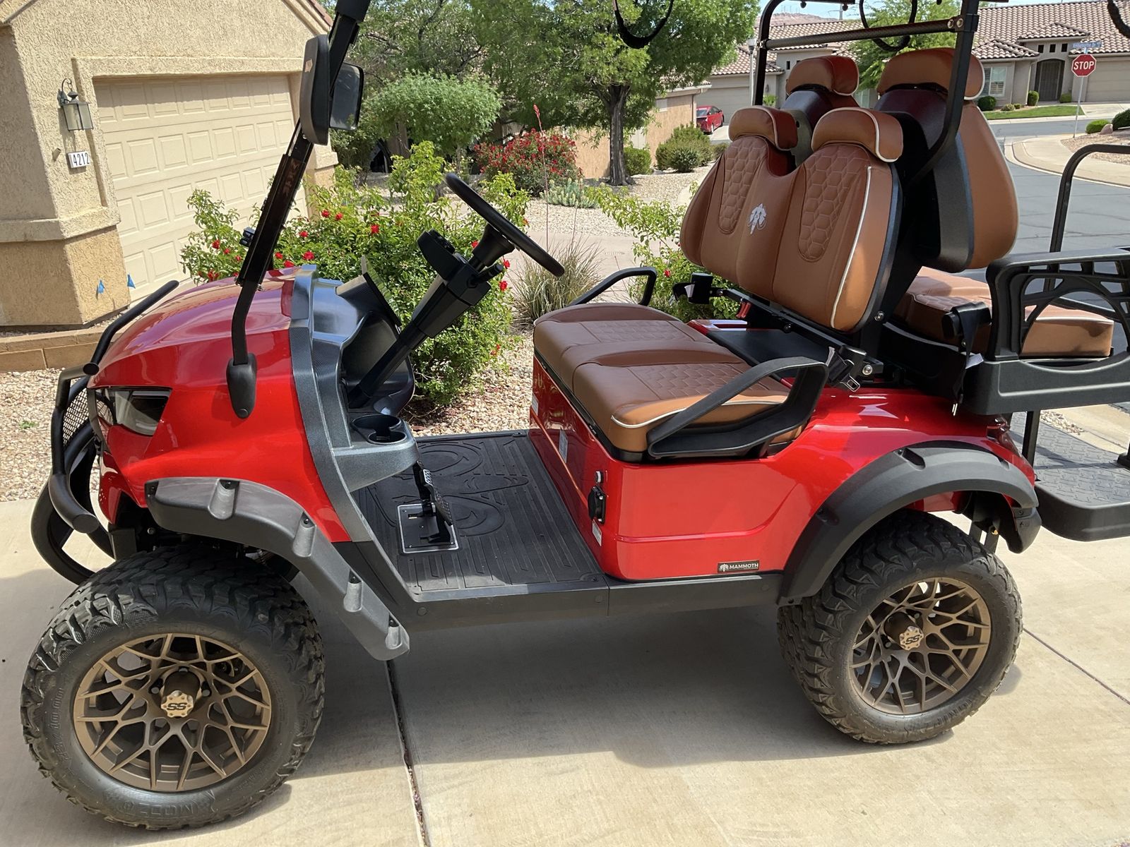 Custom Factory built Ferrari Red with Bronze Fatty Tires. Electric, tablet radio, backup camera, hidden storage ice chest, makes into a flat bed and everyone at the golf course was wowed by it and loves it. Tons of compliments. Hardly used. This is not a tiny wheeled golf cart. It is a GOAT…greatest of all time. Retails for over $16,000.