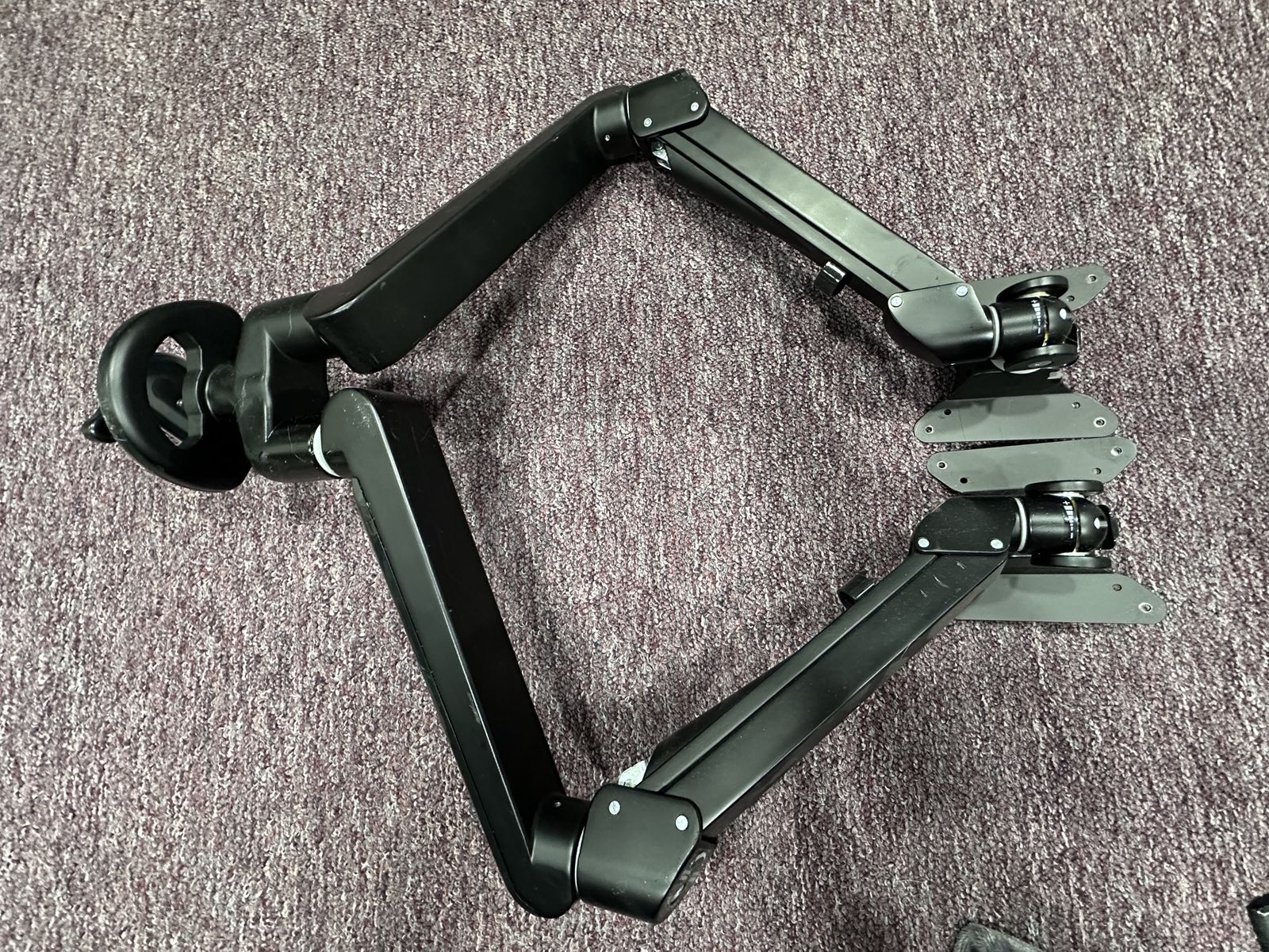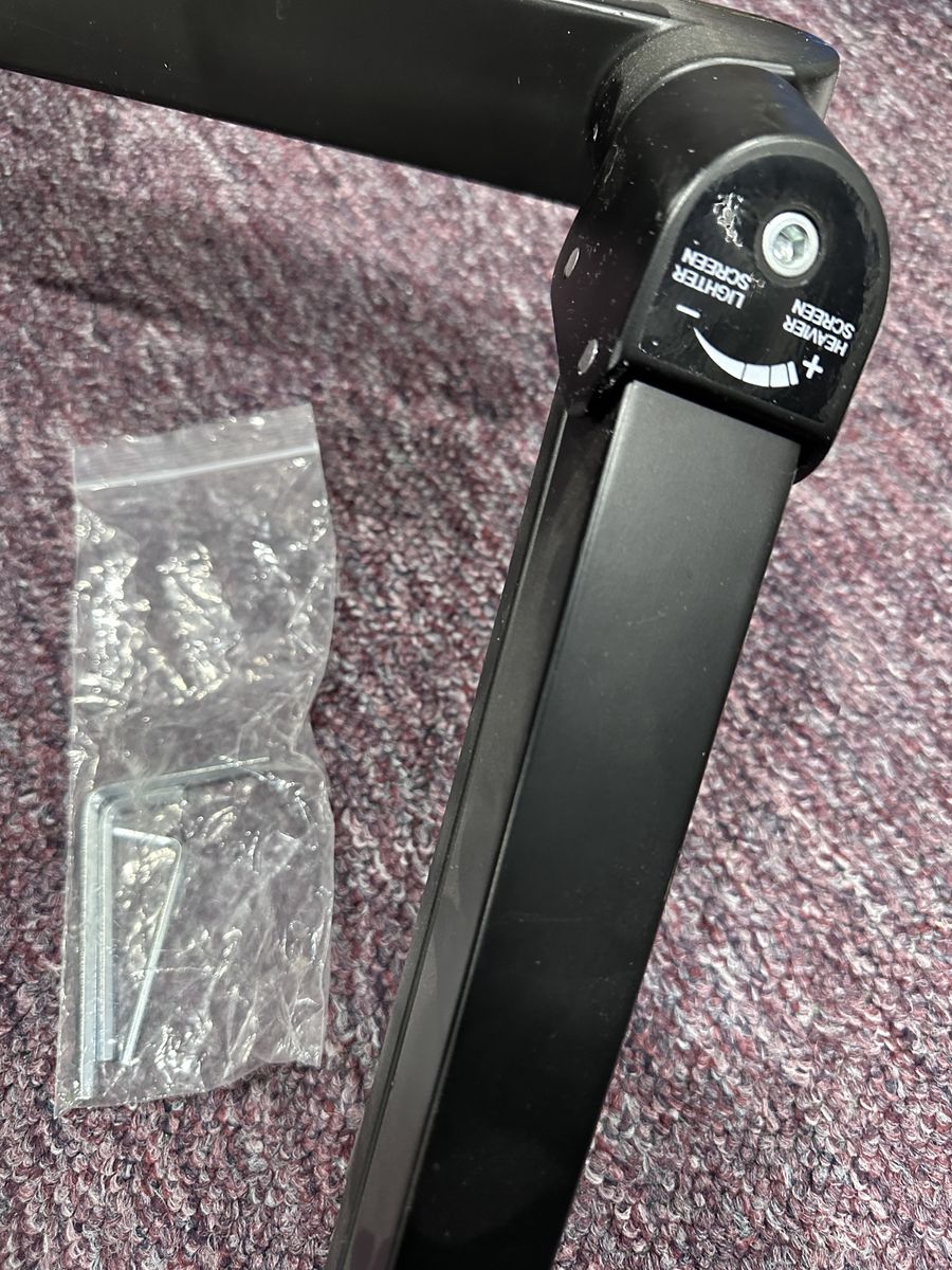 Venmodual monitor desk mount with gas-spring or mechanical-lift arms. Comes with allen wrenches. This will support heavier monitors. It’s not the cheap quality often found online for less. New this product sells for 479.00