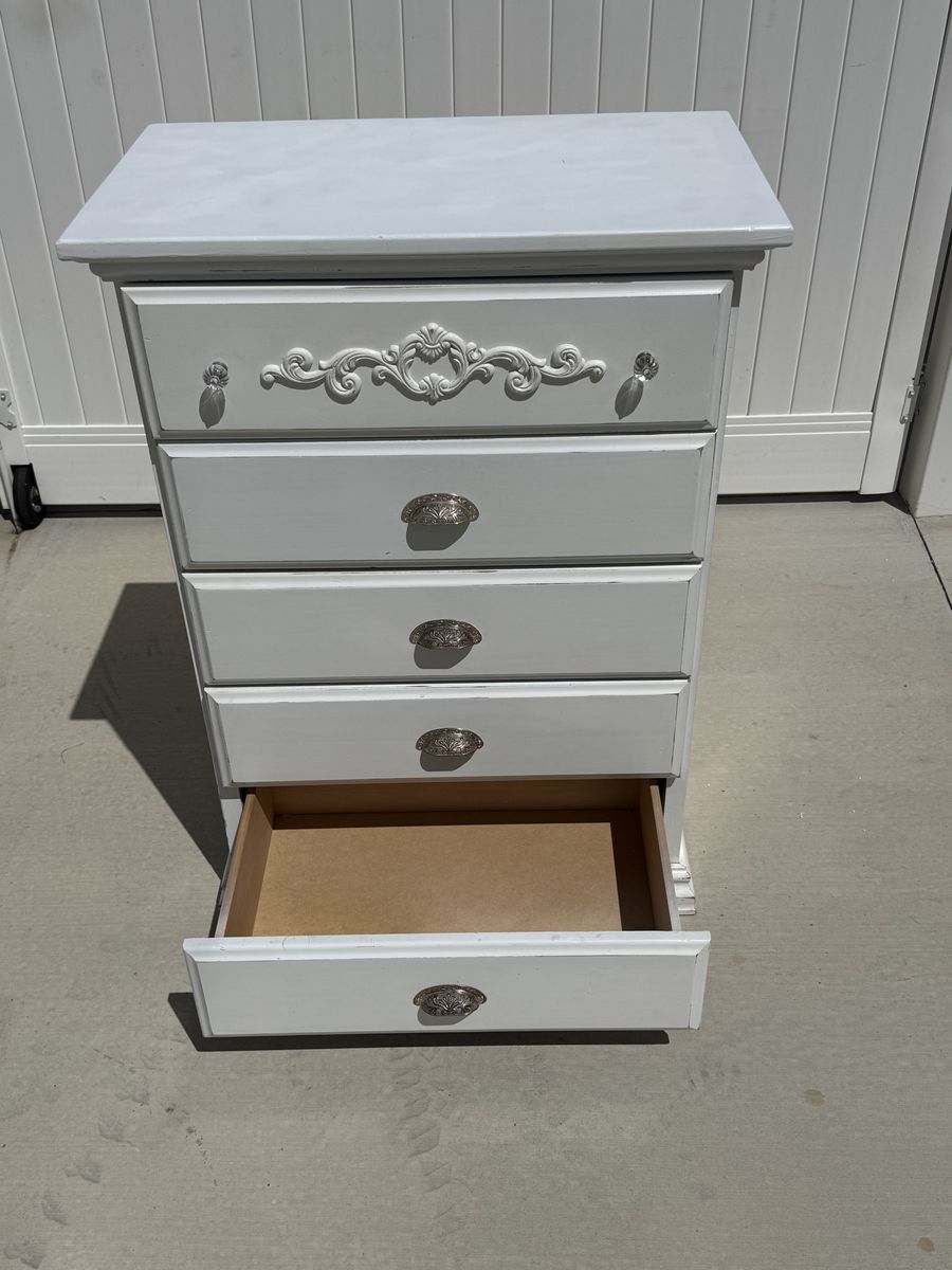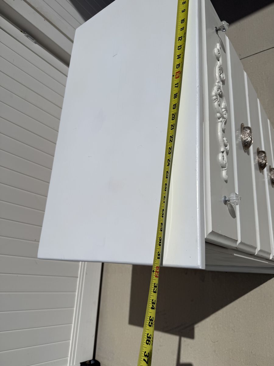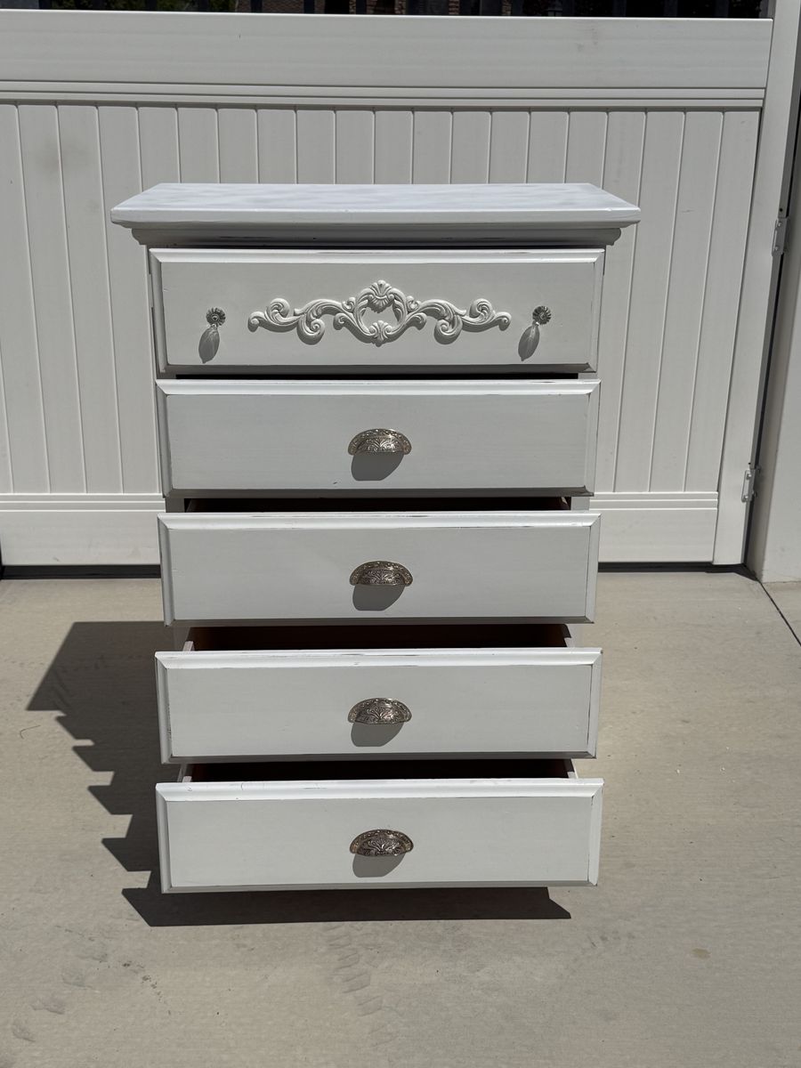 Nice solid wood dresser with a clean white finish and some subtle vintage-style detailing on the top drawer. It’s sturdy, well-built, and all drawers slide smoothly.
