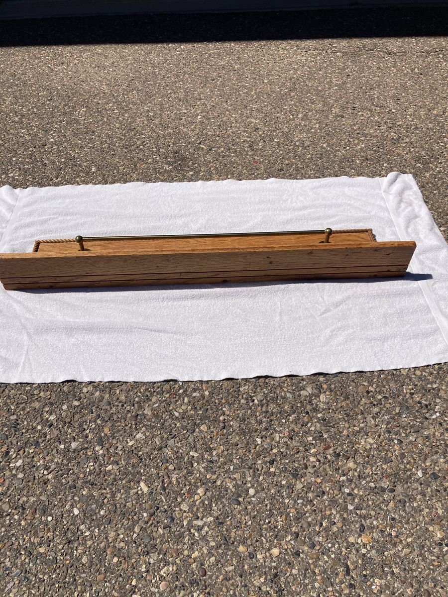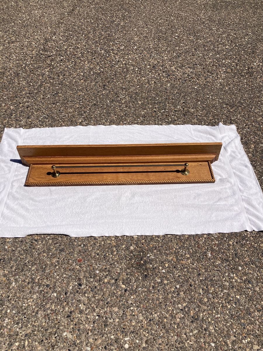 It is 47 in. long, 7.5 in. tall and 5 in. wide and includes a Brass bar for hanging toewls, etc.
