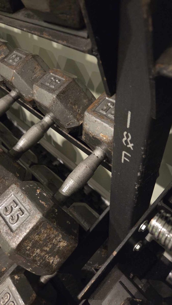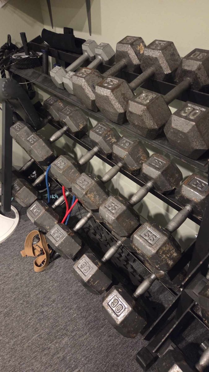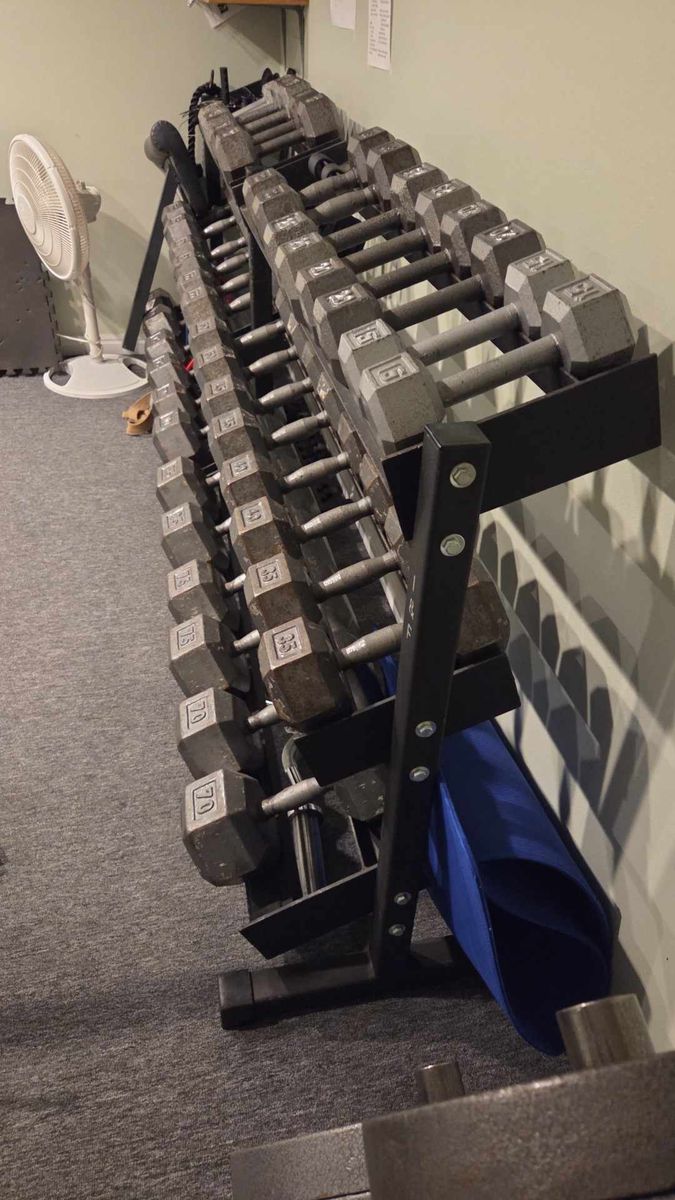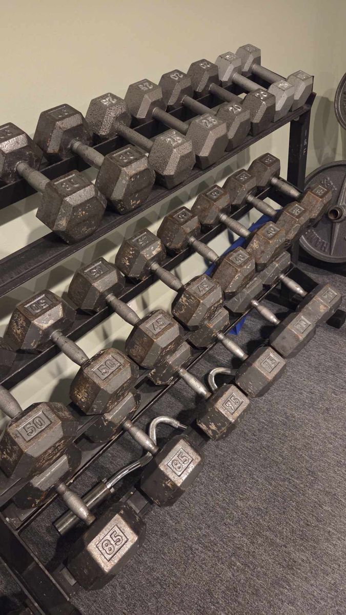 Dumbell set (pairs) from 30 to 100 lbs (80 lb set missing) a total of 1790 lbs. Includes rack. No "best offer." Price is FIRM. If still listed, it's available.