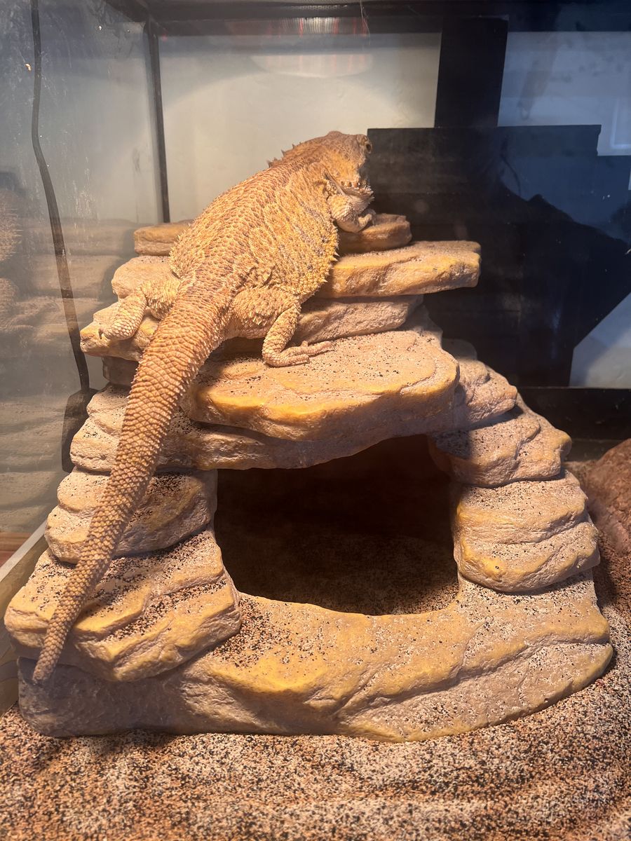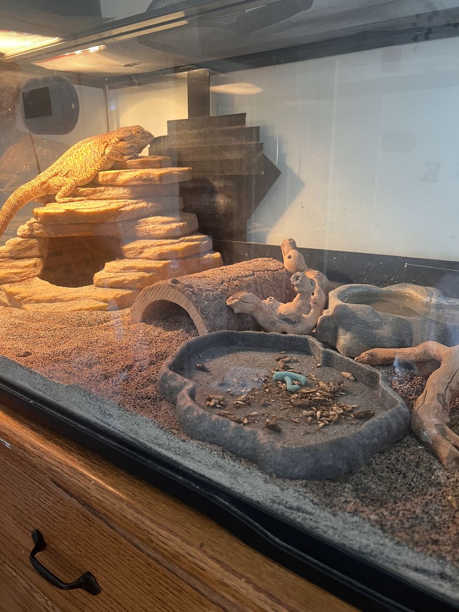 ApplePayWe have an older bearded dragon we wre hoping to rehome. We don't give him the attention he deserves. hes a chill but grumpy guy. he has never bit anyone. we got him from someone else and enclosure came with the back broken but the tape they put on it has lasted while we've had him. We just changed the sand so he should be good for awhile. includes everything in the enclosure plus an extra bowl and food. 65 OBO