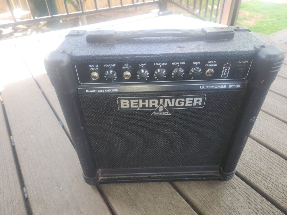 Compact Behringer BT108 bass amp in good working condition. 15 watts 8” speaker 3-band EQ Headphone output AUX/CD input for backing tracks Great for practice or small setups.