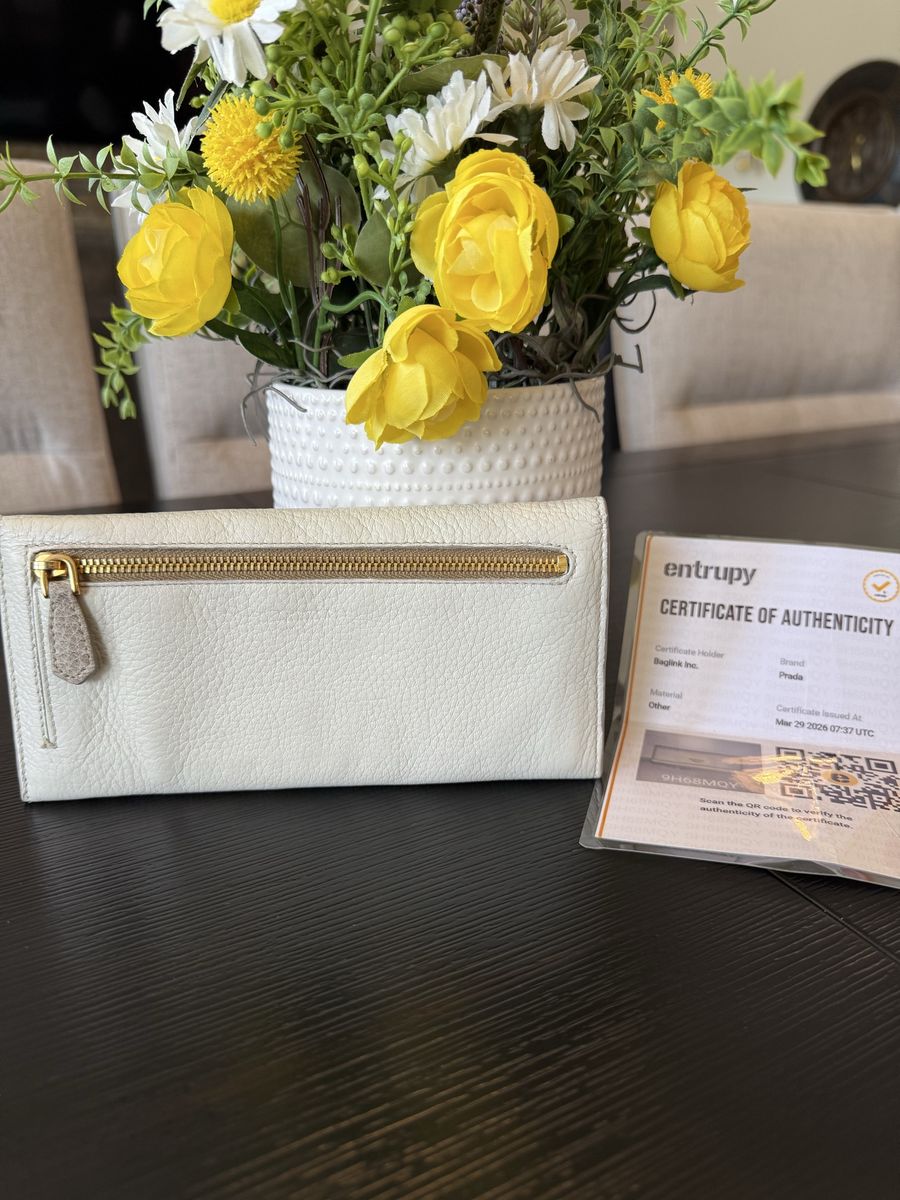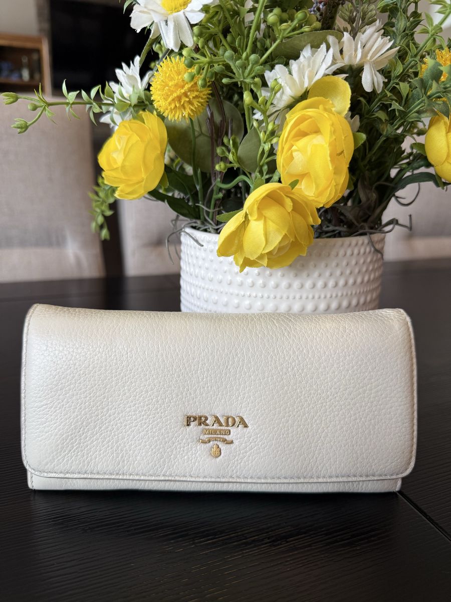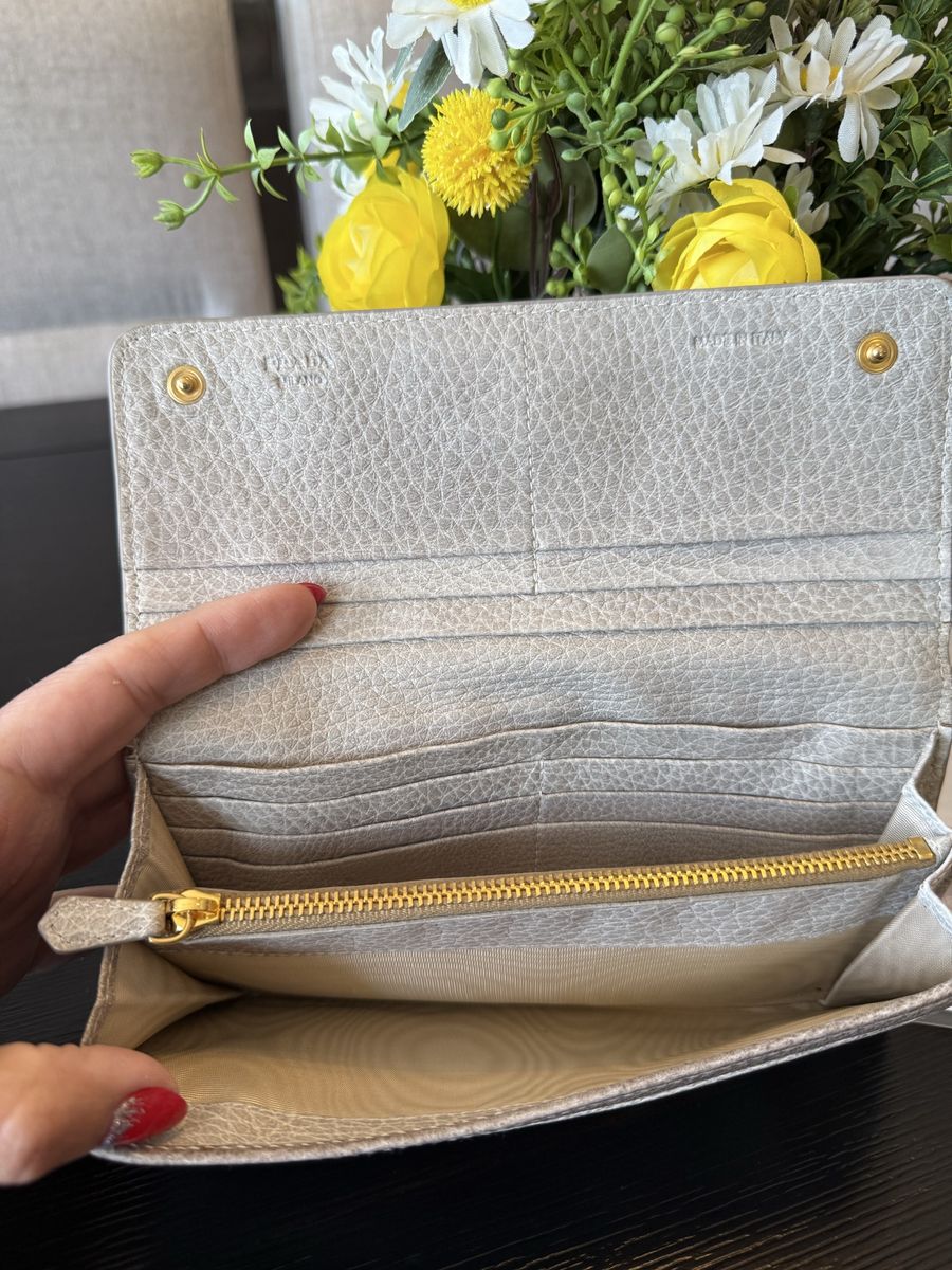 ApplePayPrada Vitello Daino Continental Flap wallet. Can be worn as wallet on chain (chain not included). Good condition. Comes with complimentary “Certificate of Authenticity” from Entrupy.