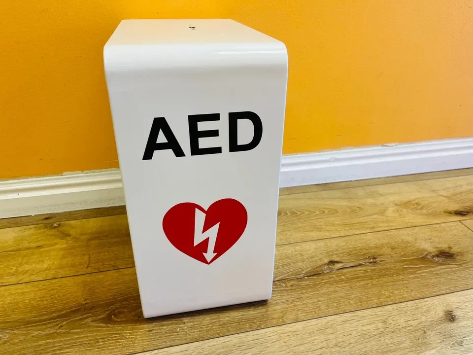 This is a wall-mounted AED cabinet designed for storing an Automated External Defibrillator (AED). It is made of durable metal and features a clear window and lockable door.