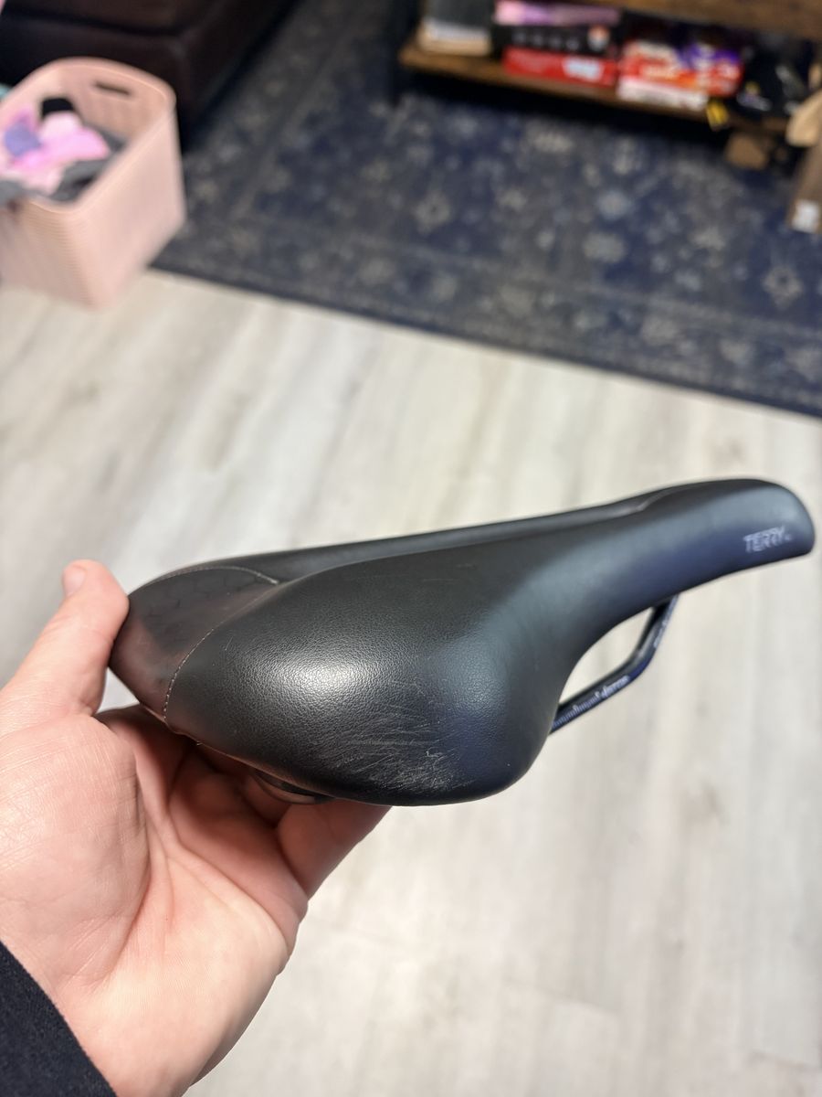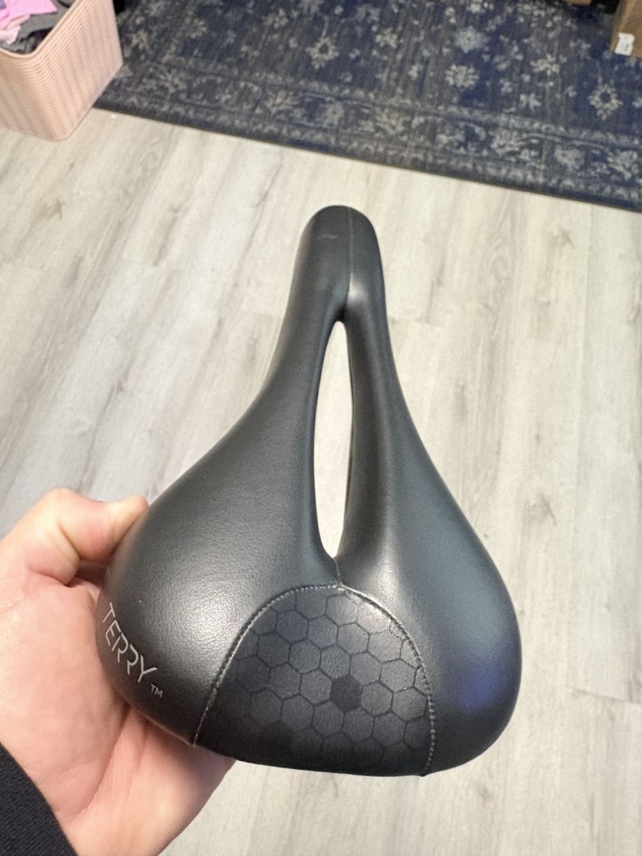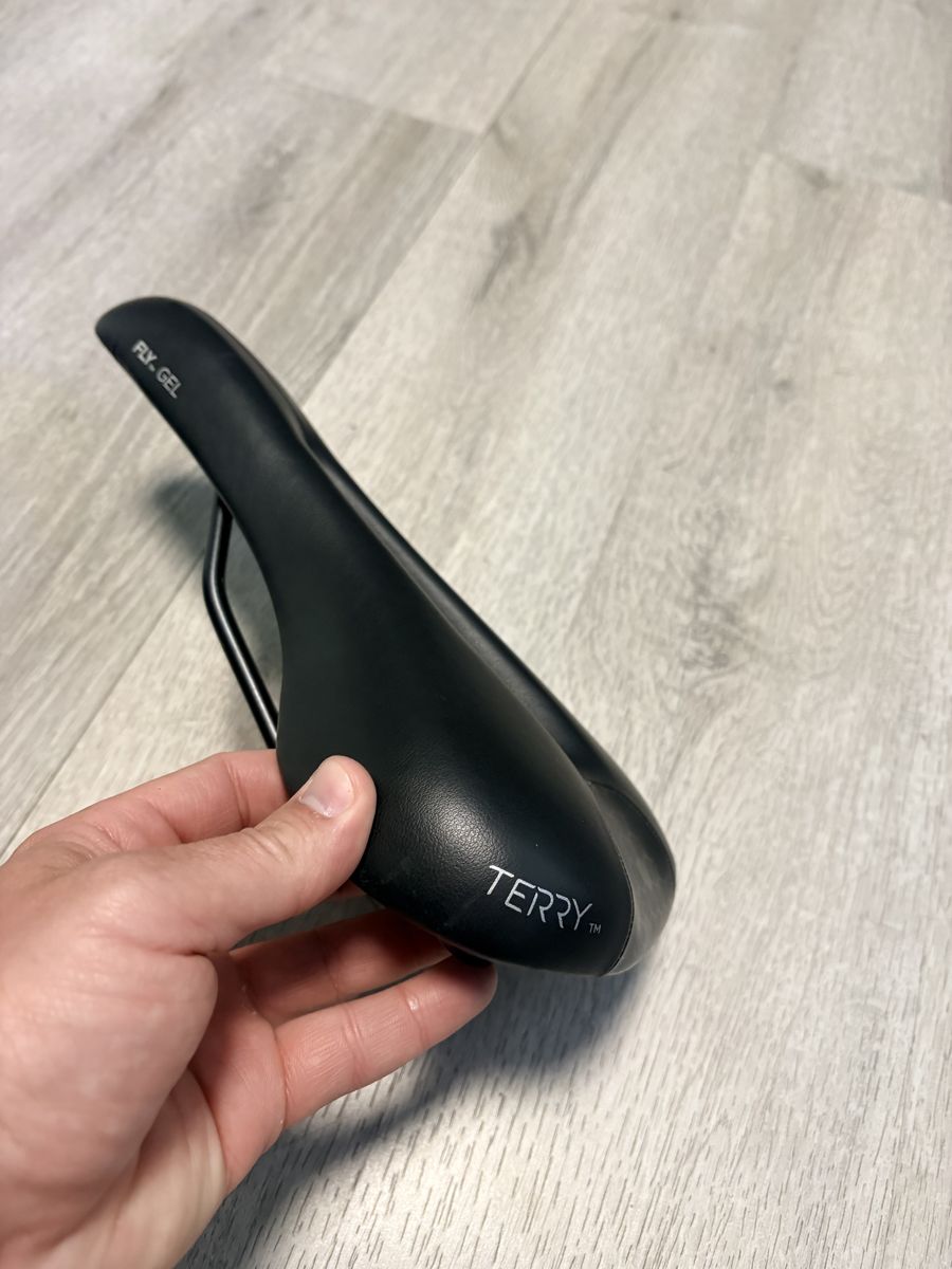 ApplePayComfortable Terry Fly Gel bike saddle. Has black color. Features a center cutout for pressure relief. Also has Fly Gel technology. Good for long rides.