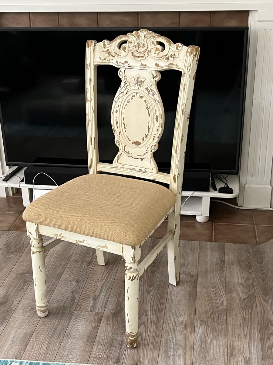 VenmoDistressed antique looking chair from Hobby lobby. Makes a great photo prop, vanity chair, bedroom chair. It’s very sturdy in great shape..