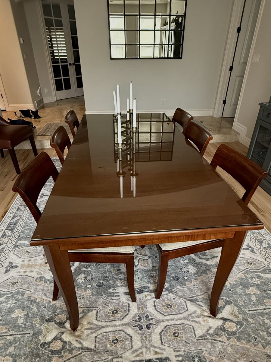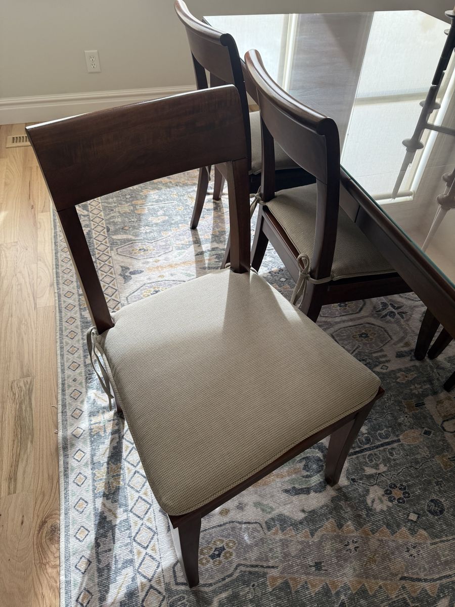 Barely used dining table and 6 matching chairs, all in excellent condition. I think it's solid wood. We purchased from Crate & Barrel and then had a glass top added to protect the surface. Well-priced for the quality. Fairly dark stain; neutral brown in the light. Includes the seat cushions, which are in perfect condition.