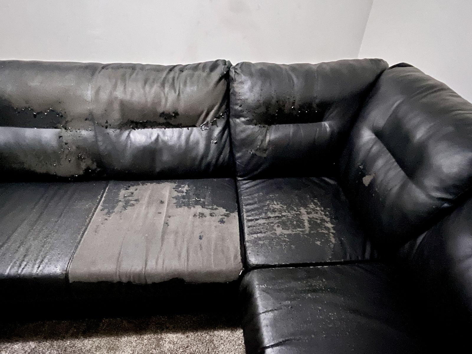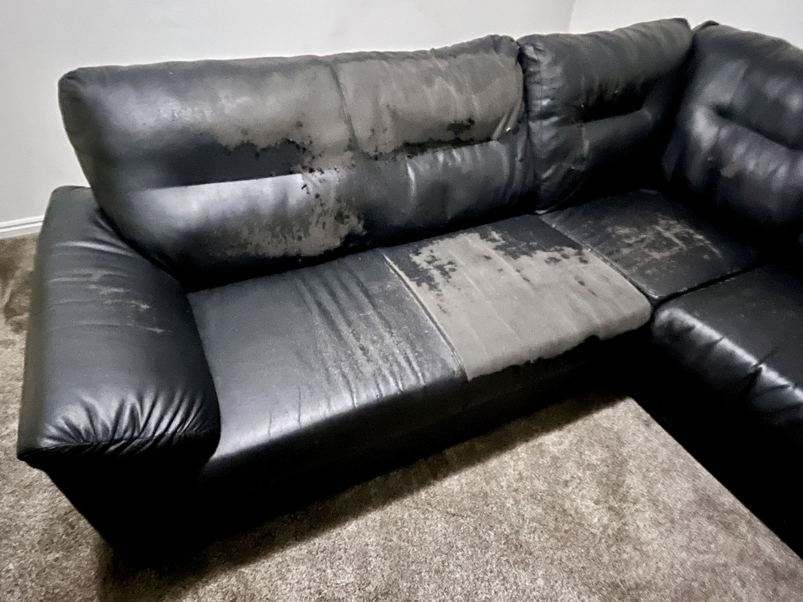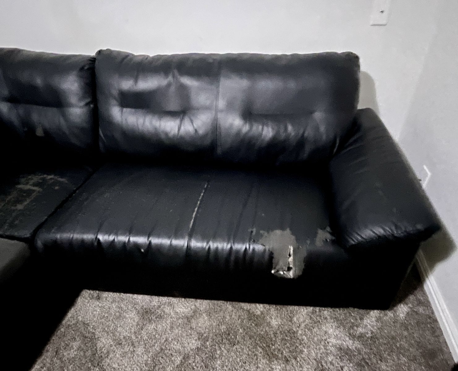 Free- must pick up. Faux black leather 3-piece sectional sofa. Has wear, hole on cusion & peeling. Best if intending to cover with blanket/ couch cover. Otherwise still useful with good, sturdy frame.