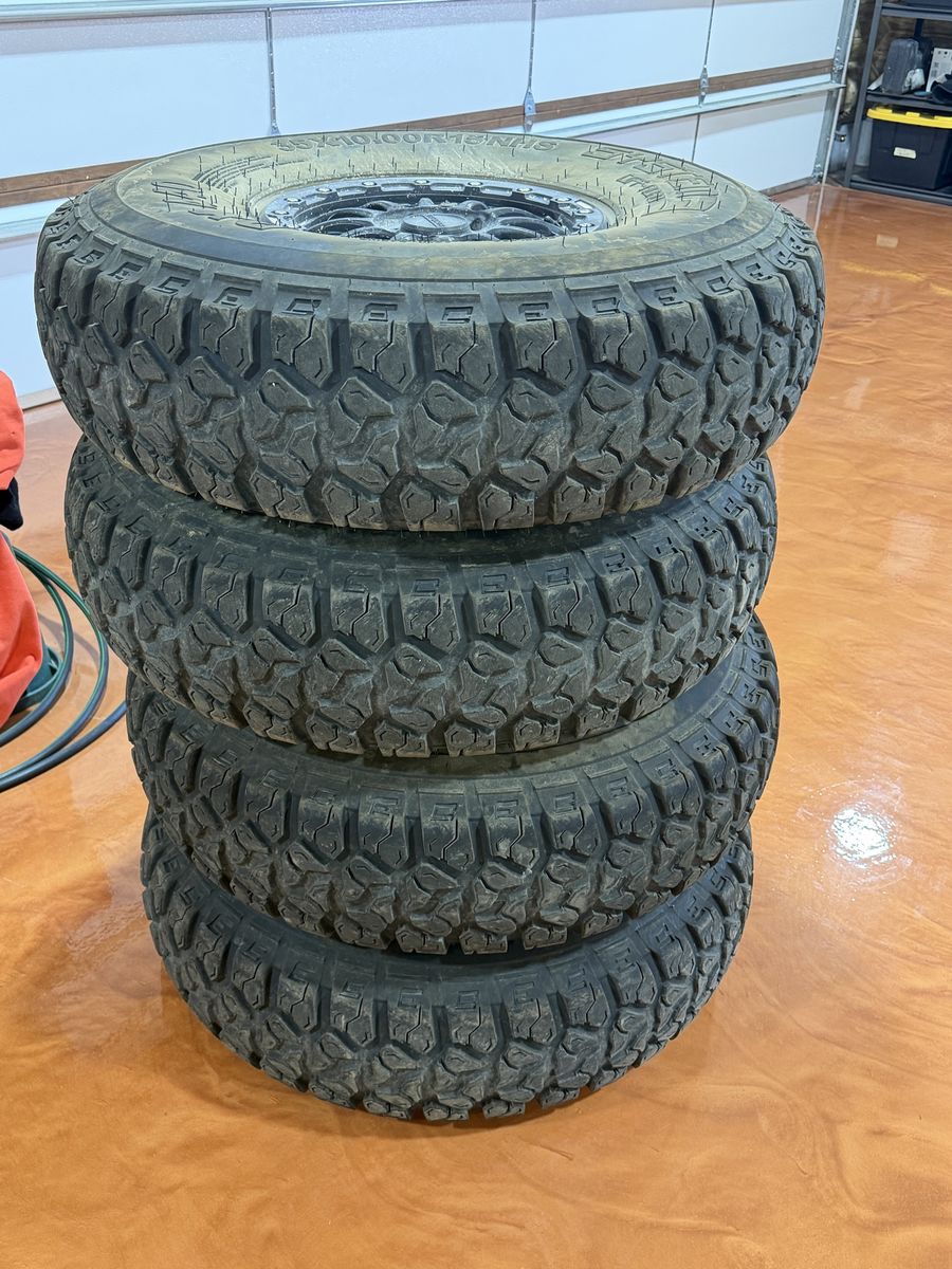 Tires have around half tread one of the sidewalls got a little gashed on a rock but still works fine all the tires hold air not bends in the wheels ended up getting a set of kmc wheels that I’ve been wanting and already had tires on them only reason I’m selling them