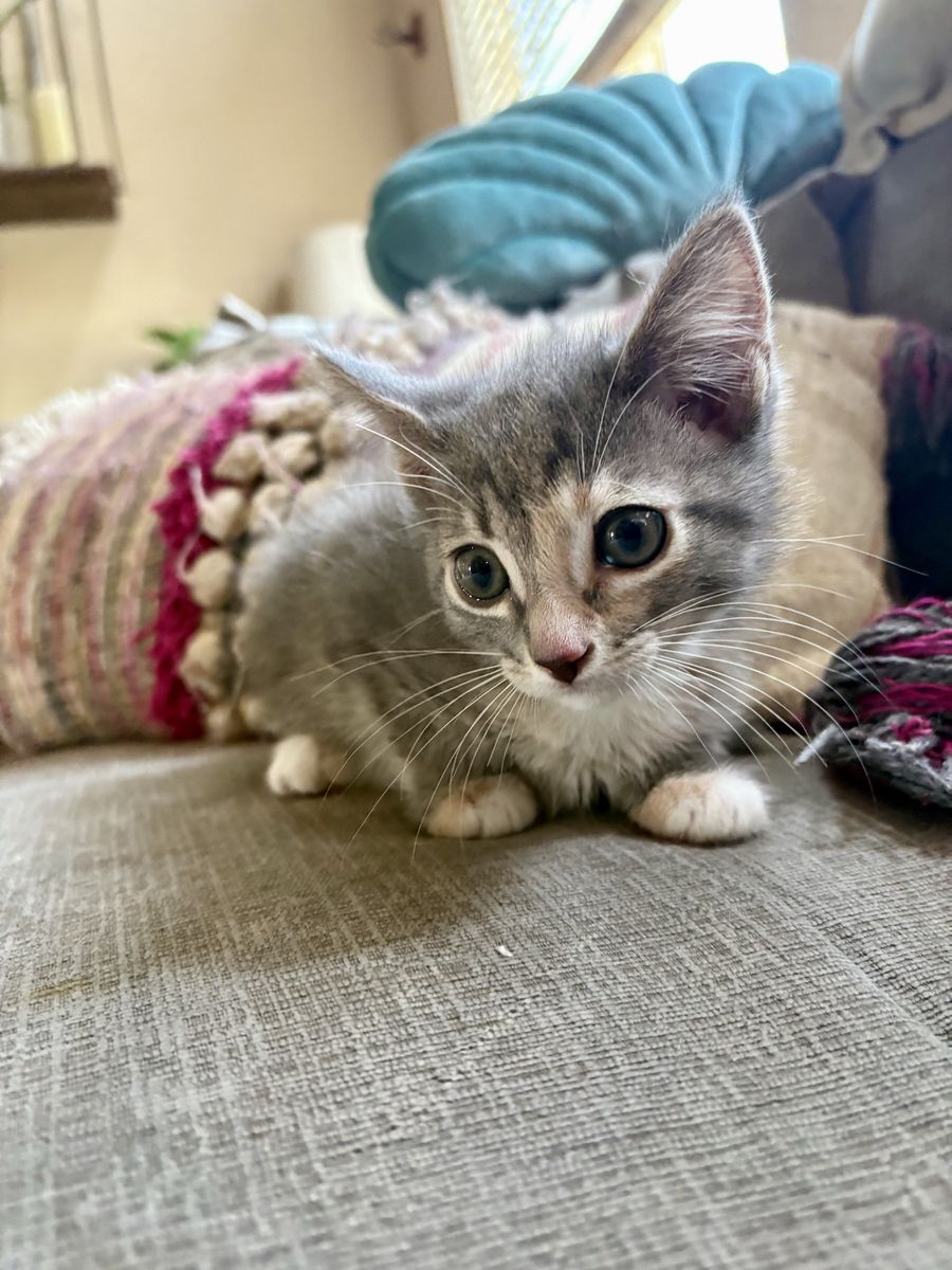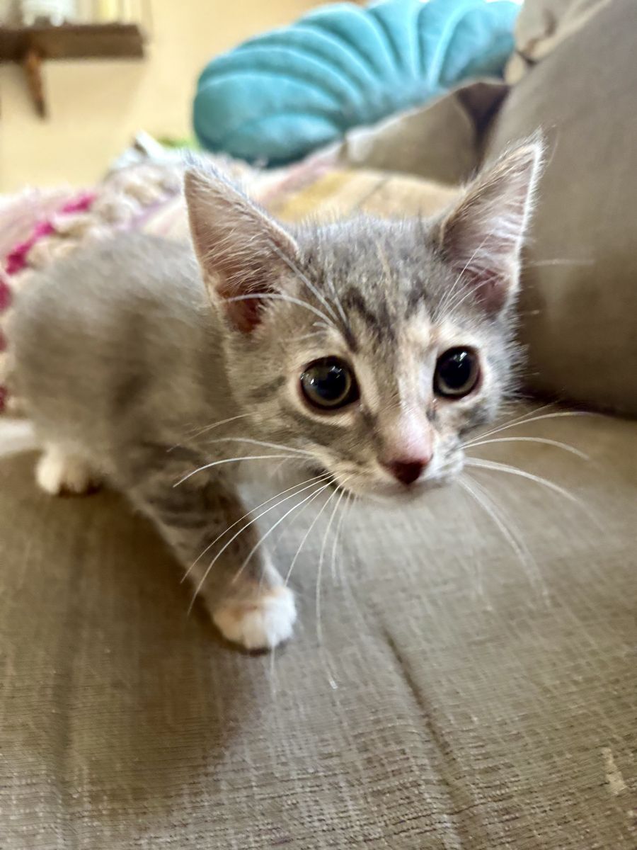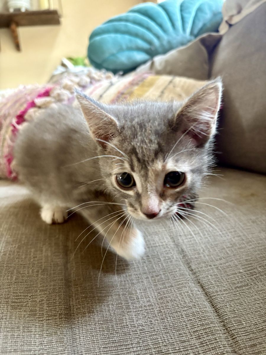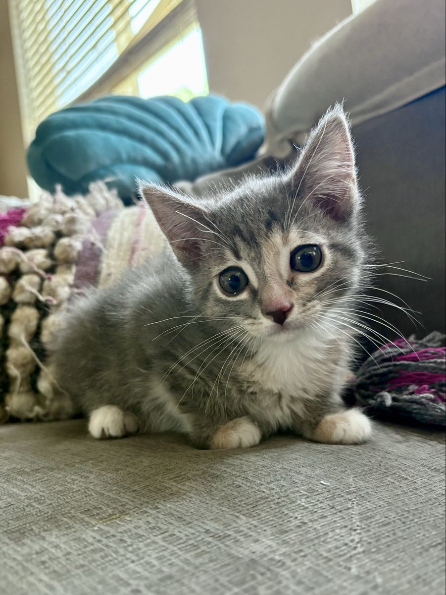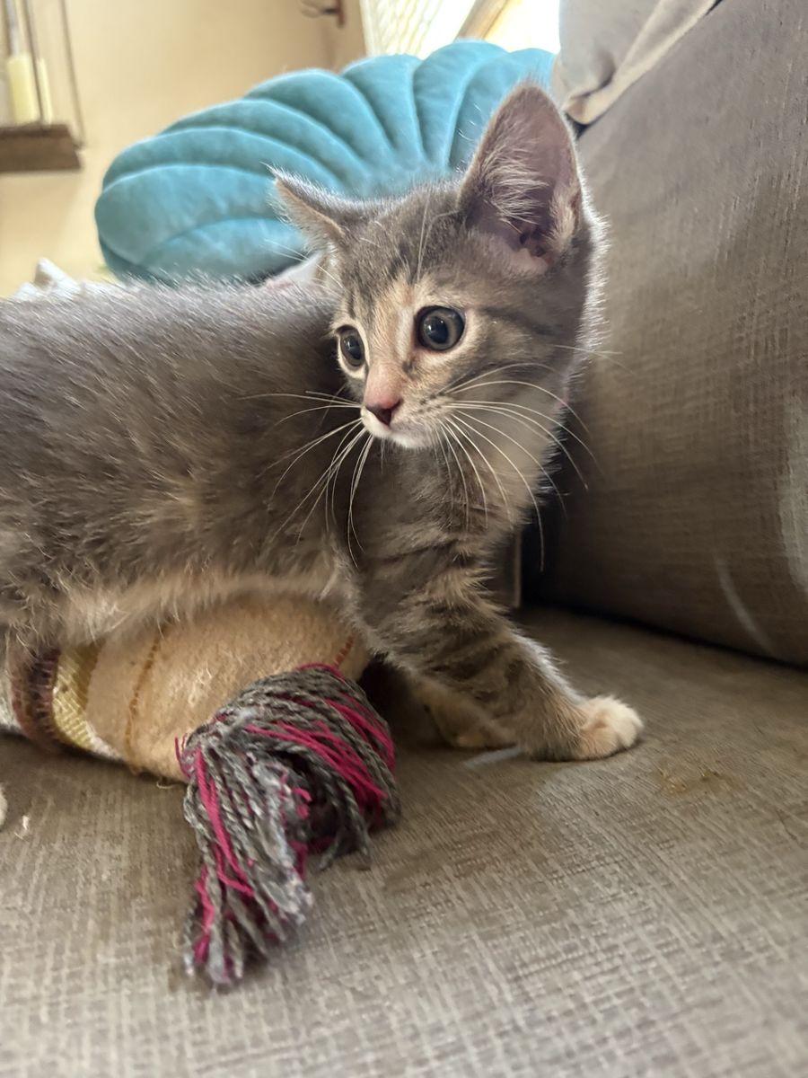 VenmoSalsa is a sweet 8 week old gray Torbie (tabby and tortie) girl who loves to play and cuddle! Does not have shots and is not fixed. Salsa is eating Purina kitten chow hard food and wet food. Litter box trained. Cash preferred.