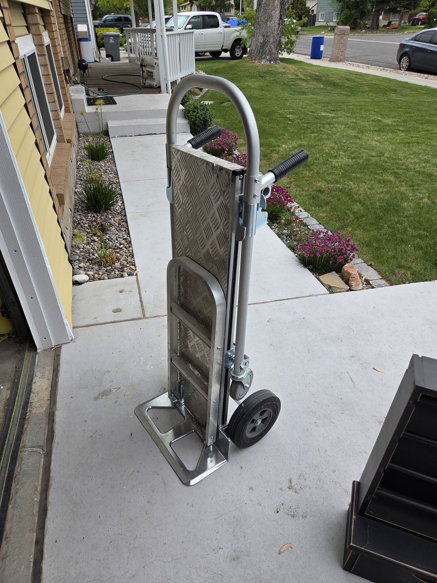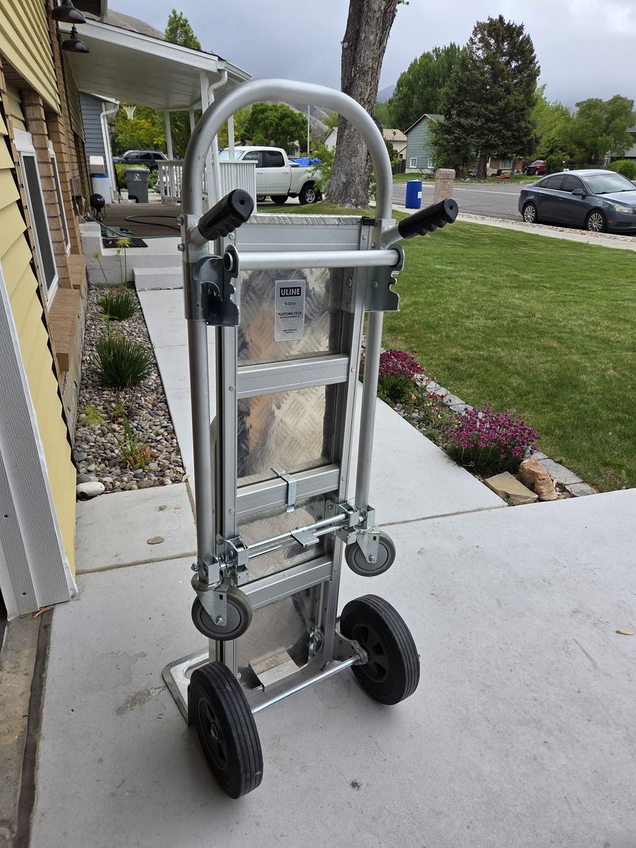 Brand new uline convertible hand truck. Features include dual handles, 30 in. nose extension, solid wheels and aluminum deck plate.