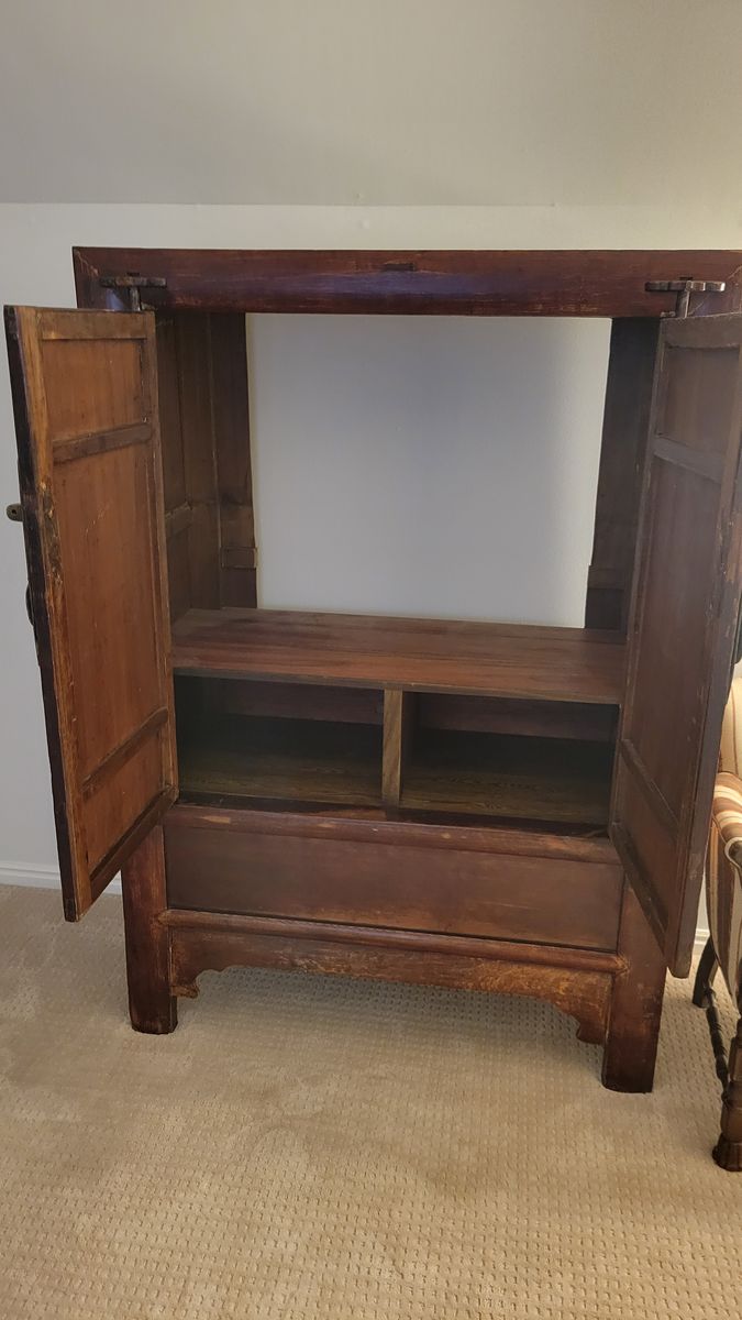 FREE: From China, late Qing Dynasty to early Republic (1850-1920). Two door cabinet, lower storage compartment and top lid. Round brass hardware symbolizing unity, harmony and marriage. A good honest decorative antique, authentic without being overly formal. Fits in mountain homes as a contrast piece.