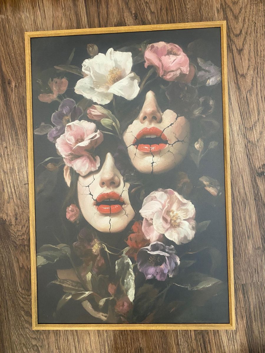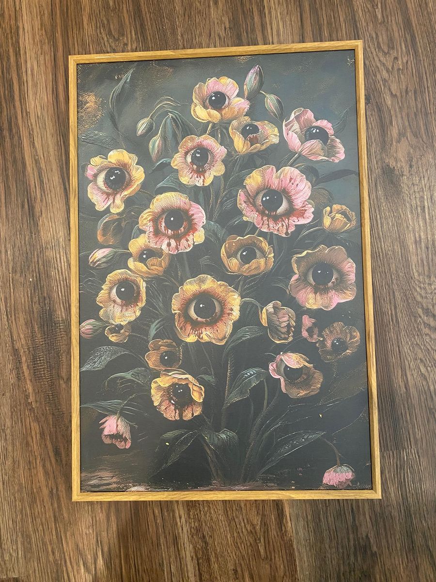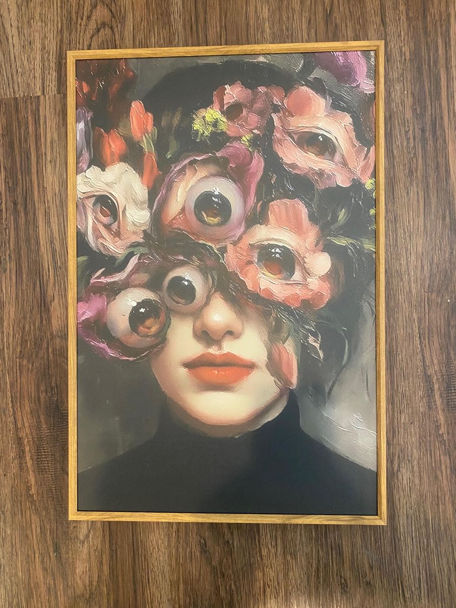 This striking three-piece artwork set blends dark surrealism with botanical beauty, creating a captivating visual narrative that feels both haunting and elegant. Each panel features richly detailed florals intertwined with human elements—most notably the unsettling yet mesmerizing presence of watchful eyes hidden within blossoms and faces.