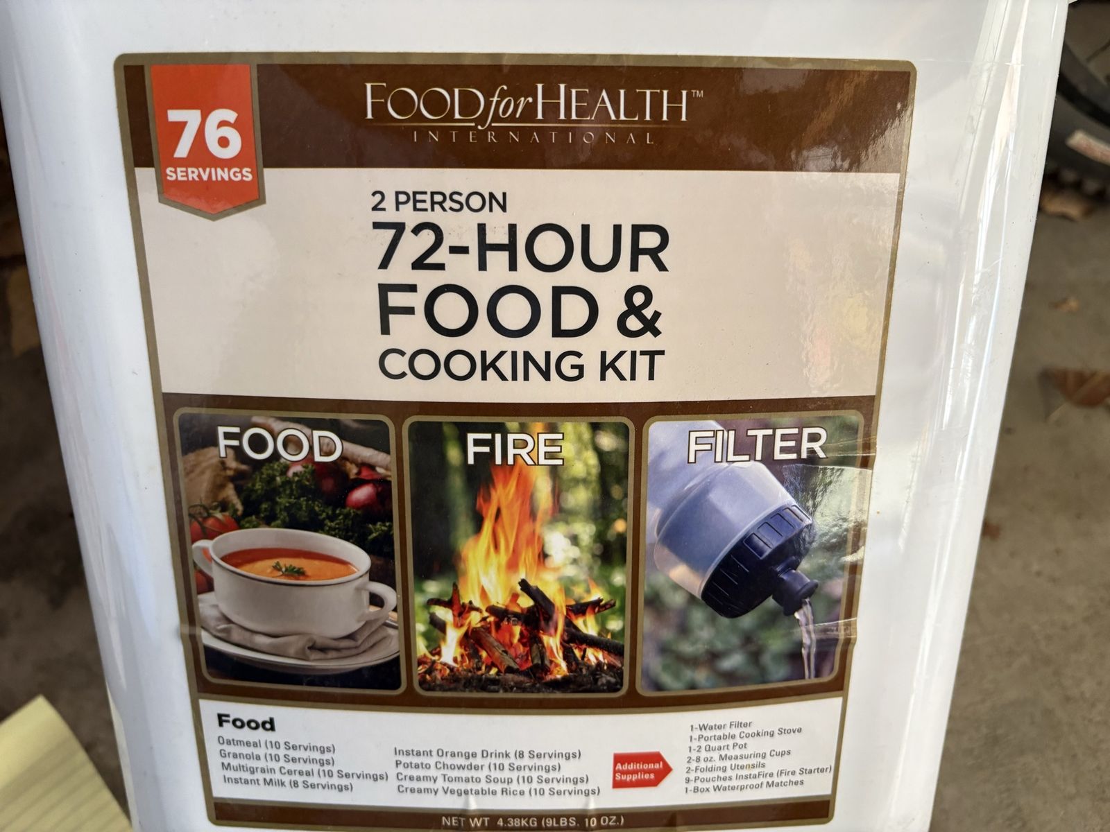 I have a 2 person 72-hour food & cooking kit in a bucket. It was made by Food for Health and was purchased at Costco. The label on top says the shelf life is 20 years from the manufacture date which was 020513 so it should be good until 2033. I may have more of these available but need to check the manufacturer dates on them before I list them. I believe it was originally about $60 and looks like similar ones are now about $80. See my other ads for jewelry, artwork, home decor and more.