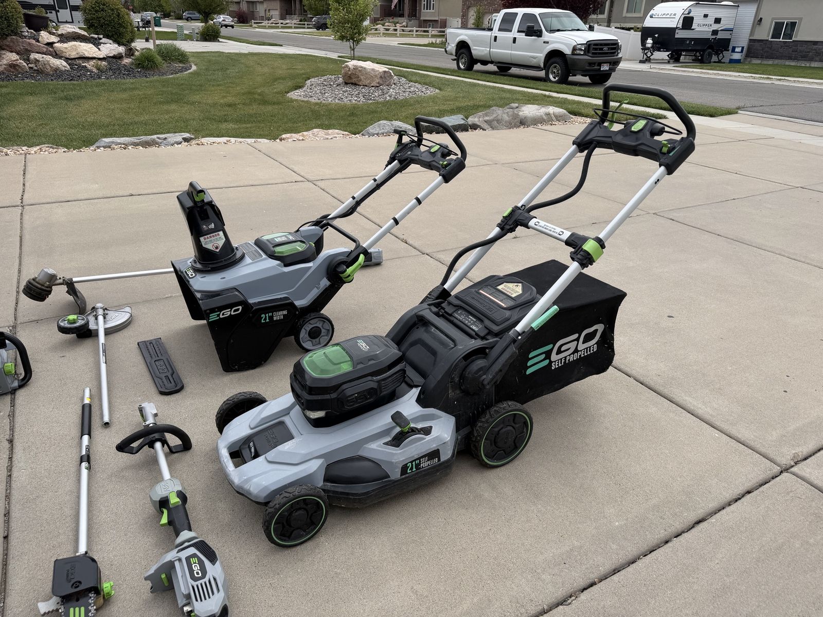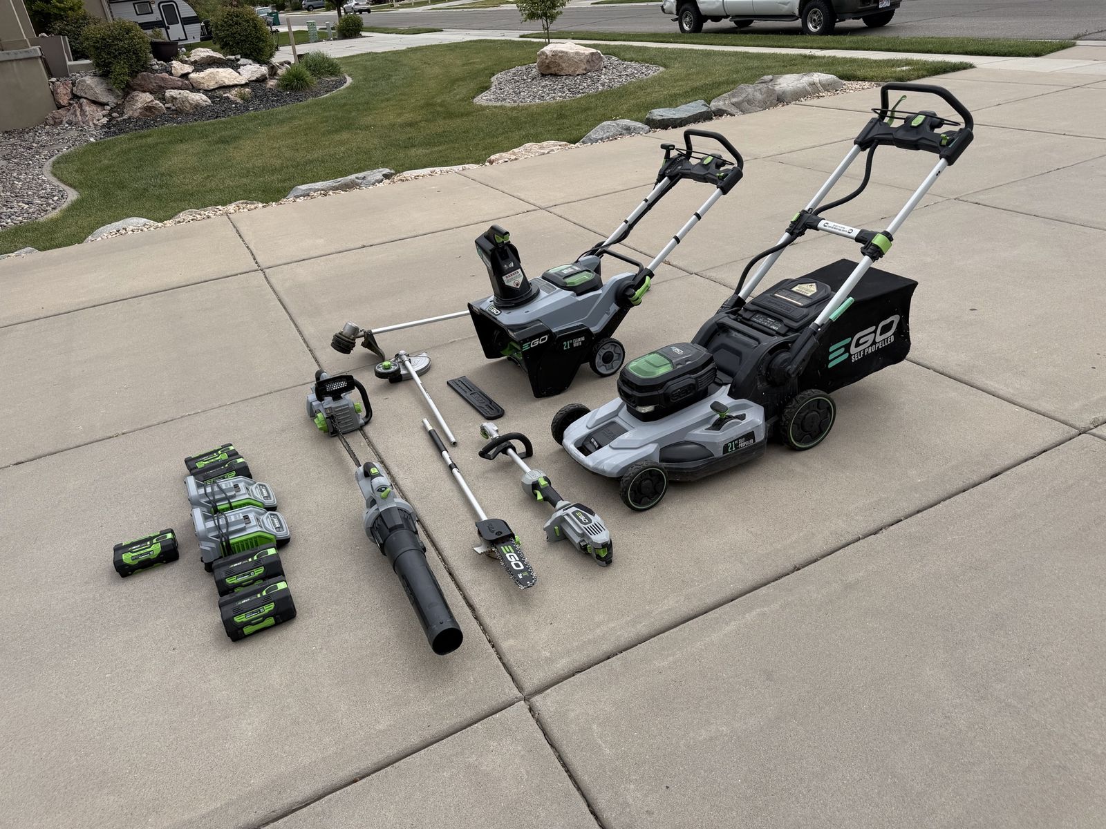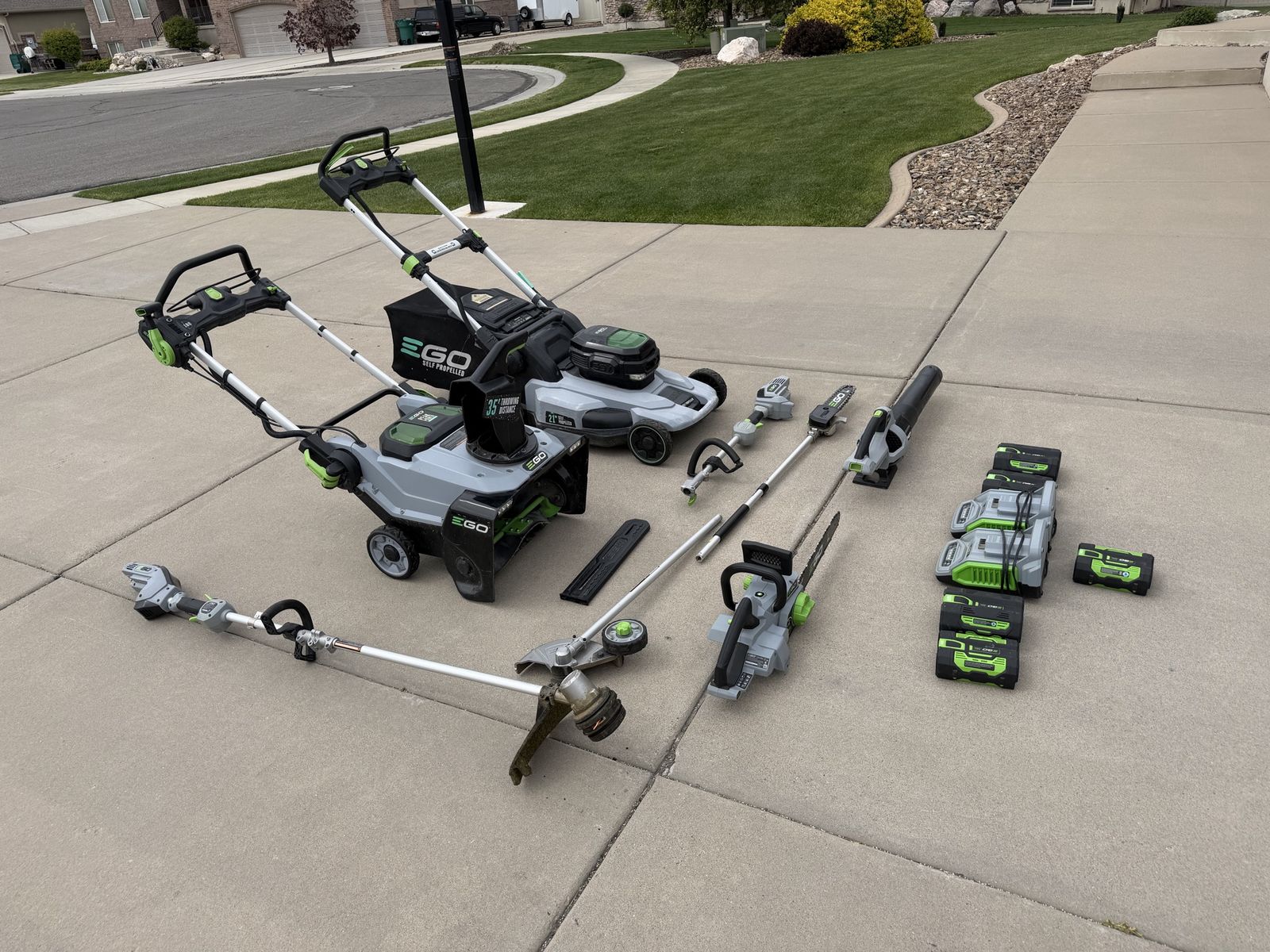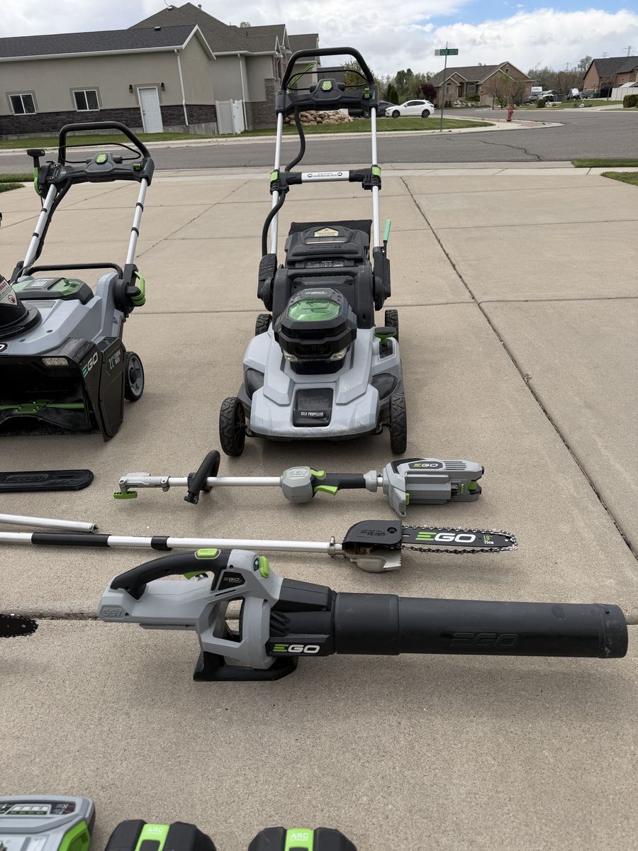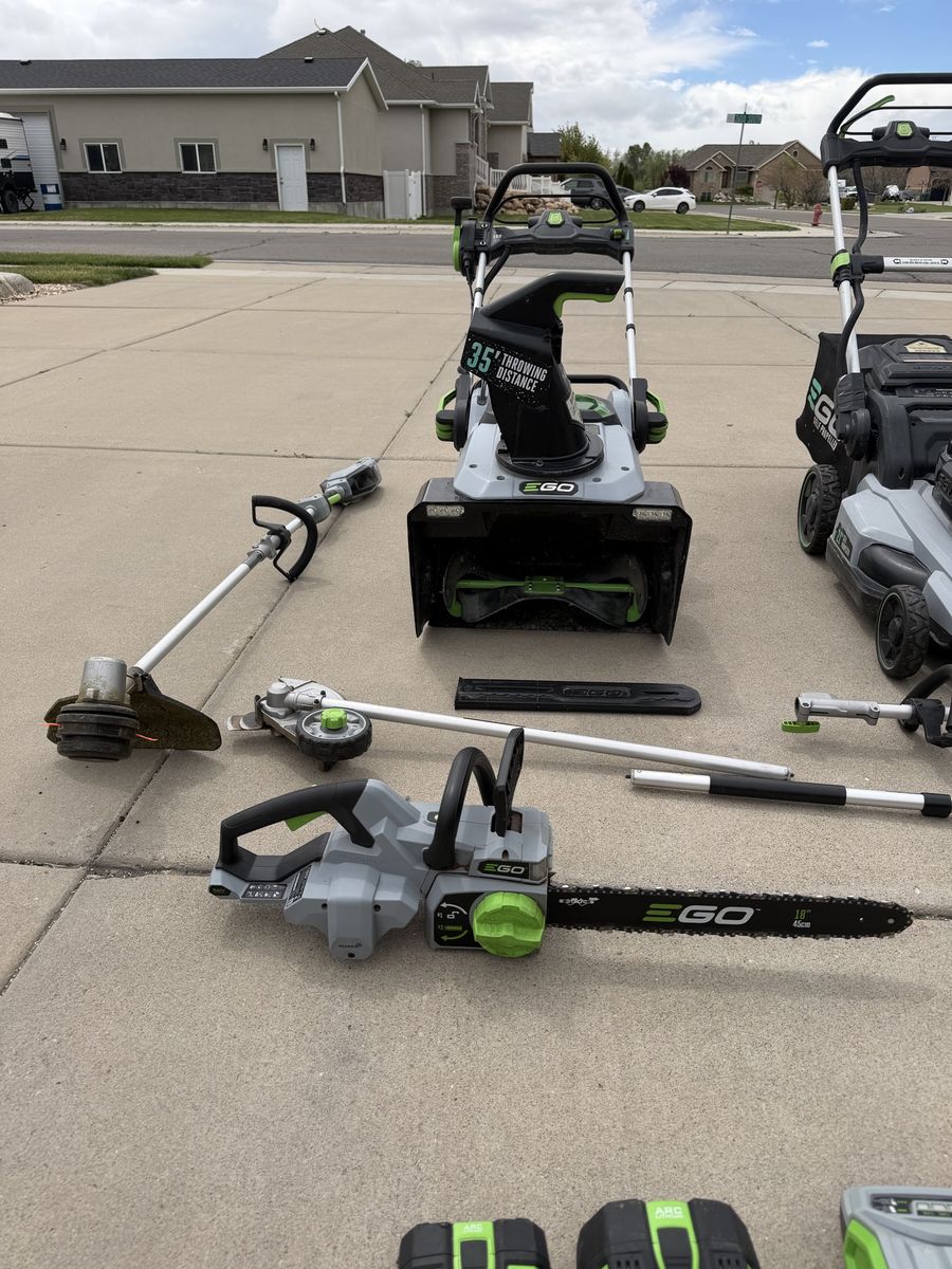 ApplePayEverything is in great working condition, comes with an 18 inch chainsaw, a self-propelled mower, a snowblower, a leaf blower, a trimmer, and edger, a hedge trimmer, a multi use tool, five batteries, and two chargers. this is basically every ego product you could ever need. Everything works. Wonderfully message me if you have any questions.