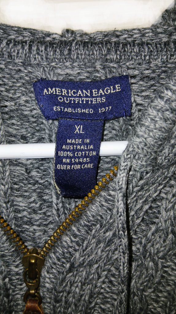 Grey American Eagle outfitters knitted hoodie. Men's Size: XL 46-48 and it's 100% cotton in great condition, Like New. All the measurements are in the pictures. Women can wear this knitted hoodie, even if it's in men's XL. F.Y.I, KSL won't let me change the subcategory to men's apparel. I clicked on the wrong apparel.