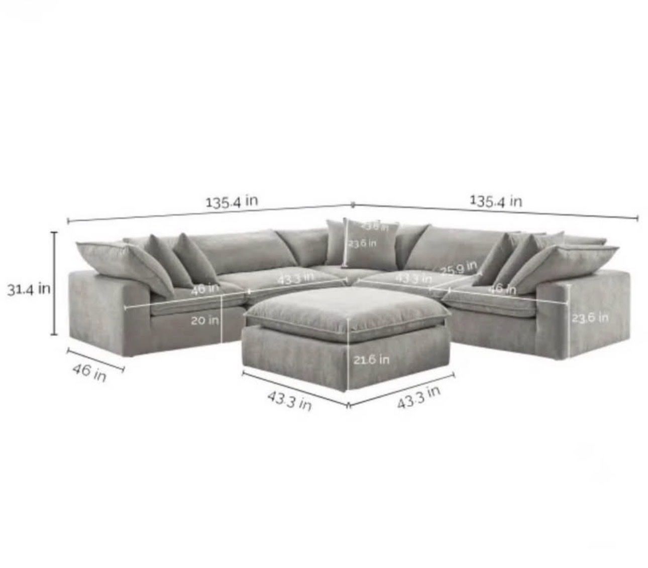 Overall Dimensions 135.4 L x 135.4 W x 31.4 H Seat Height 20 Seat Depth 25.9 Seat Width 43.3 Back Height - not including back cushions 23.6 Overall Sectional Weight 503.7 Weight Capacity Per Seat 300 Armless Chair Dimensions 43.3 L x 46 W x 31.4 H Armless Chair Weight 87 Corner Wedge Dimensions 46 L x 46 W x 31.4 H Corner Wedge Weight 87.6 Ottoman Dimensions 43.3 L x 43.3 W x 21.6 H Ottoman Weight 61.7