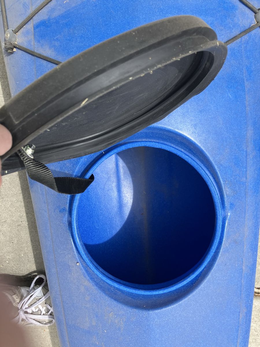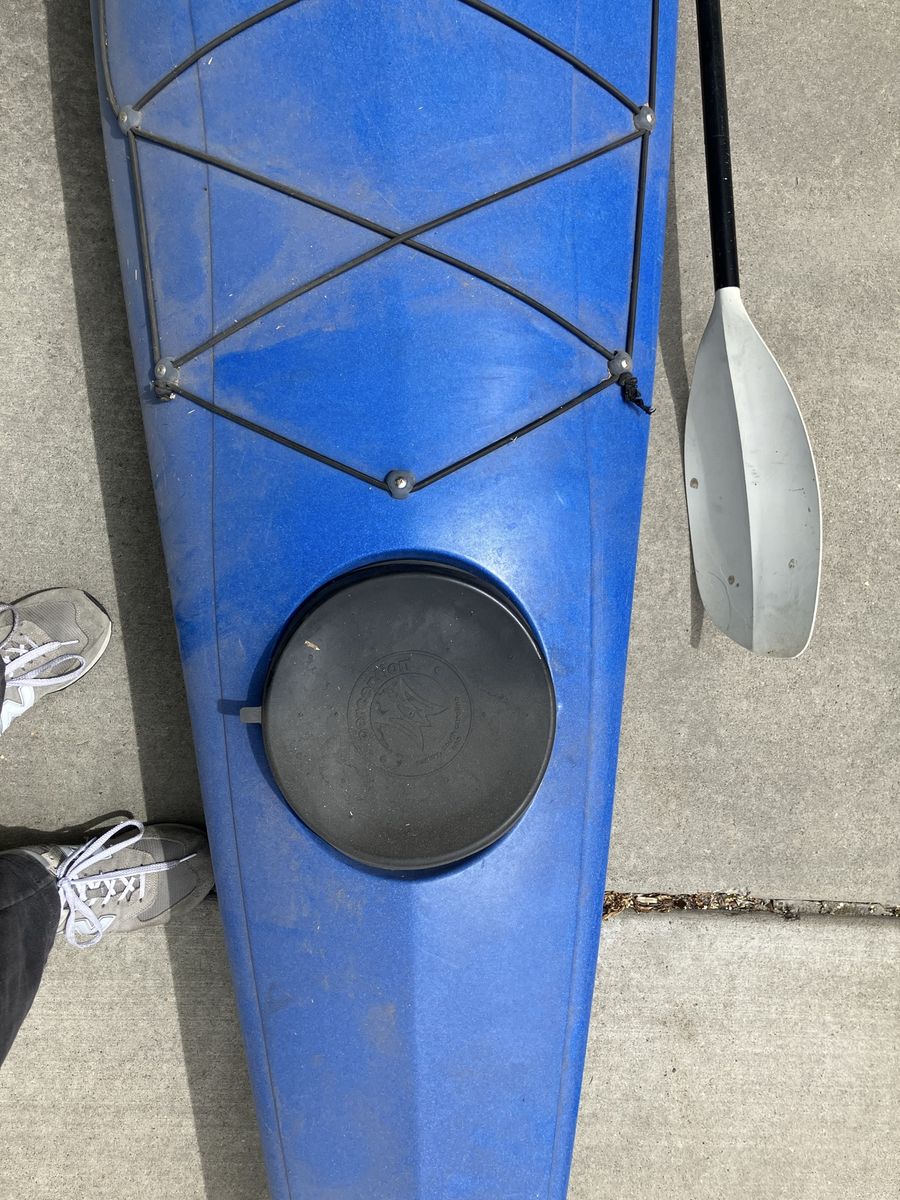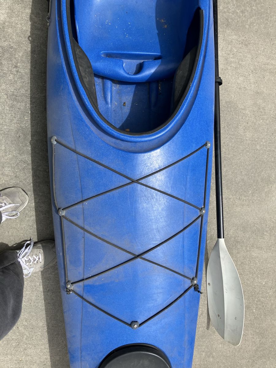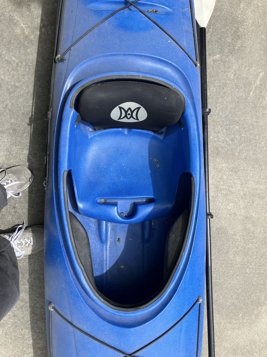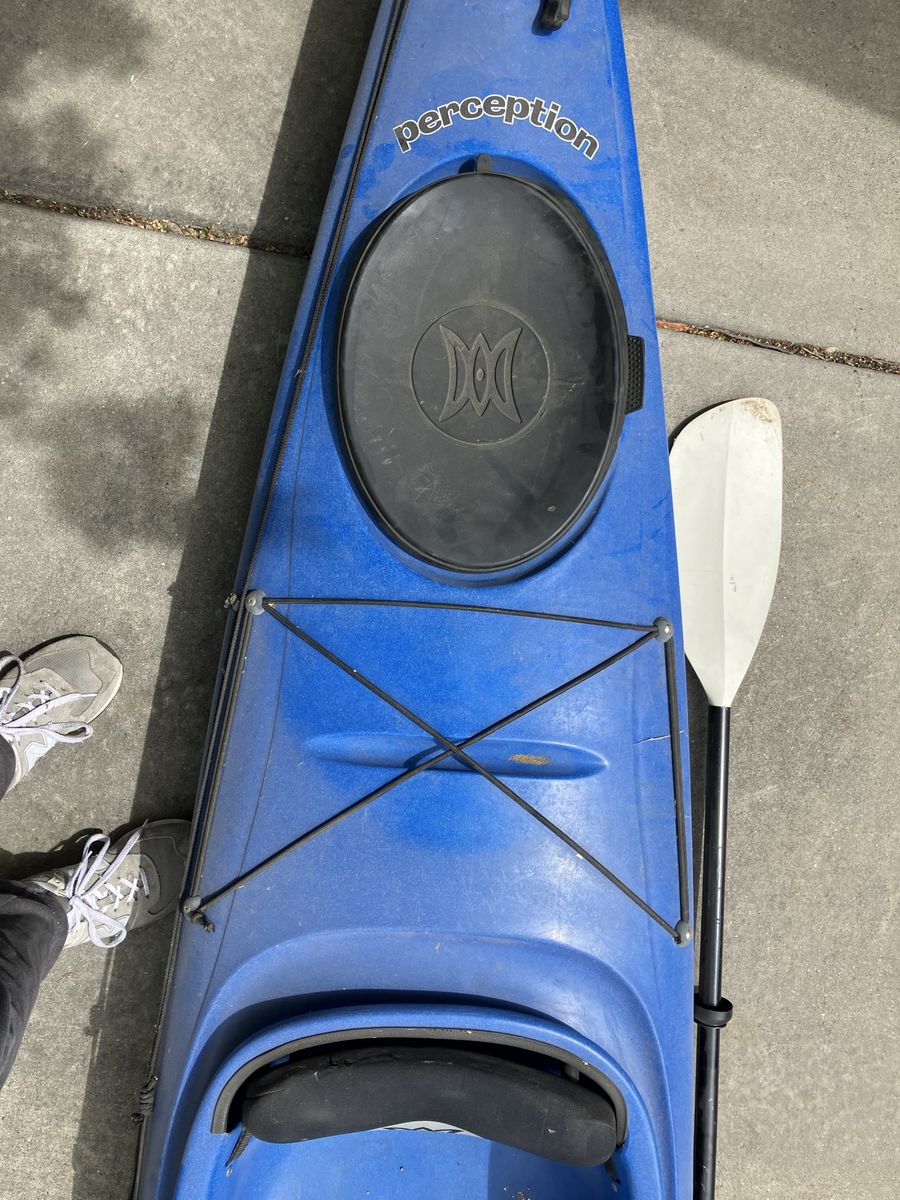 VenmoFun blue Perception kayak. Comes with a paddle. Has storage hatches at front and back and bungee cords to hold your gear. Great for getting out on the water.
