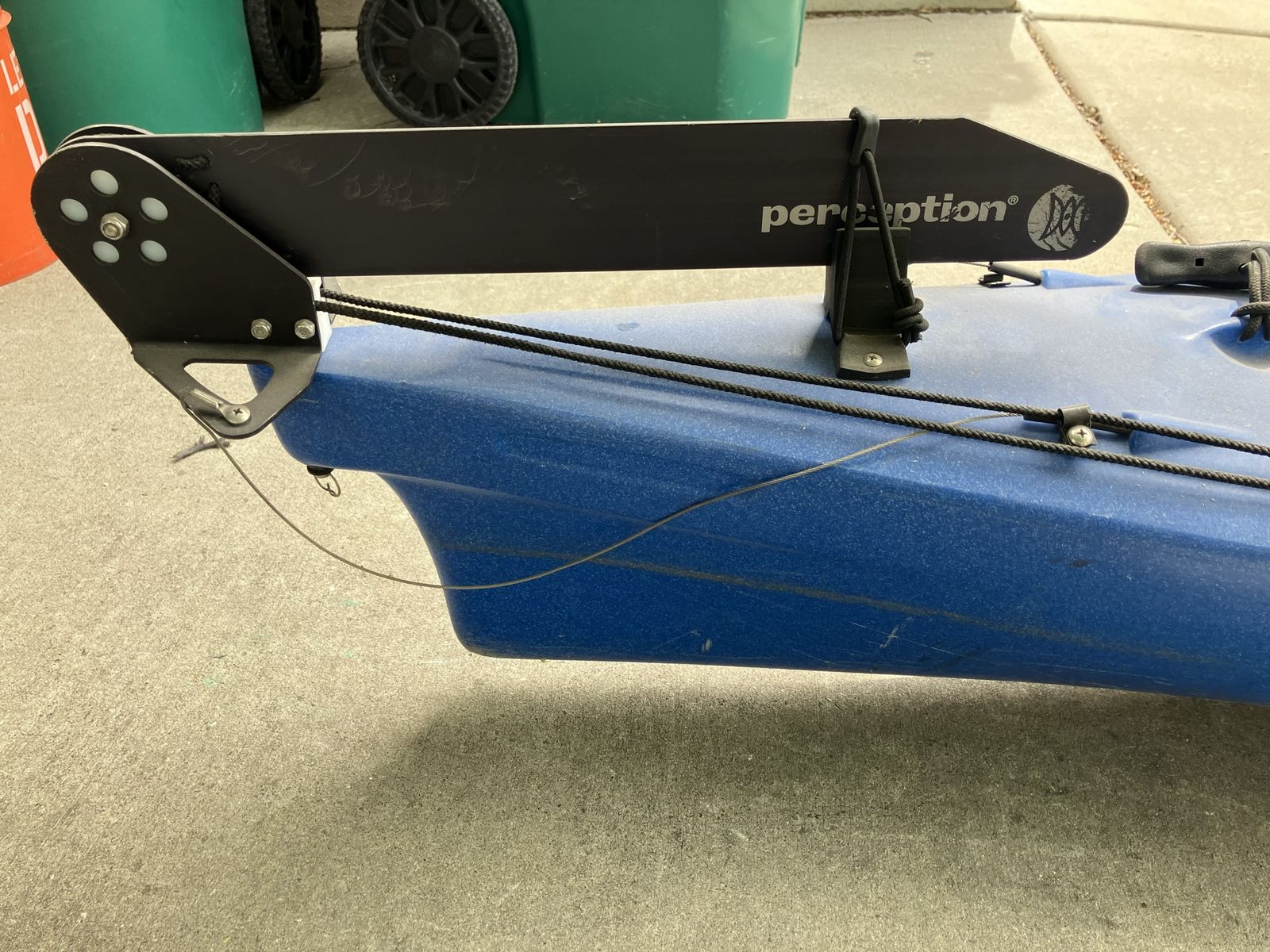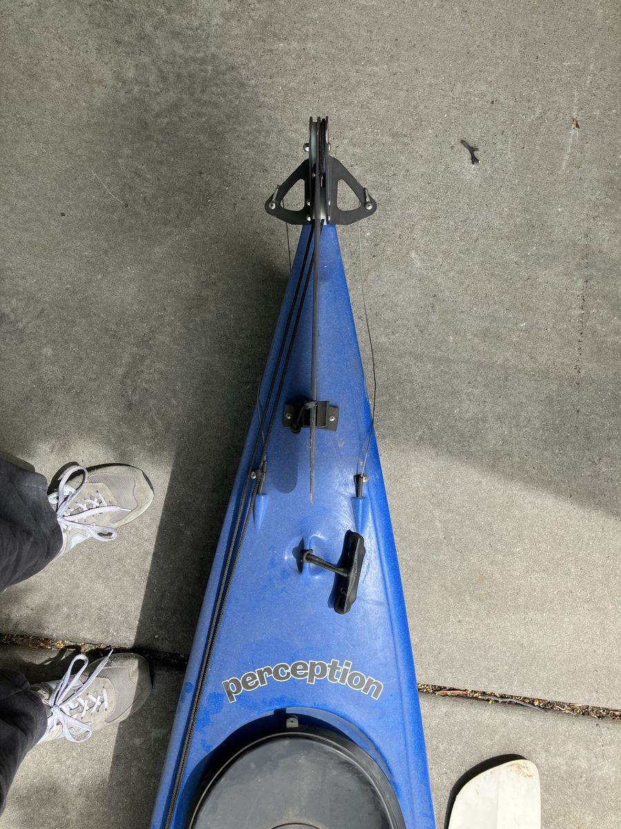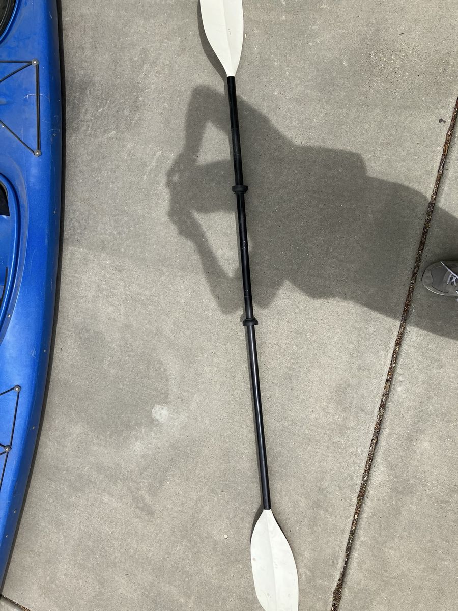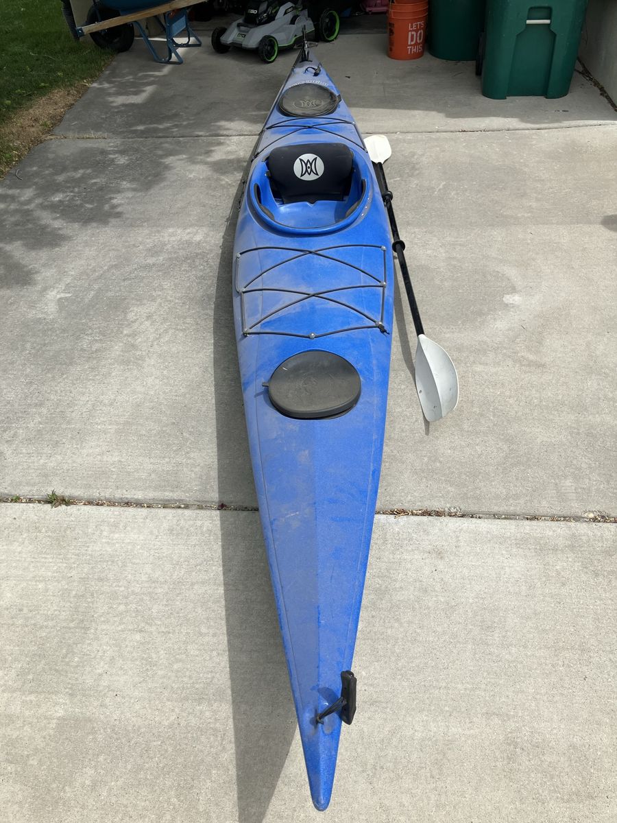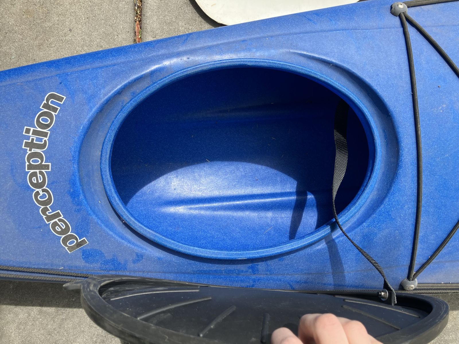 VenmoFun blue Perception kayak. Comes with a paddle. Has storage hatches at front and back and bungee cords to hold your gear. Great for getting out on the water.