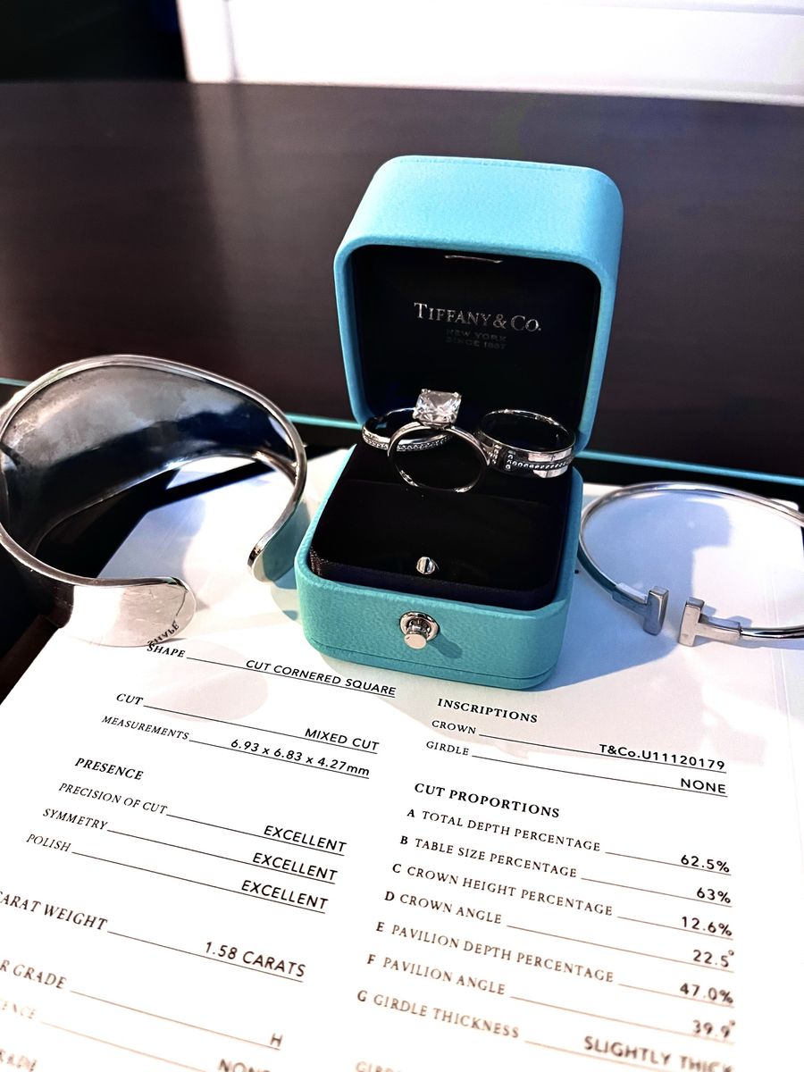 Engagement Ring. 1.58 carats, color H, Clarity VVS2 with a cut corned square mixed cut. I have all the paperwork and receipt for this. Purchased it for $28,300 plus tax as you can see in the picture. Wedding band size is 4.5. They can resize at Tiffany.