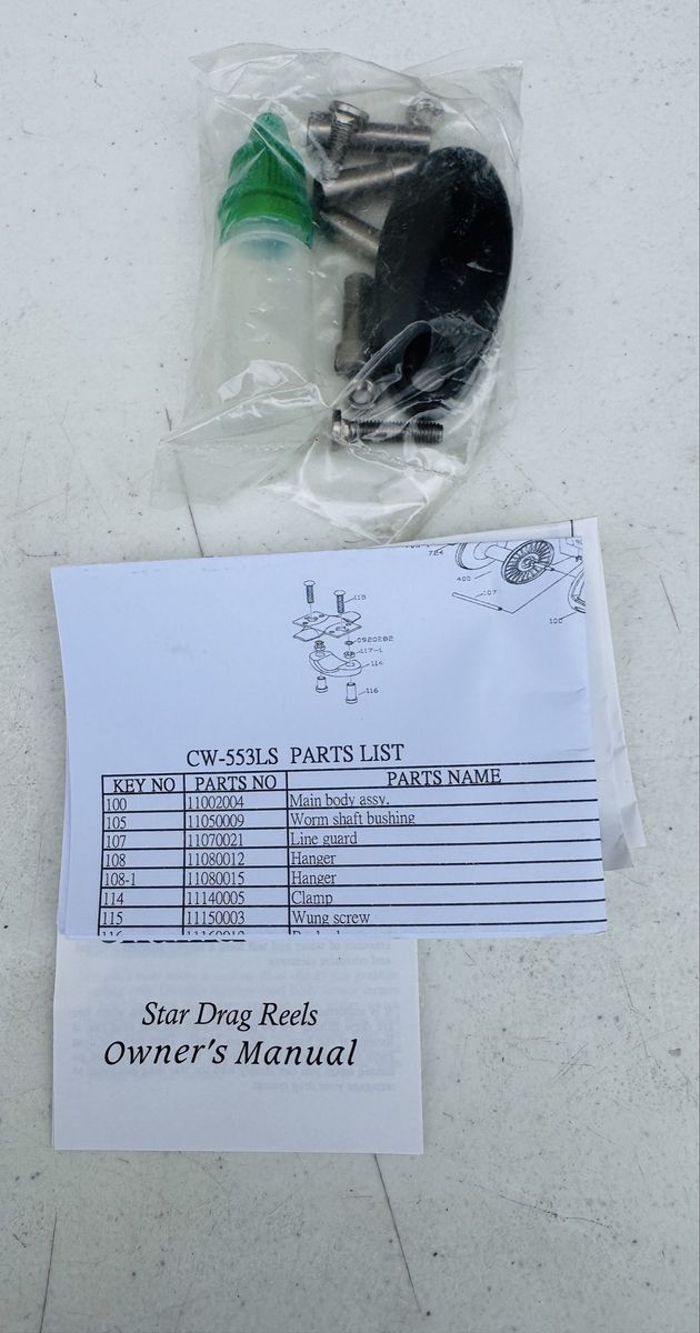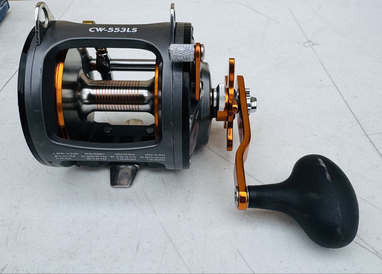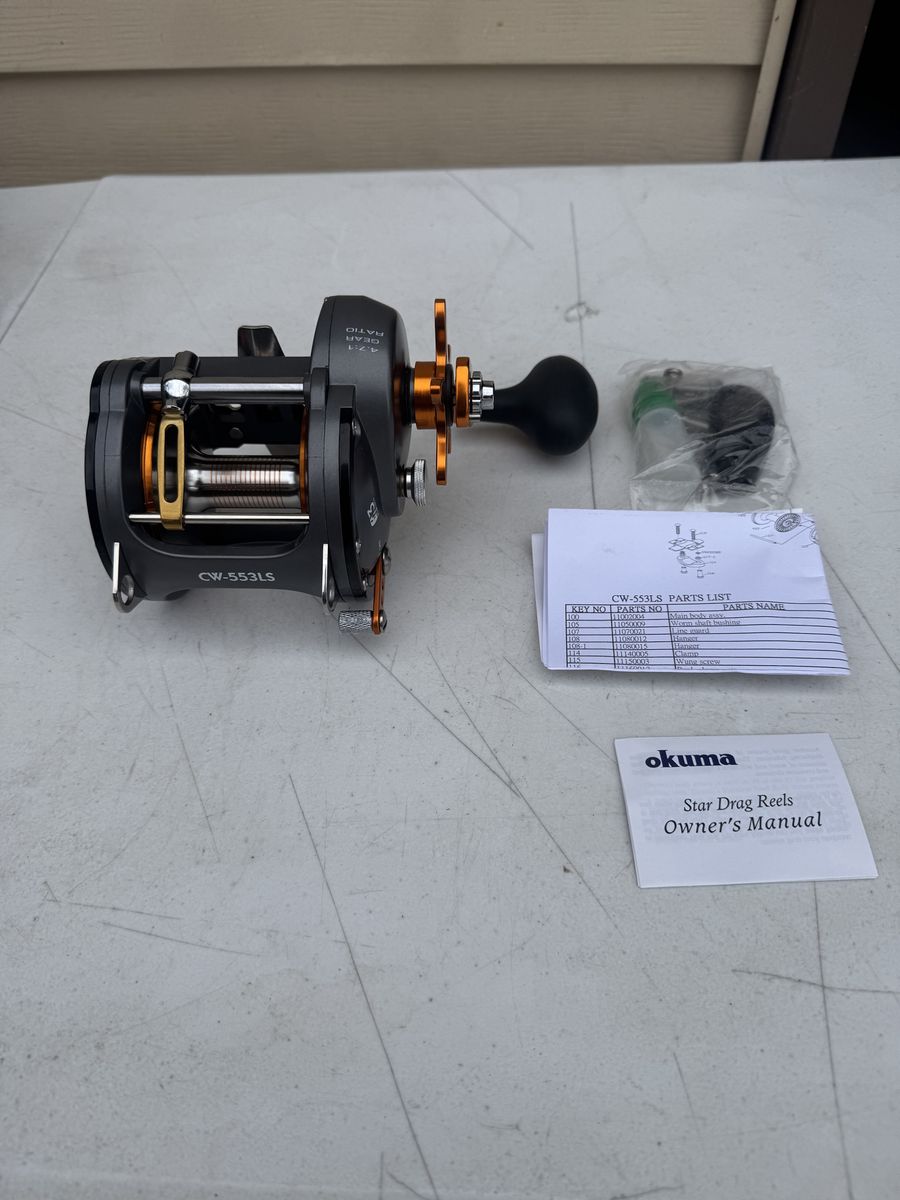 Like-new Okuma Cold Water CW-553LS trolling reel. Reel has never been used—still in original packaging. Box shows some wear from storage, but the reel itself is in excellent condition.