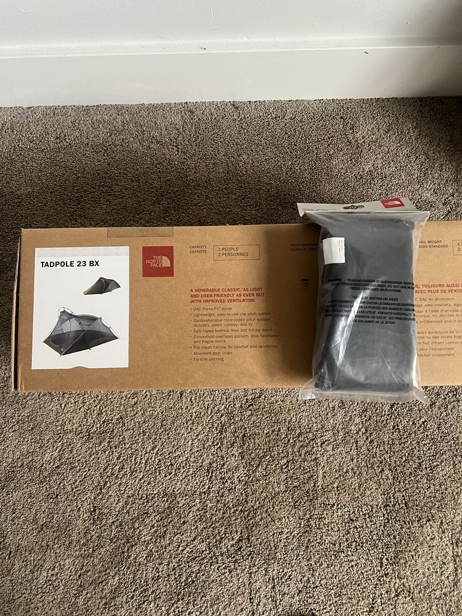 VenmoThe North Face Tadpole 23 Tent is a 2 person, 3 season, waterproof tent. Includes a Footprint. All are new and still in box and sleeve.