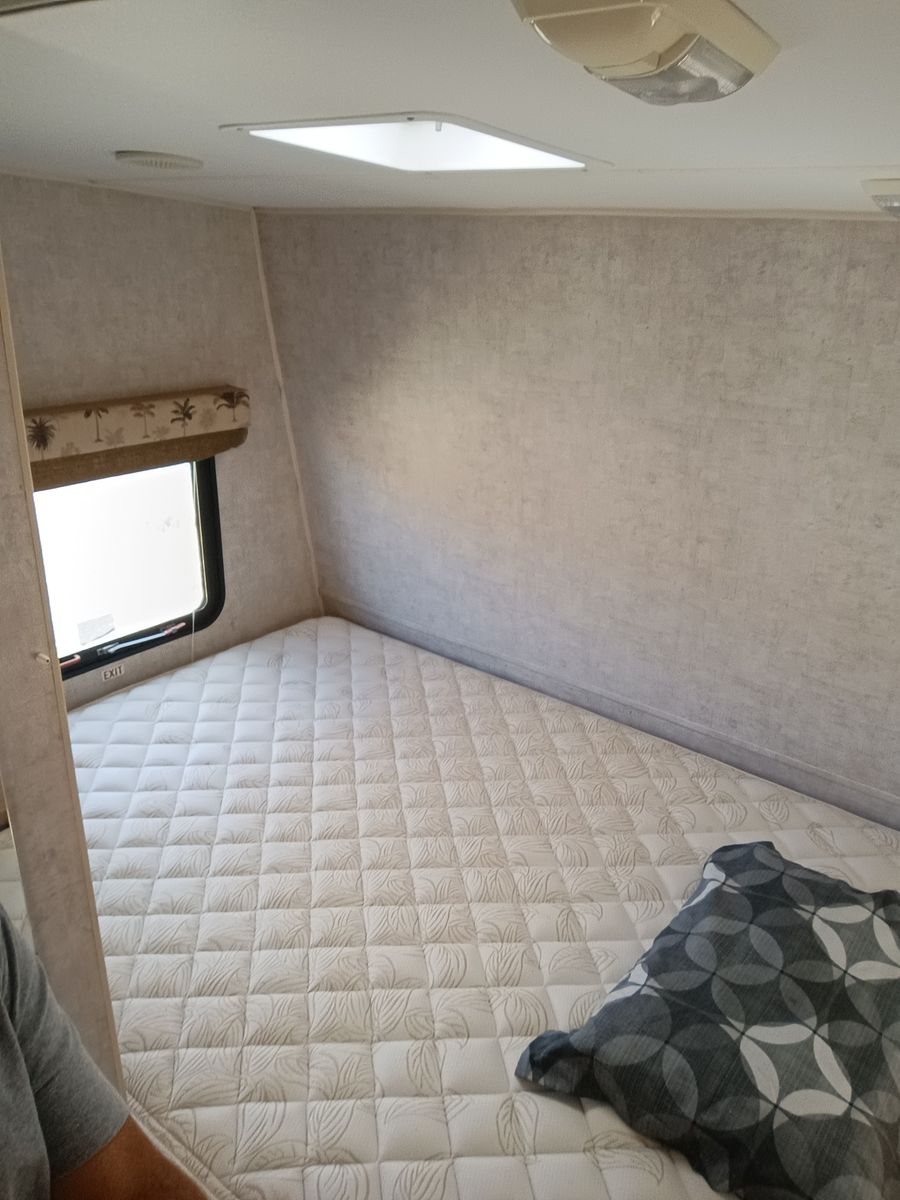 Queen bed in front and over head bed that lowers as well as both dining benches make into beds