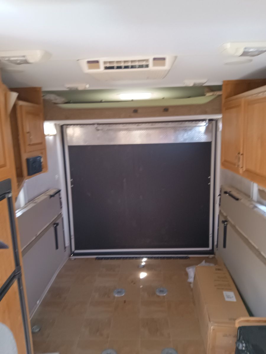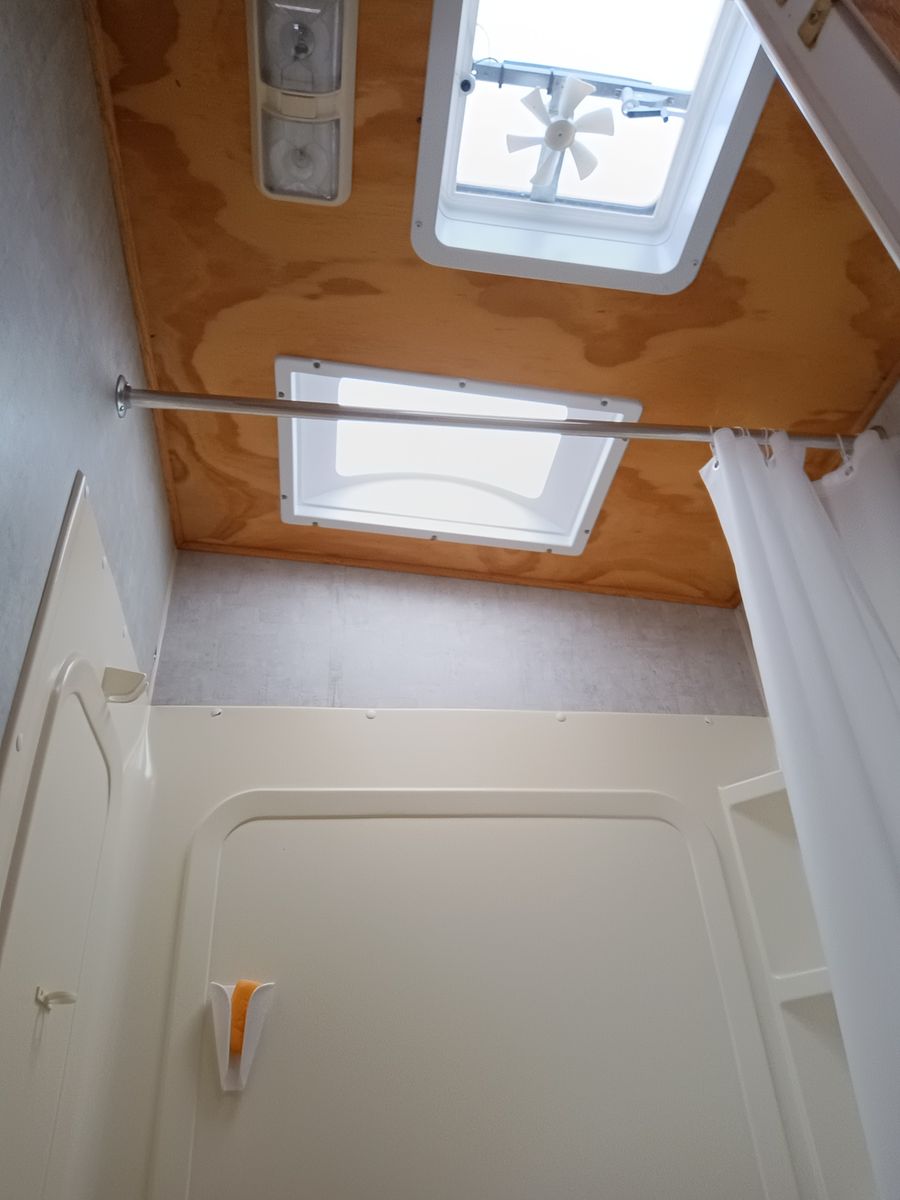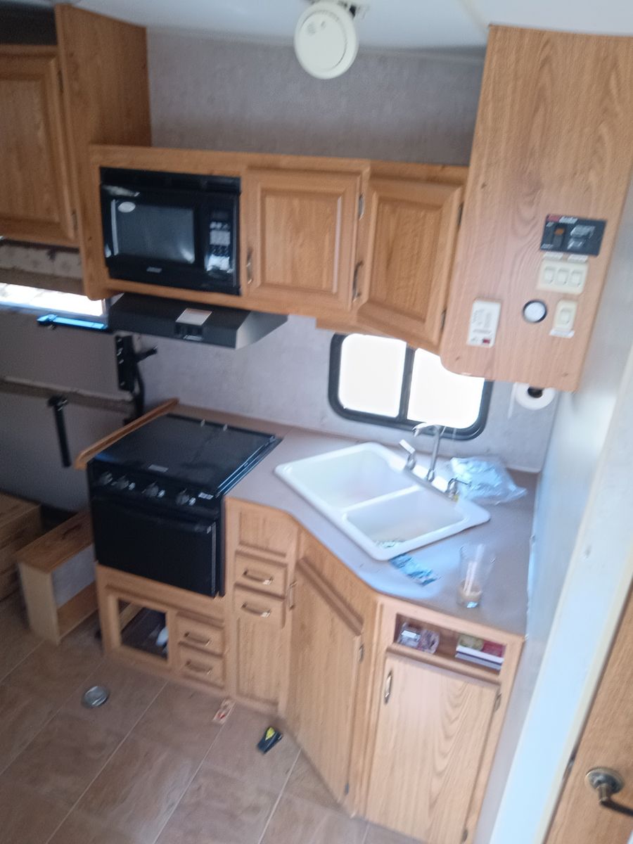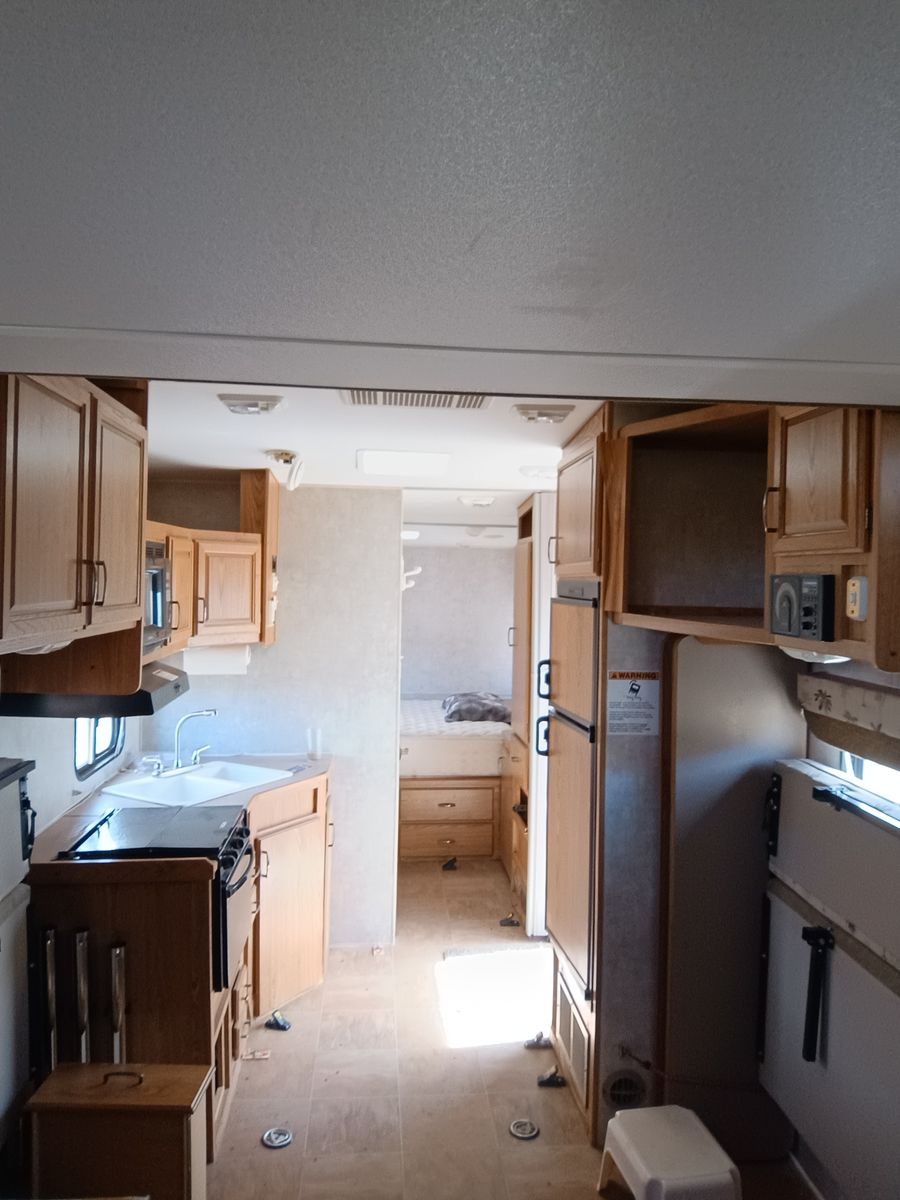 We bought it after prev owner let sit too long. We restored bathroom ceiling and vents as well as sealing up roof. Needs finished, but usable as is. No Leaks. I applied new roofing and the temp dropped as well as rained that night so roofing needs reaplied. Countertops have delaminated and need re-glued or new laminate.
