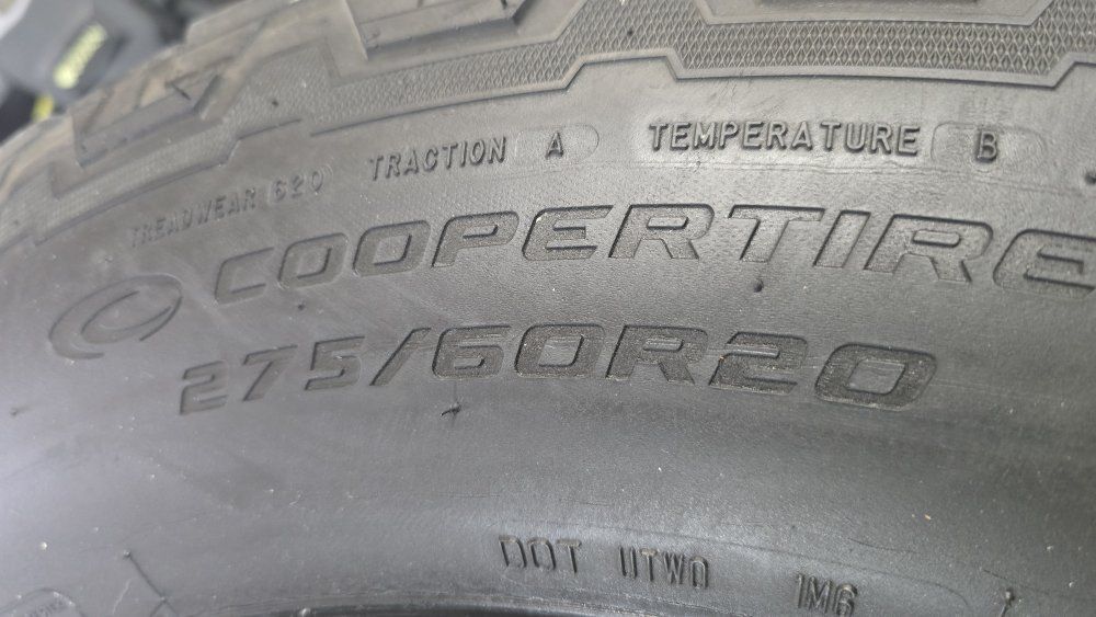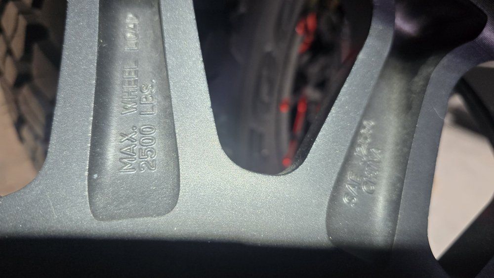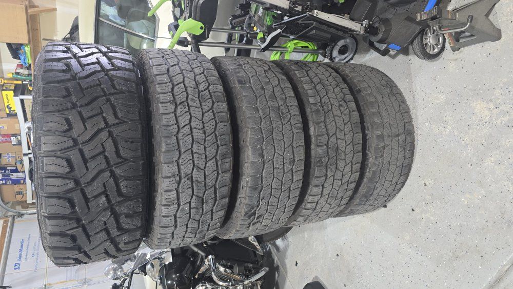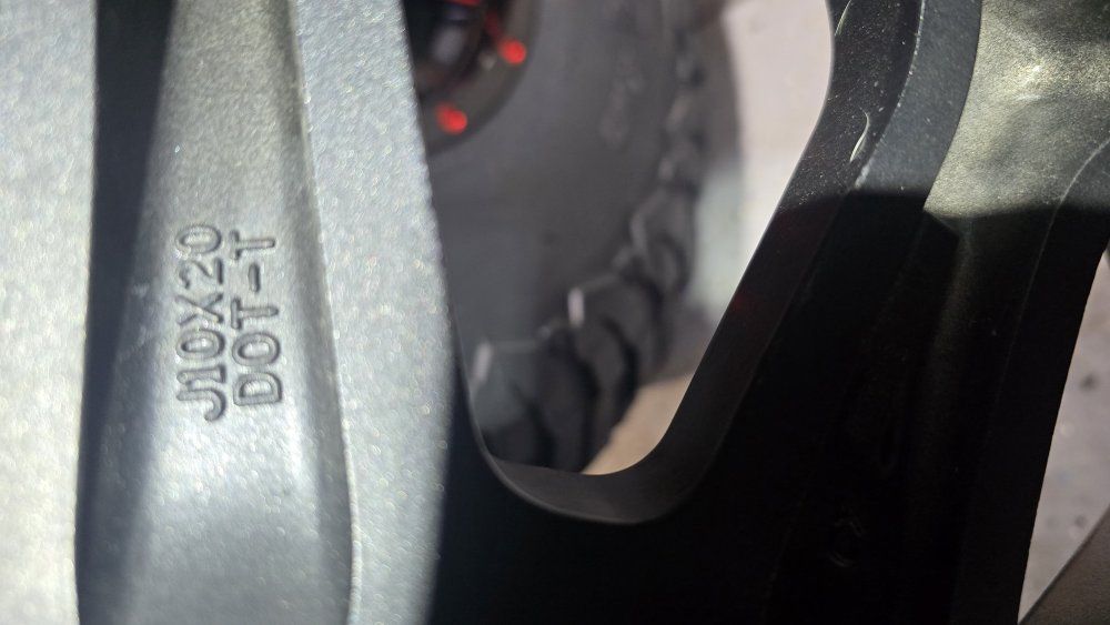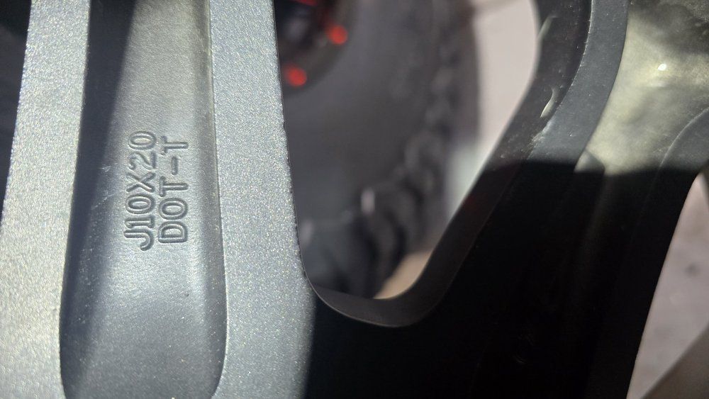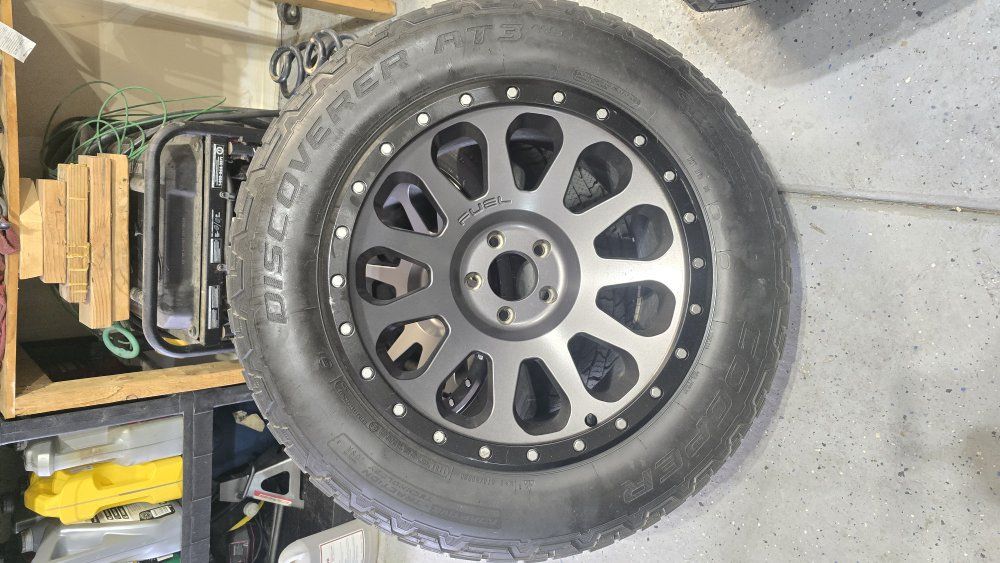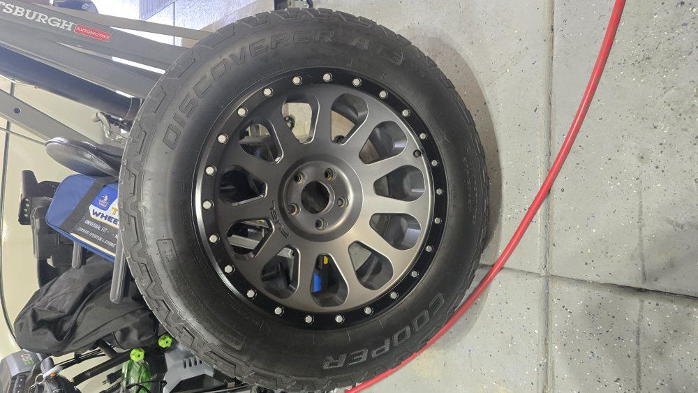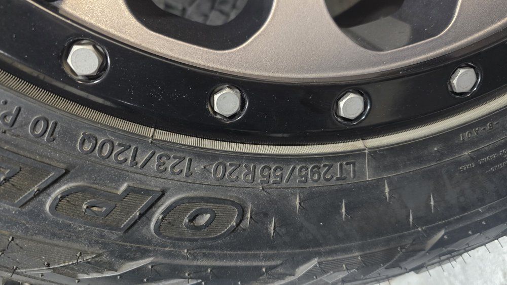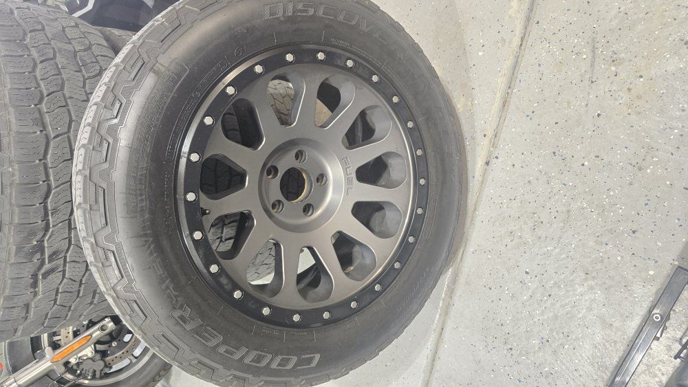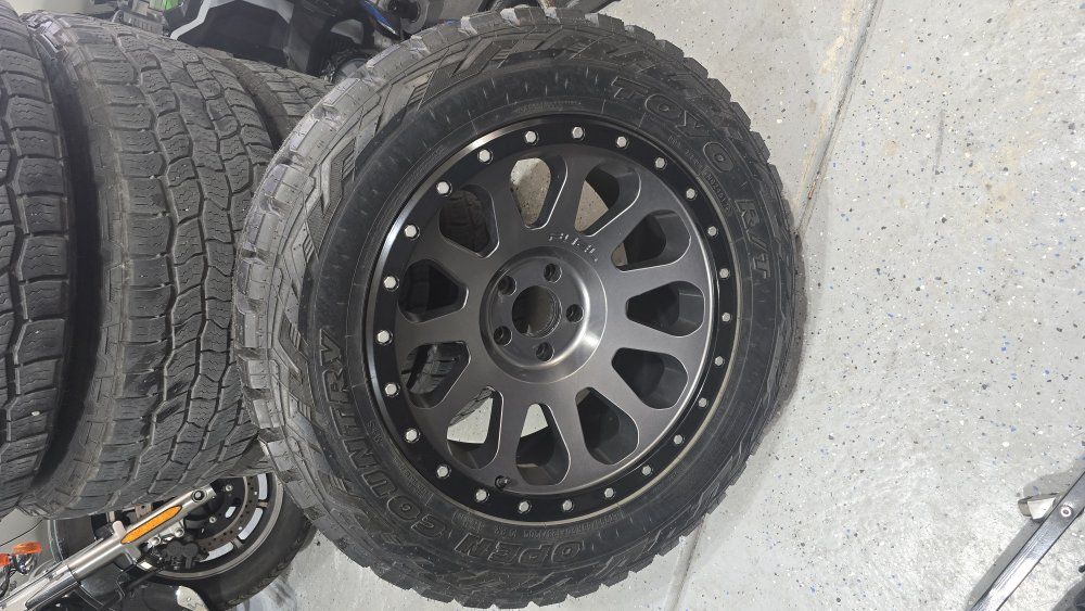 20x10 5x127 bolt pattern (Jeep JK/JL compatible) -18 offset Matte gunmetal with black beadlock-style ring Load rating 2500 lbs Discontinued color — hard to find! Tires included - 4 of a Discoverer AT3 275 60/R20, with about 8/32 tread still. the 5th tire (spare) is a Toyo R/T Open Country LT 295/55 R20, that has never been on the ground! These came off of a stock Jeep JKU. no rubbing, great ride and handling. Wheels are in near excellent condition.