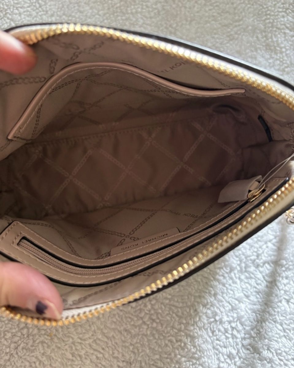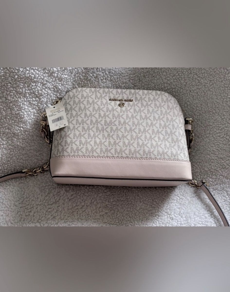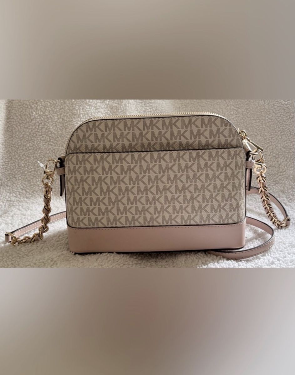 Brand New!!! Michael Kors Crossbody Bag Never used or worn Color-Pink /Gold chain Gold zipper closure on top w/side pocket inside Gold name & logo on front Logo Lined Interior Design: A structured dome silhouette with a zip-around top closure. • Material: Crafted from a blend of PVC/cotton/ polyester (logo canvas) and 100% leather trim. • Hardware: Features gold-tone hardware, including the Michael Kors lettering and a chain-link detail on the strap. • Interior: Typically includes a back zip pocket and a front slip pocket for organization.