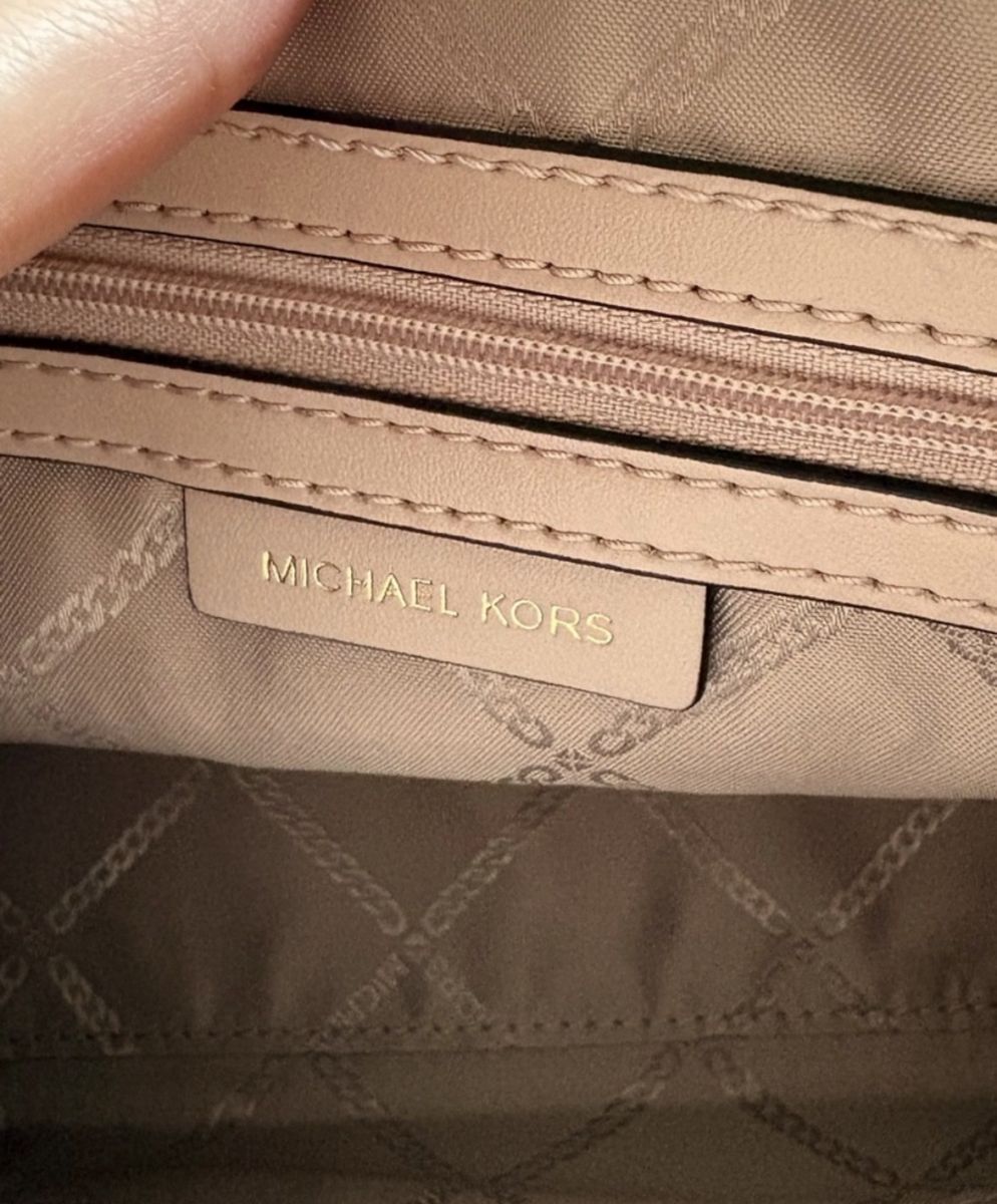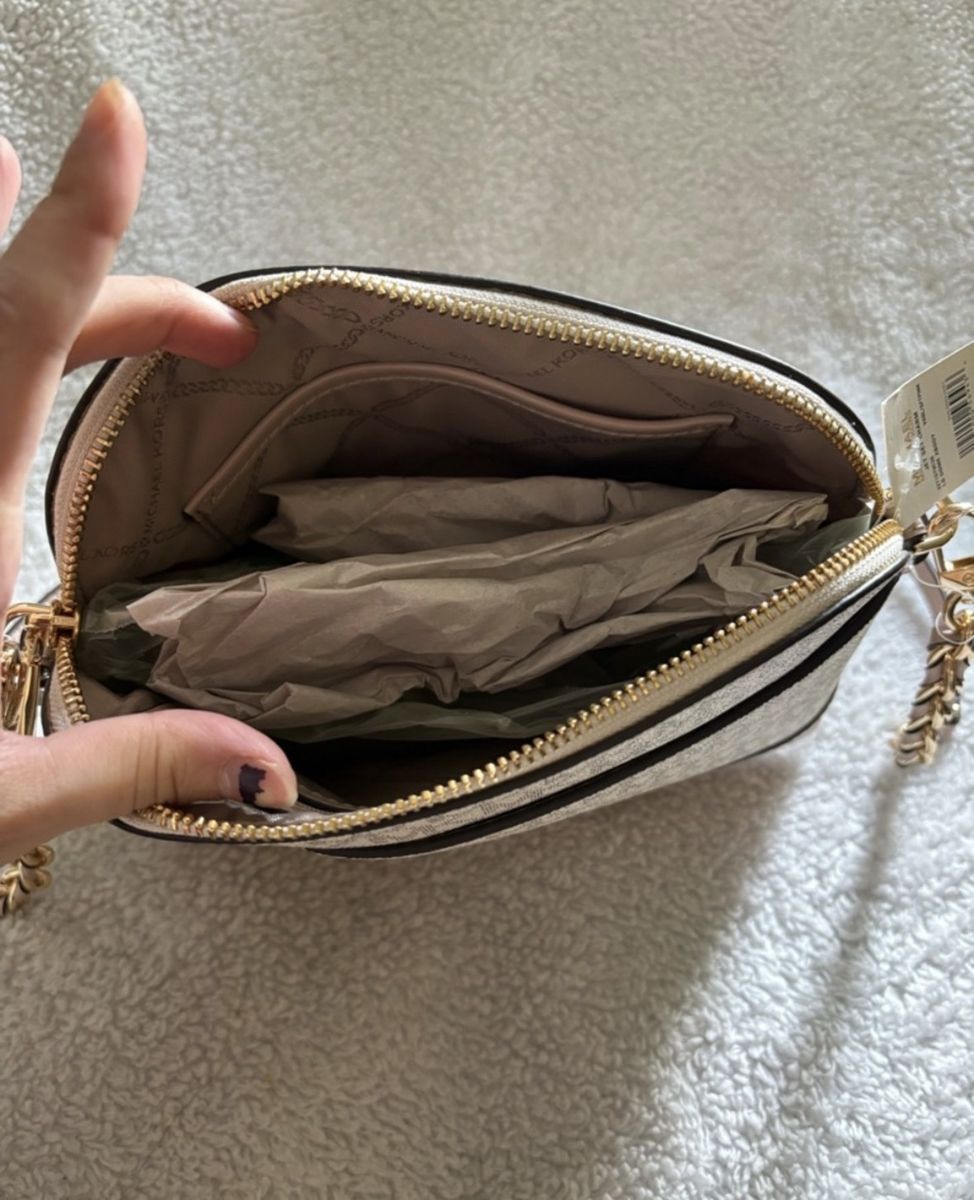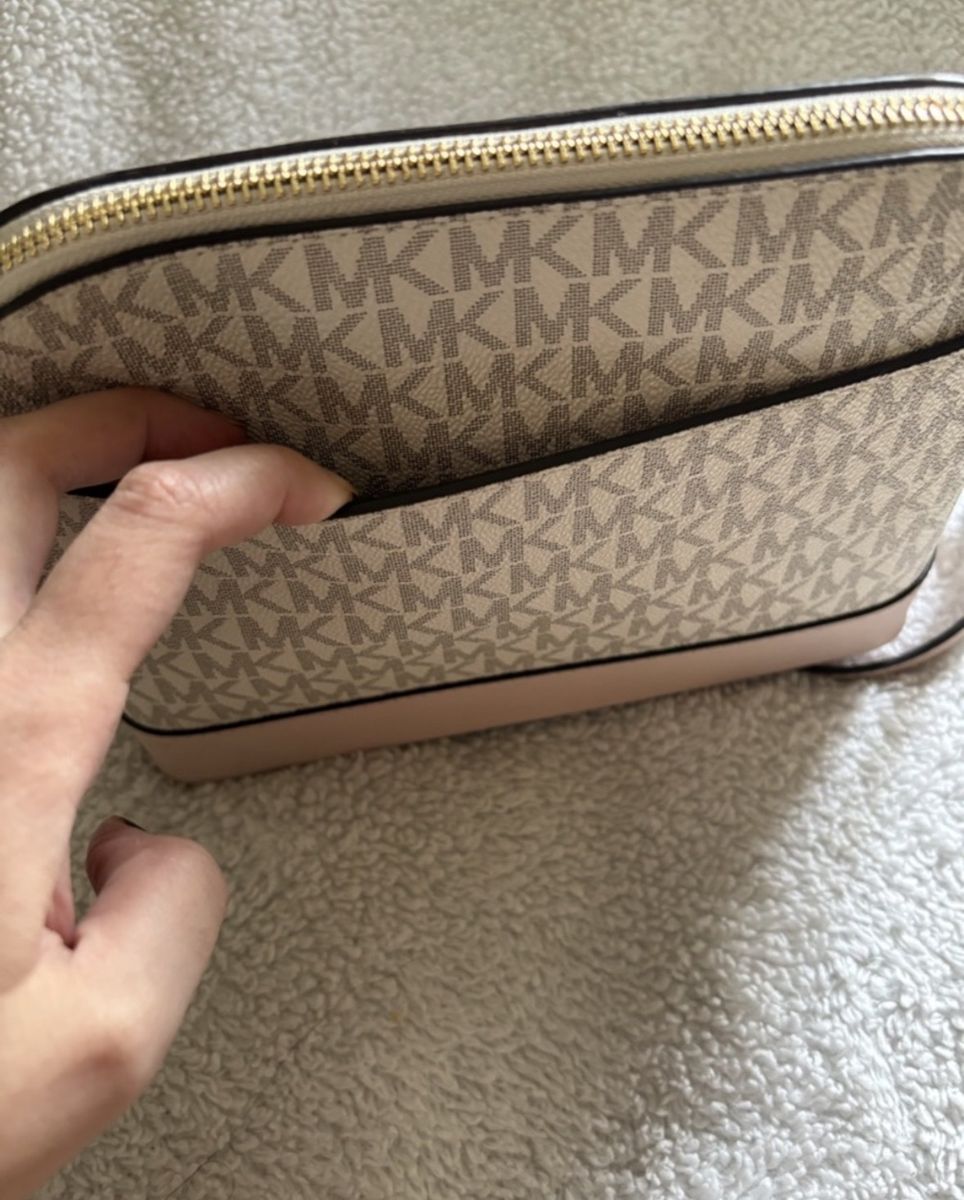 Brand New!!! Michael Kors Crossbody Bag Never used or worn Color-Pink /Gold chain Gold zipper closure on top w/side pocket inside Gold name & logo on front Logo Lined Interior Design: A structured dome silhouette with a zip-around top closure. • Material: Crafted from a blend of PVC/cotton/ polyester (logo canvas) and 100% leather trim. • Hardware: Features gold-tone hardware, including the Michael Kors lettering and a chain-link detail on the strap. • Interior: Typically includes a back zip pocket and a front slip pocket for organization.