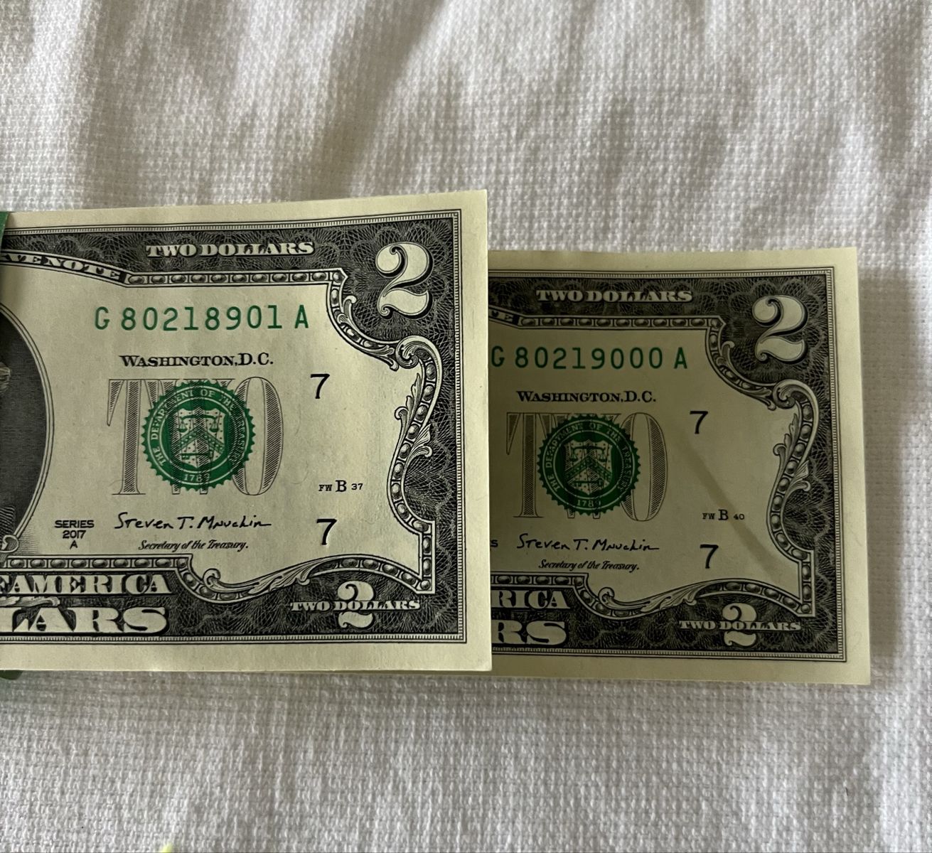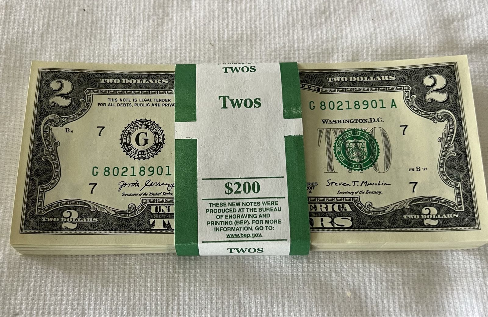 ApplePayThe 100 Crisp Uncirculated Consecutively Numbered $2 Bills in the photos above. Ending in …8901 to 9000. 2017 A Series. still in original federal reserve sleeve. Asking $240 for all 100 $2 bills shown in the photos.