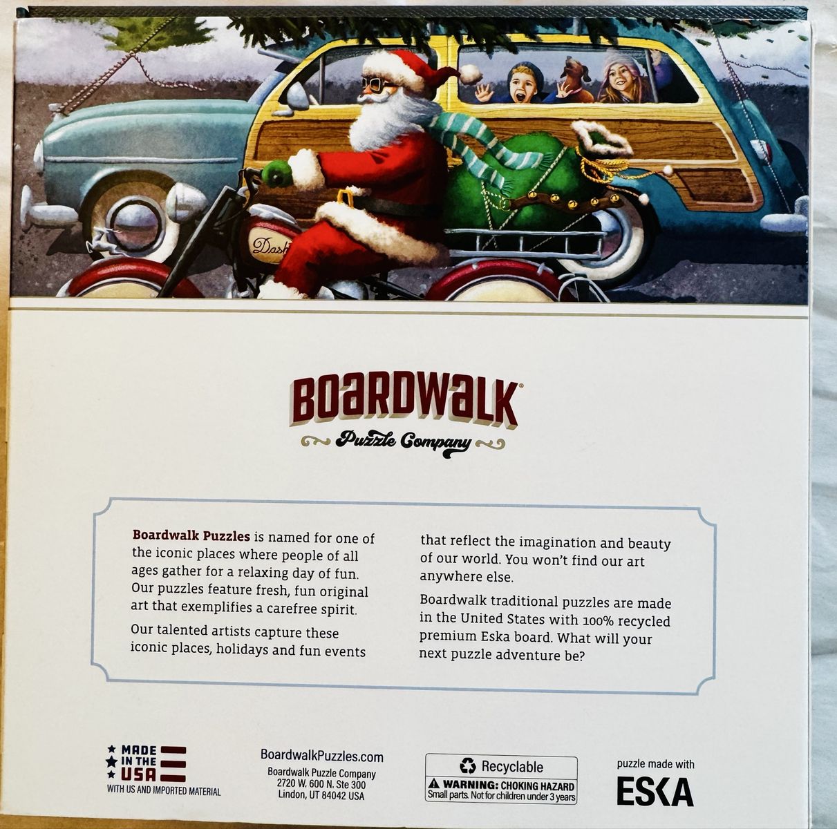 Motorcycle Santa jigsaw puzzle by Boardwalk Puzzle Company, featuring artwork by Andy C. Ellis.