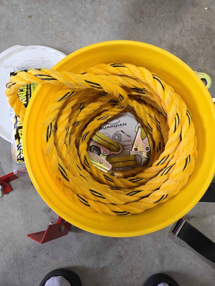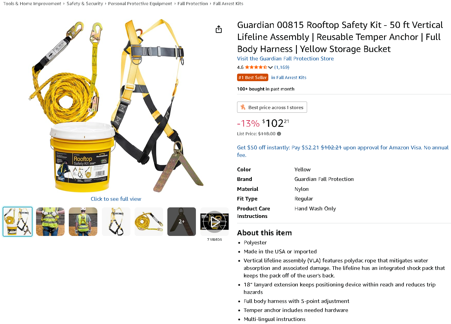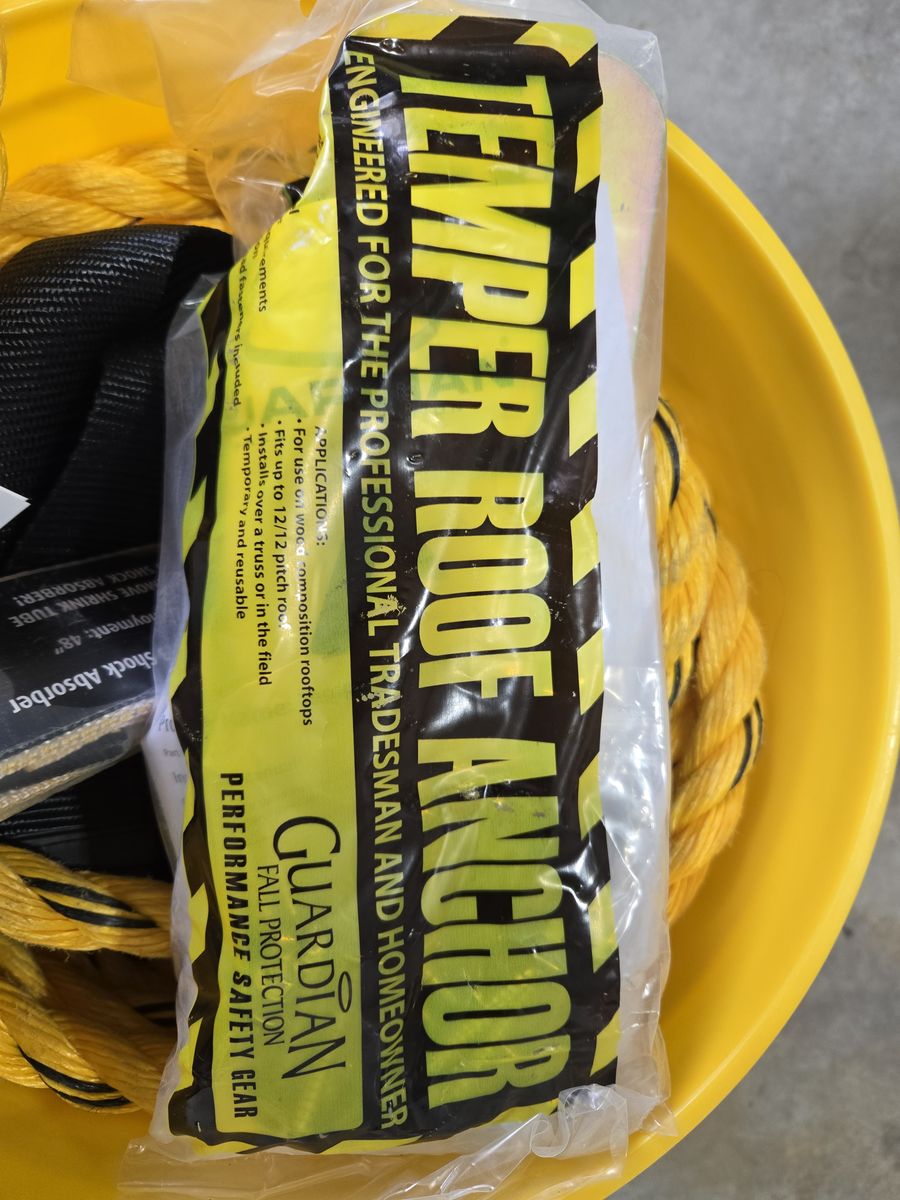 VenmoRooftop safety kit with 5-point full body harness, 50' Vertical Lifeline Assembly, and Temper rooftop anchor.