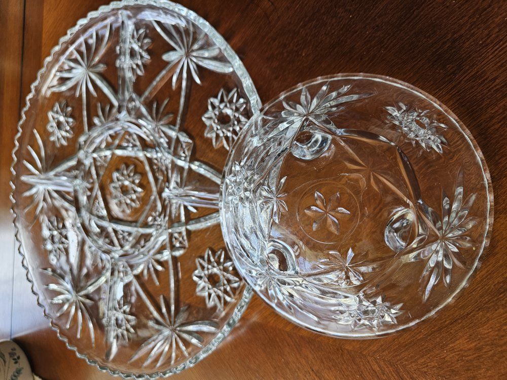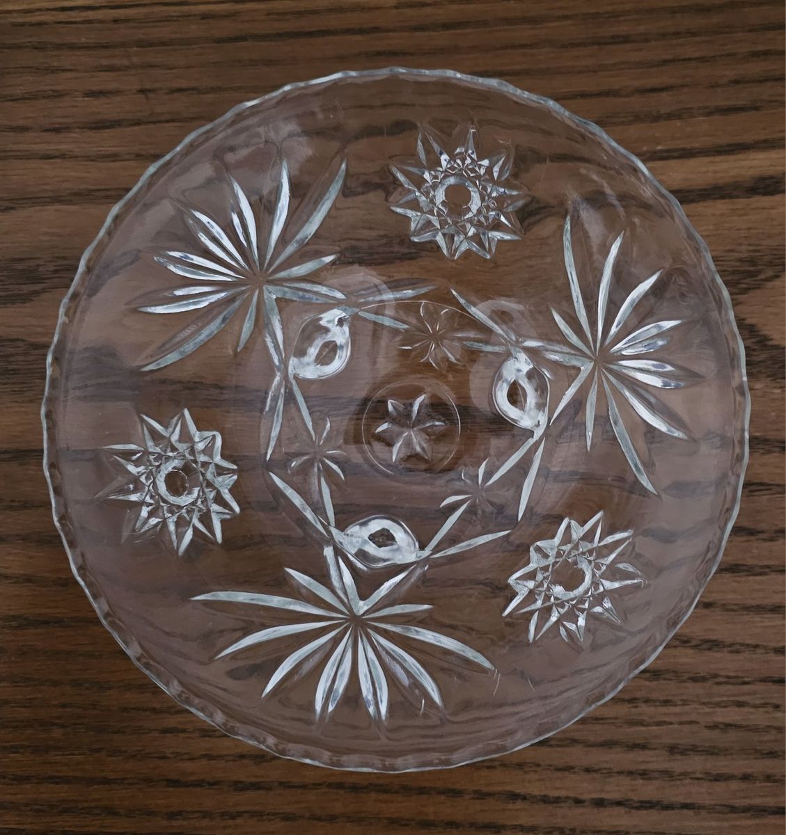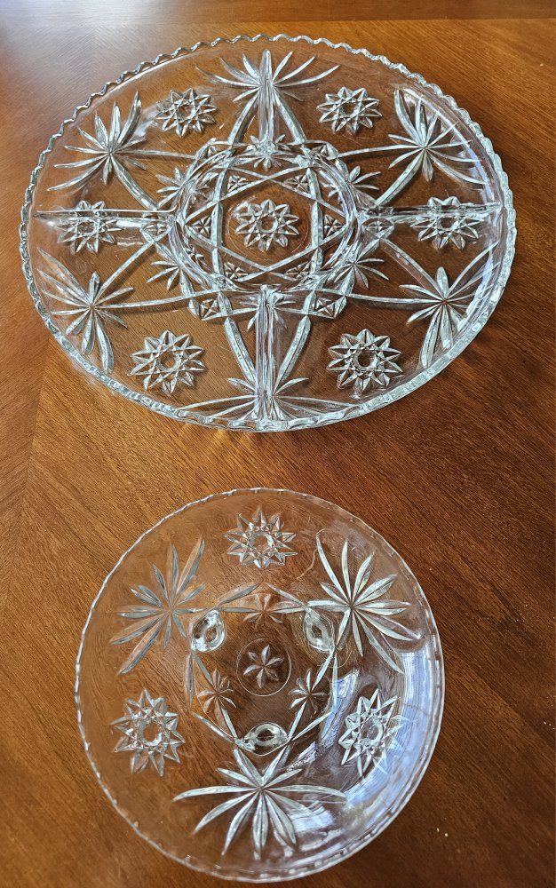 VenmoFeatures the Star of David or Starburst pressed glass design. 1960's The platter is 13.5" in diameter. Candy dish is almost 7" in diameter. Clear heavy glass with scalloped or sawtooth rim. Beautiful platter and candy dish. Platter - $25 Candy Dish - $15 Both - $35