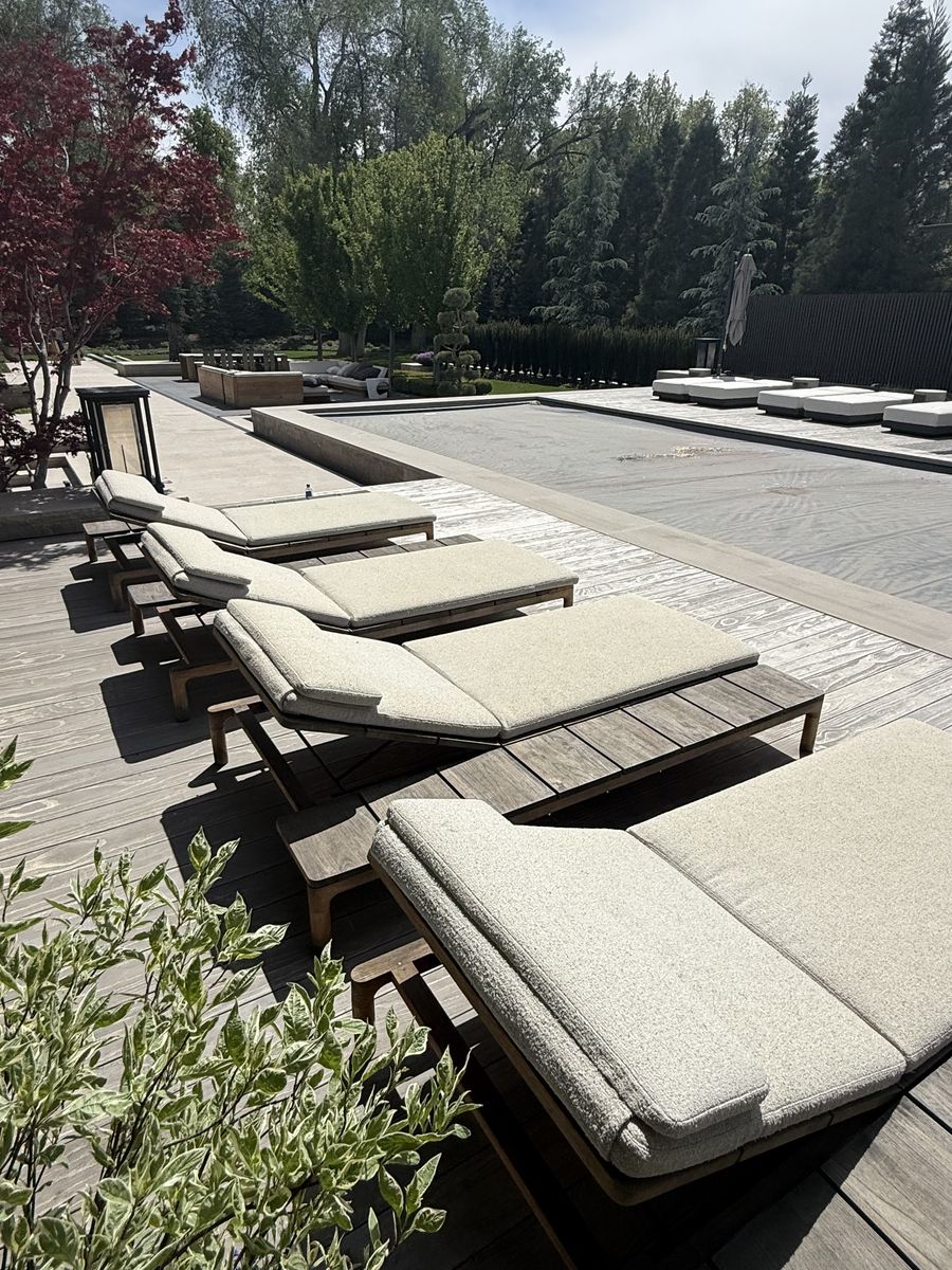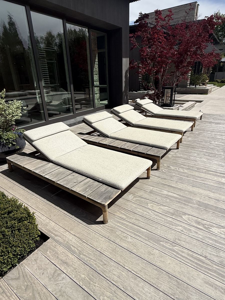 Set of three authentic luxury outdoor chaise lounges from the Franck Collection by Sutherland Furniture, designed by Vincent Van Duysen. Premium solid teak frames with high-end outdoor cushions. These are designer-grade pieces originally sourced for a luxury property.