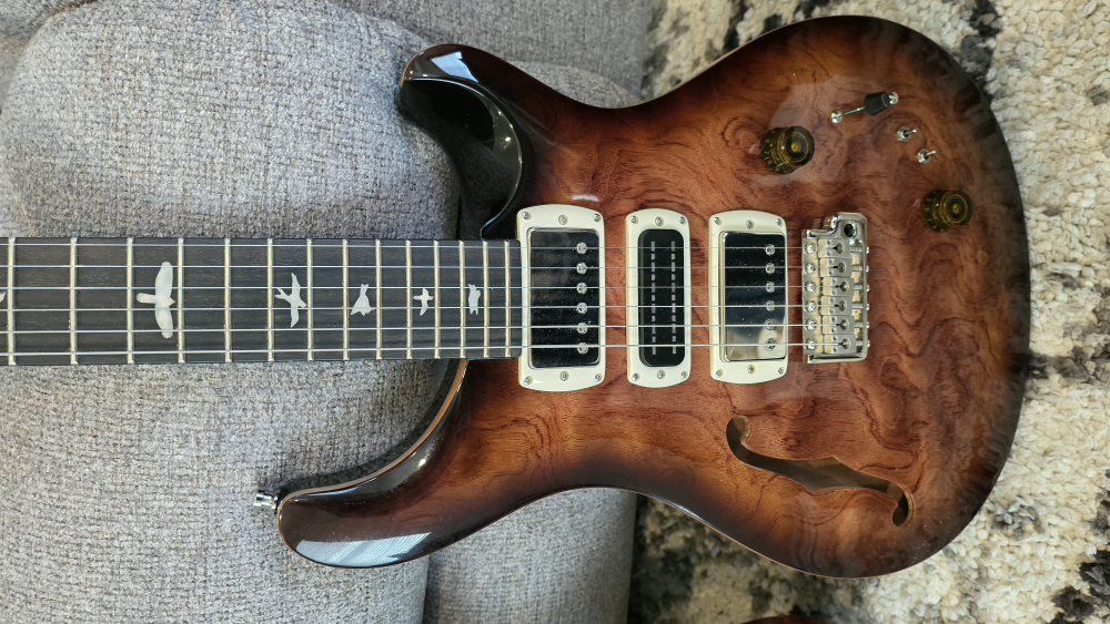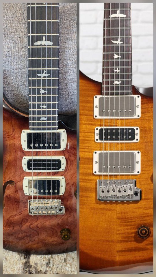 Venmolatest guitar purchased 10/25, upgraded to locking tuners $105 and white wingtip tuners buttons $20 this is a Sweetwater exclusive model @$1199 or $1420 w/tax. modded it to look like the s2 version with the white lockers and reversed rhythm pickup, also made headstock look like s2 (see comparison pics). In new condition with very little playing time (I have 9 guitars and my arthritis is making me play less.) This version comes unique with a Bubinga top instead of maple. Designed for players who refuse to be pigeonholed into one playing style or genre, the PRS SE Special Semi-Hollow electric guitar delivers a vast palette of tonal possibilities and a versatile build to match. This mahogany-bodied semi-hollowbody guitar sports a maple neck with a Wide Thin profile, a 22-fret rosewood fingerboard, and a figured maple top with a slotted F-hole for a sound bursting with natural resonance and tone. Combine this organically rich foundation with a pair of coil-tapped 58/15 “S” humbuckers at the bridge and neck and a Narrowfield DD “S” in the middle position, and you’ll be just as comfortable cranking out high-octane riffage as you will be maneuvering silky single-note jazz runs. Adaptable, reliable, and a pleasure to play, the SE Special Semi-Hollow is right at home in any style or genre. Explore an expansive tonal palette