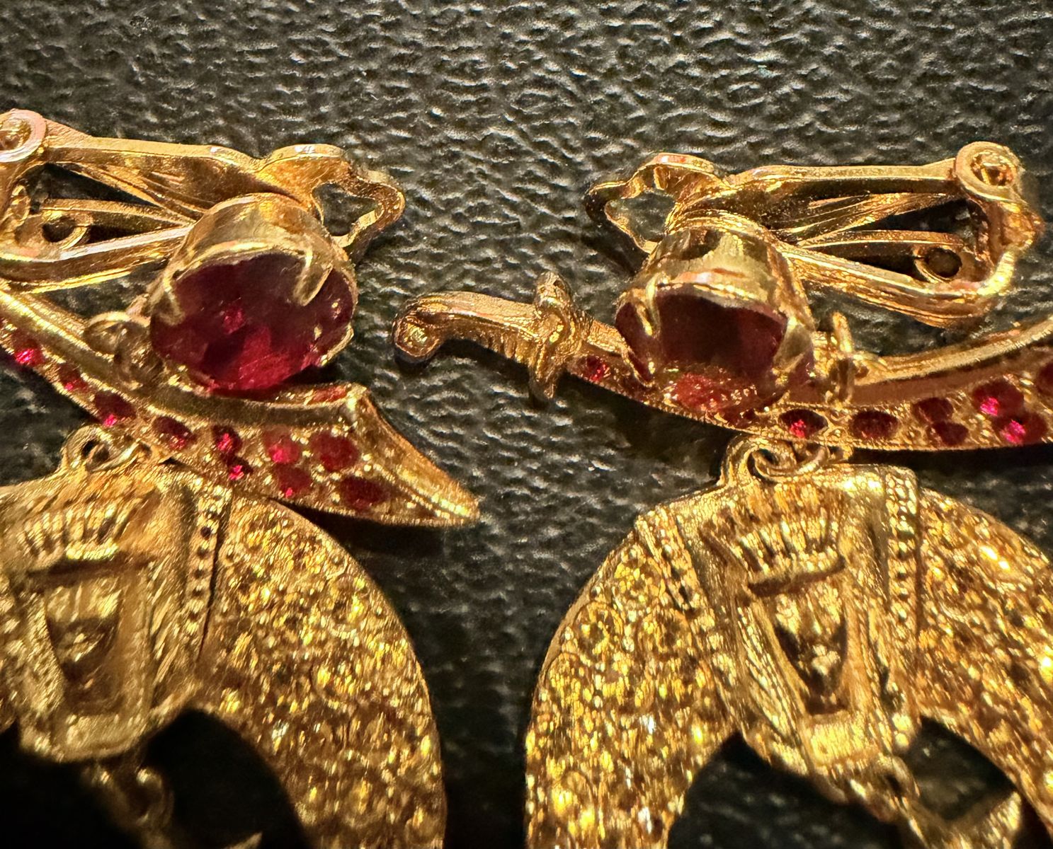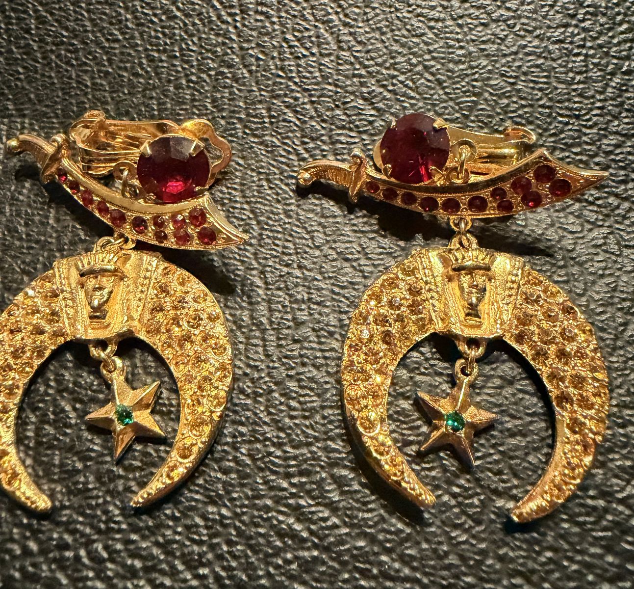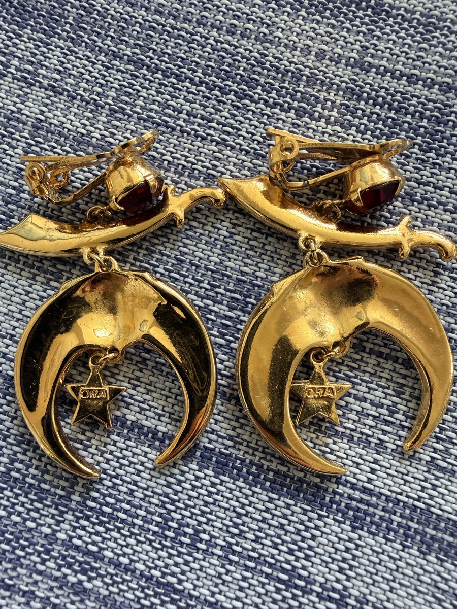 These ornate and vintage collectable gems are Masonic Shrine Dazzler clip-on earrings. These pieces are typically used by members of the Shriners (Ancient Arabic Order of the Nobles of the Mystic Shrine) and they feature iconic fraternal symbols including the Scimitar with red rhinestones, the Crescent Moon with golden or amber-colored rhinestones and a pharaoh's head at the center. The dangling five-pointed star has a single central green rhinestone. Agnini & Singer is the company that manufactured these earrings as well as much of the fraternal and Masonic jewelry produced. The "ORA"found on the back of the piece is a combination of the first names of the company's founders, Oreste Agnini and Ralph Singer. While the company was founded in the early 1920s, the "ORA" mark wasn't used until the late 1930s or early 1940s. Most pieces found today date from the 1940s through the 1950s.ORA jewelry was known for high-quality costume jewelry.