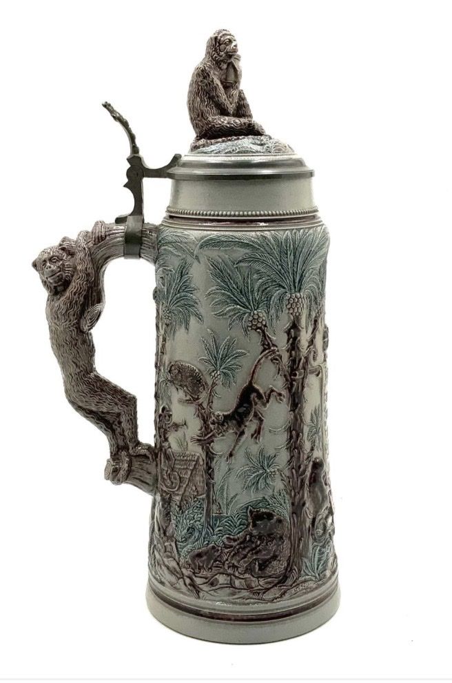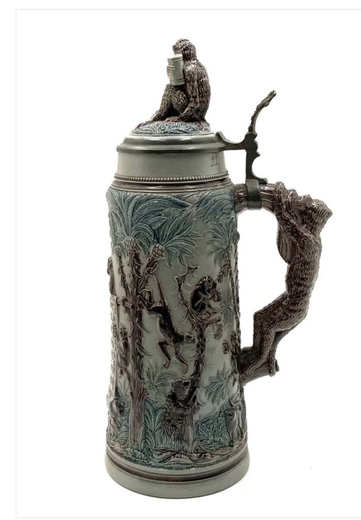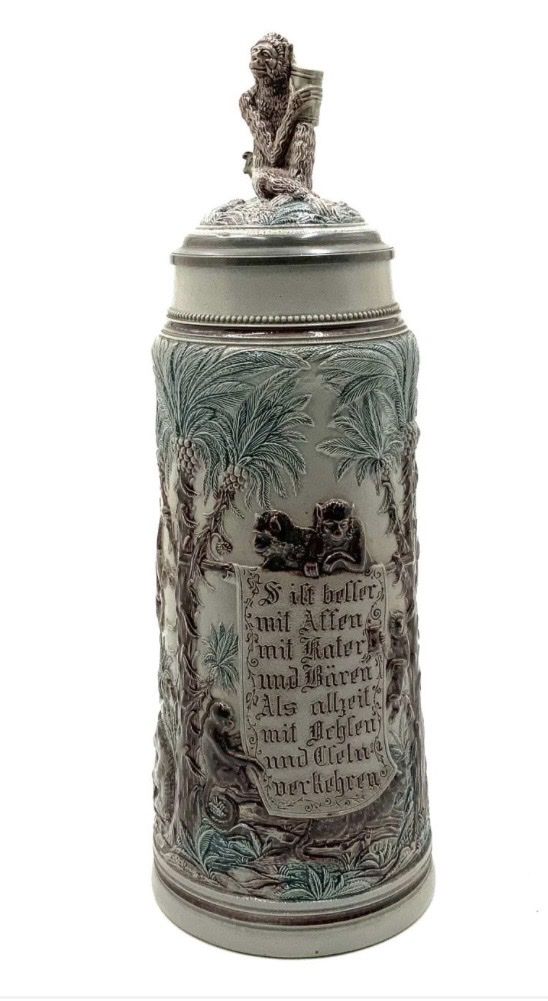 VenmoA 2-Liter Stein. The Script on the Stein reads in German "It is Better to Associate with Monkeys, with Tomcats, and with Bears, rather than with Oxen and Donkeys". The Stein is Excellent Condition, and measures 14" Tall.