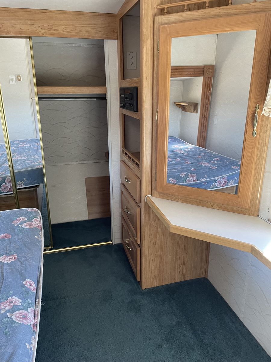 Bedroom pullout has a twin bed, large, mirrored closet, cabinets.