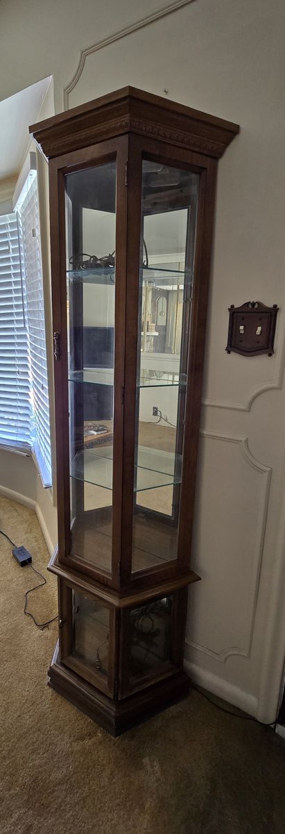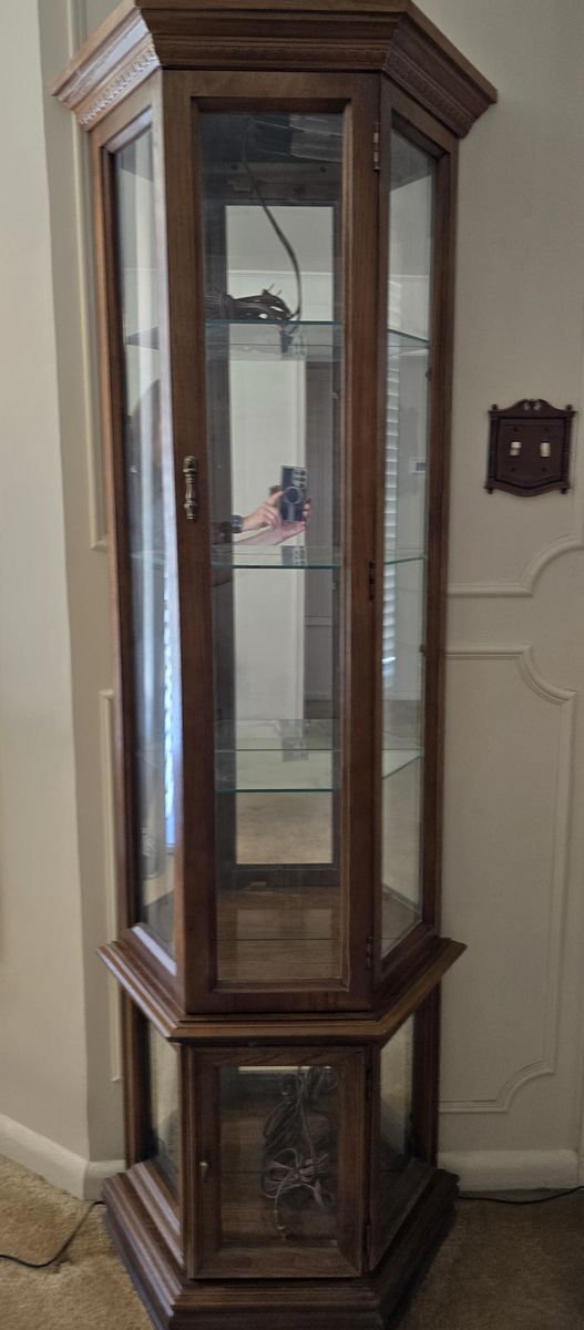 Interior lighting, 3 glass shelves, mirrored back, and separate display area at the base. In good condition. Measures 70 1/2 in tall, 24 1/2 in wide and 10 1/2 in deep.