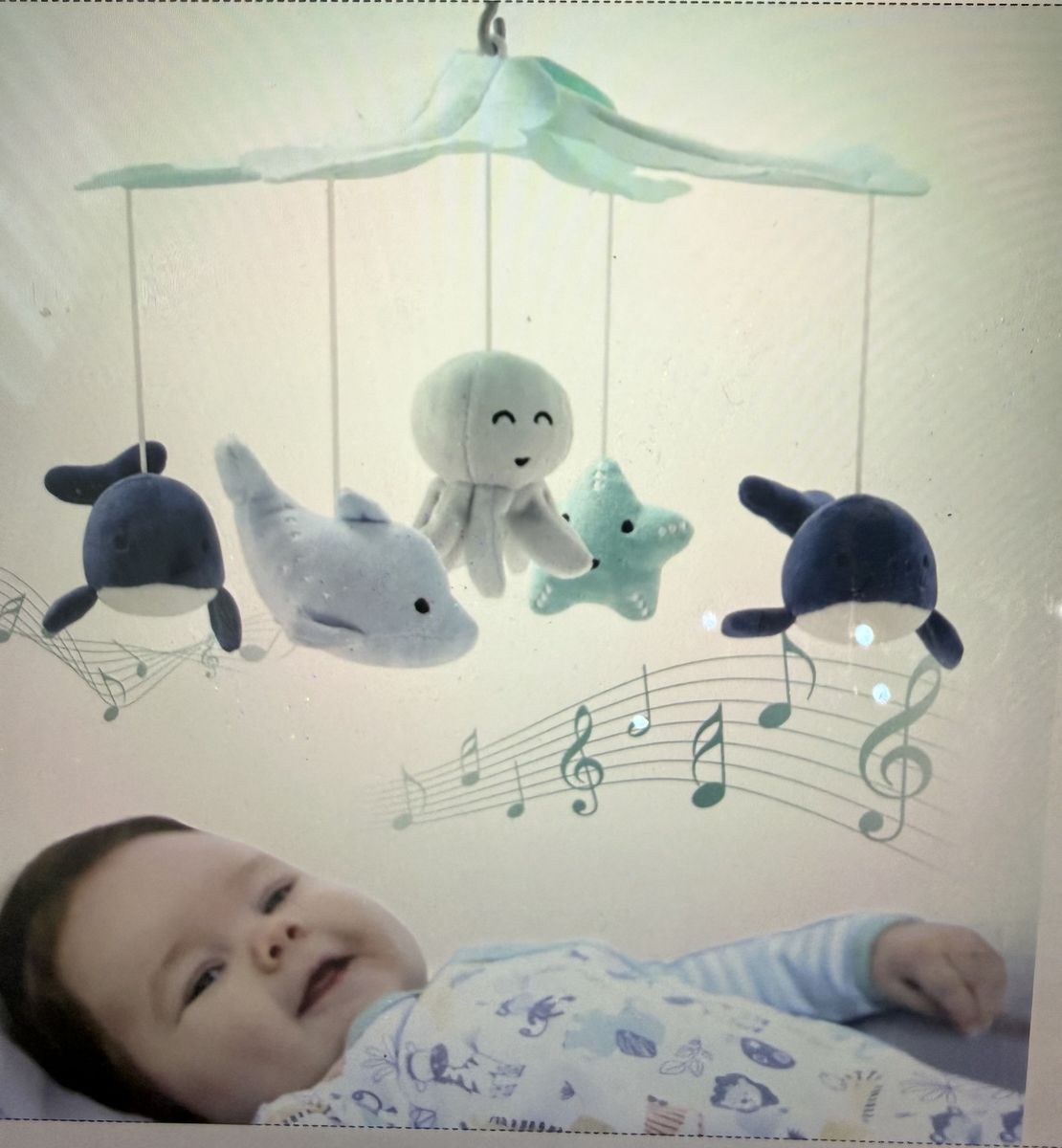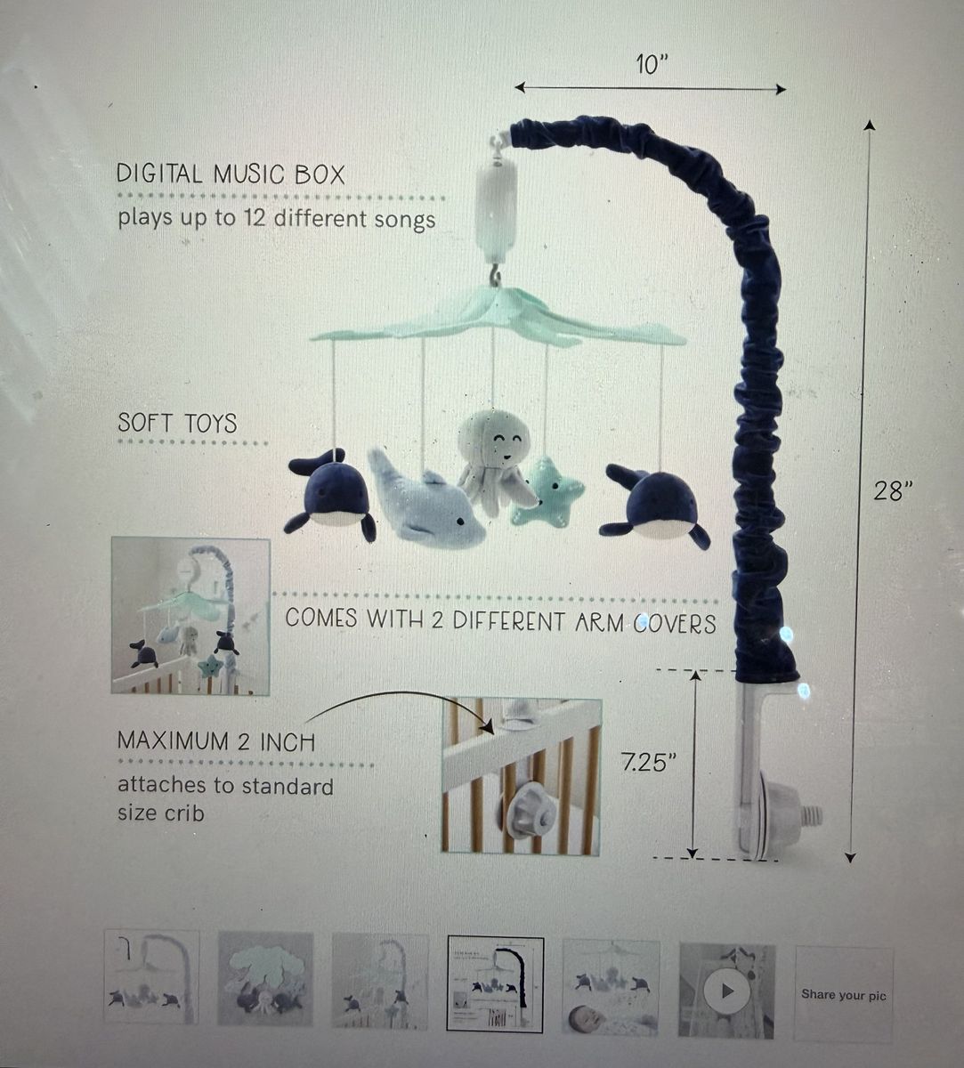VenmoSealife Musical Mobile by The Peanutshell helps to promote baby's auditory development, motor skills and visual stimulation. Our expertly designed nursery must-have features plush velour whales, a dolphin, octopus, and starfish characters in various blue tones under scalloped aqua arm covers. The digital music box plays snippets of 12 different lullabies to soothe your little one gently to sleep. Easily switch music on/off or between songs with the simple touch of a button. Two velour arm covers in light and navy blue are provided for a customized designer look. This item coordinates perfectly with our Nautical 3 Piece Crib Set and 4 Pack Fitted Sheets. Requires two AA batteries that are not included.