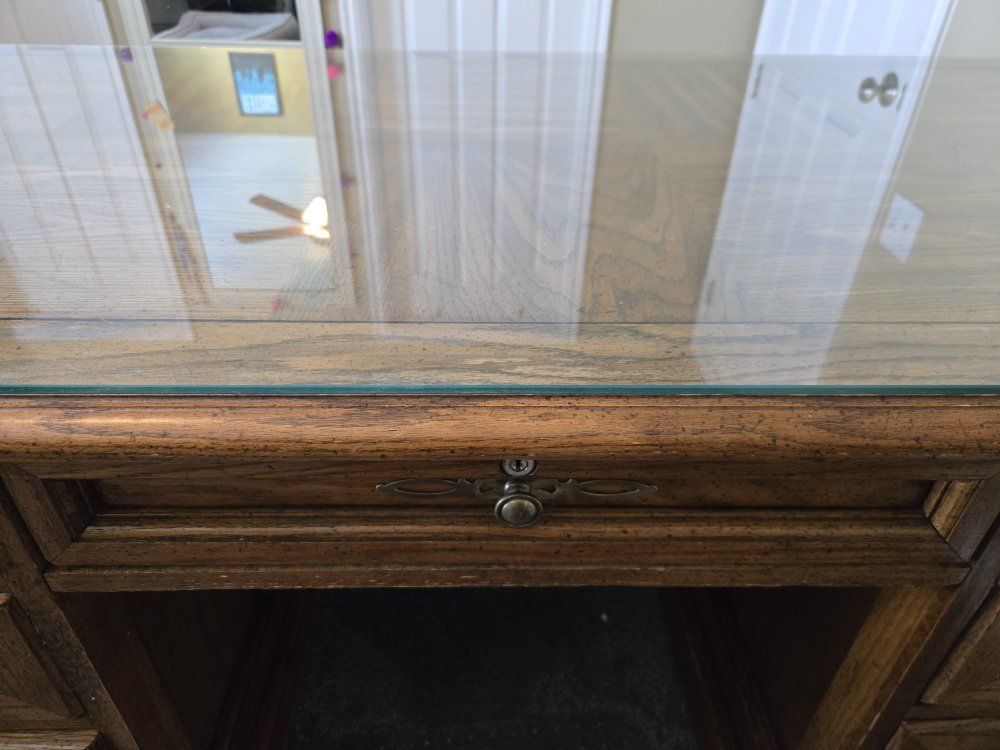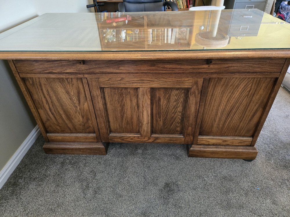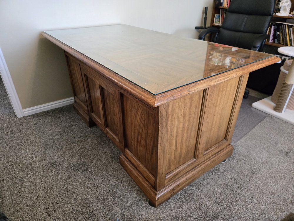 VenmoSelling an older executive desk. It's a high quality solid wood desk with a glass top but it does show signs of wear and tear. $100 obo.