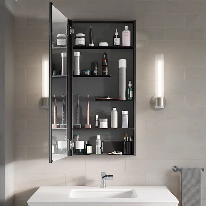 Inside, the cabinet features KOHLER's signature staggered shelving system, which accommodates both tall and short items without wasted space. The large mirrored interior doubles as a secondary reflective surface, making it easier to view items stored toward the back. The single-door design swings open smoothly and includes a full-length mirror on the door exterior.