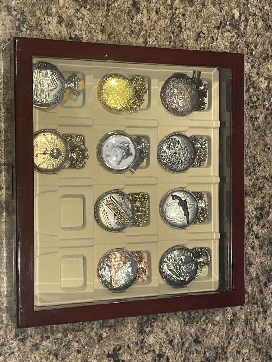 ApplePayThis lot includes 10 quartz pocket watches with display case, and mixed metal colors such as silver, rose gold, and yellow gold. Each pocket watch features a full hunter closure, solid caseback, and a 12-hour dial with no hour marks. The watches are designed for unisex adults and are not water resistant. Perfect for collectors or jewelry enthusiasts looking for unique timepieces with a touch of elegance and vintage charm. Some need some work. One doesn't have original chain. Missing 2 out of the set. Know 1 for sure works, don't know about the others.