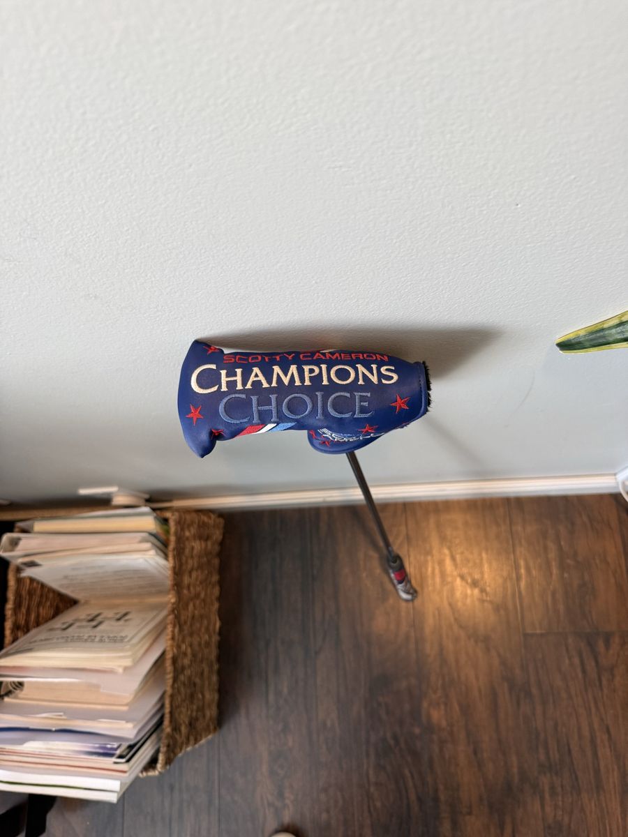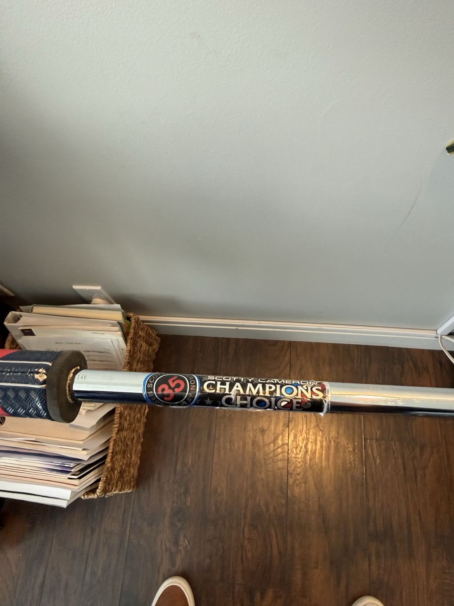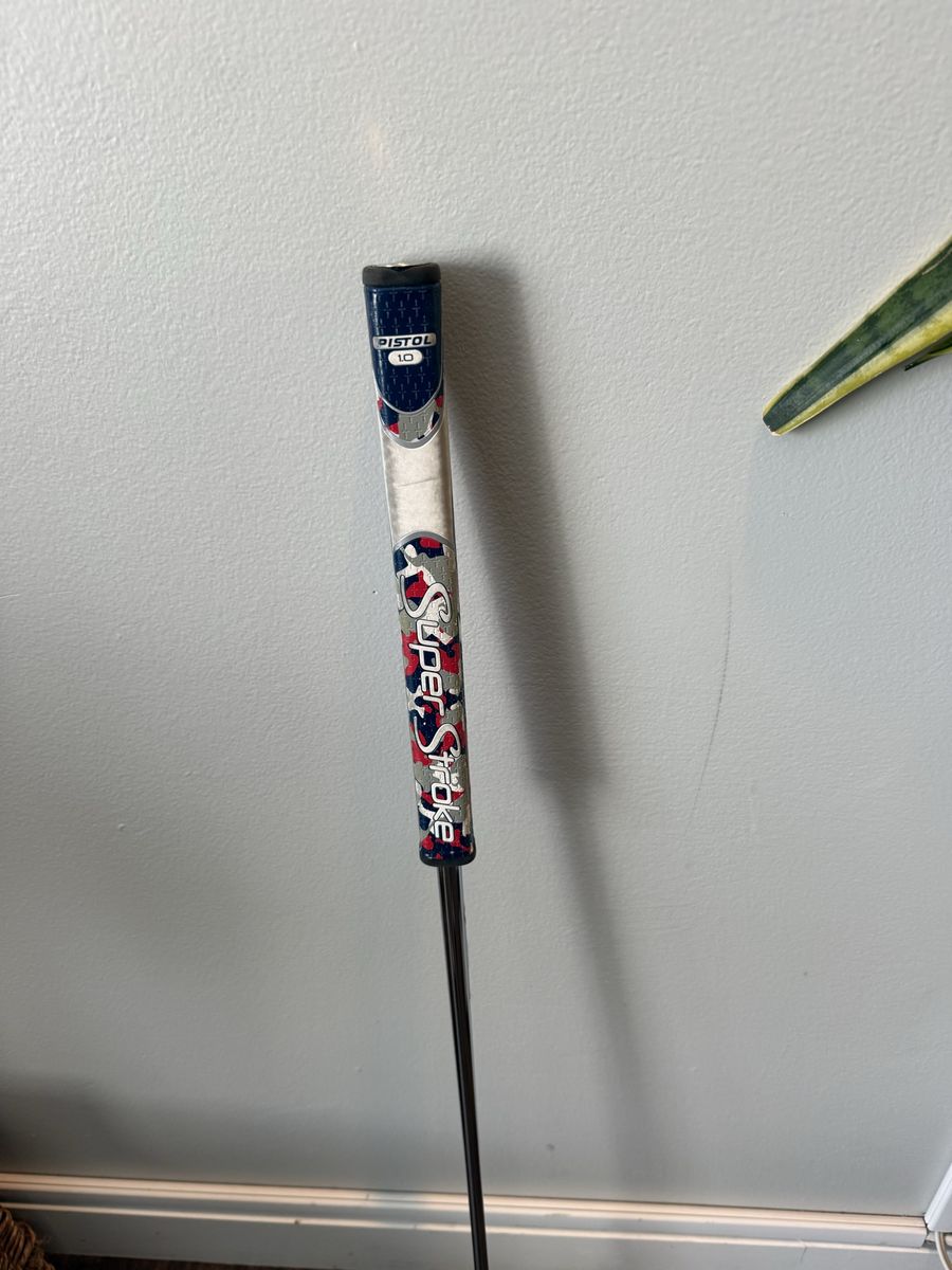 Used Scotty Cameron Newport plus Champions Choice Button Back putter. Great looking putter, listed as a 35 inch shaft but plays more like a 34 to me. Super Stroke Pistol Grip 1.0 in USA color way to match the putter. The grip is about ready to be replaced but is still just fine.
